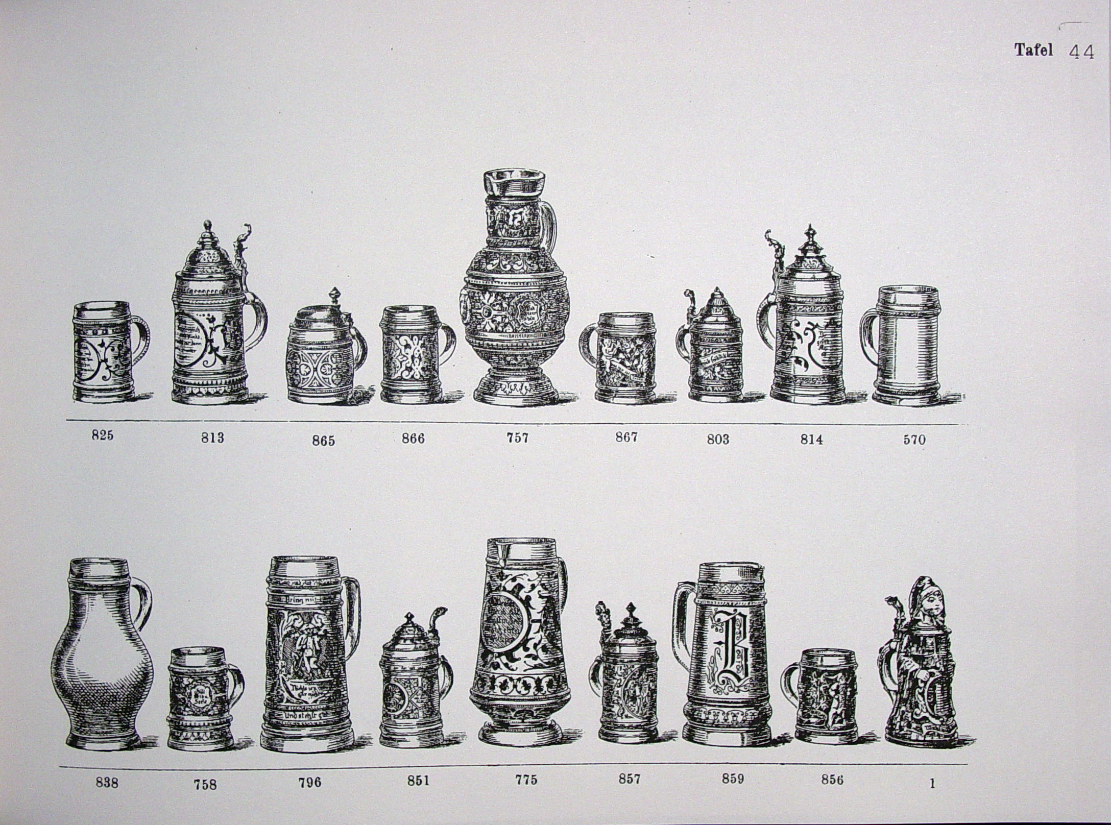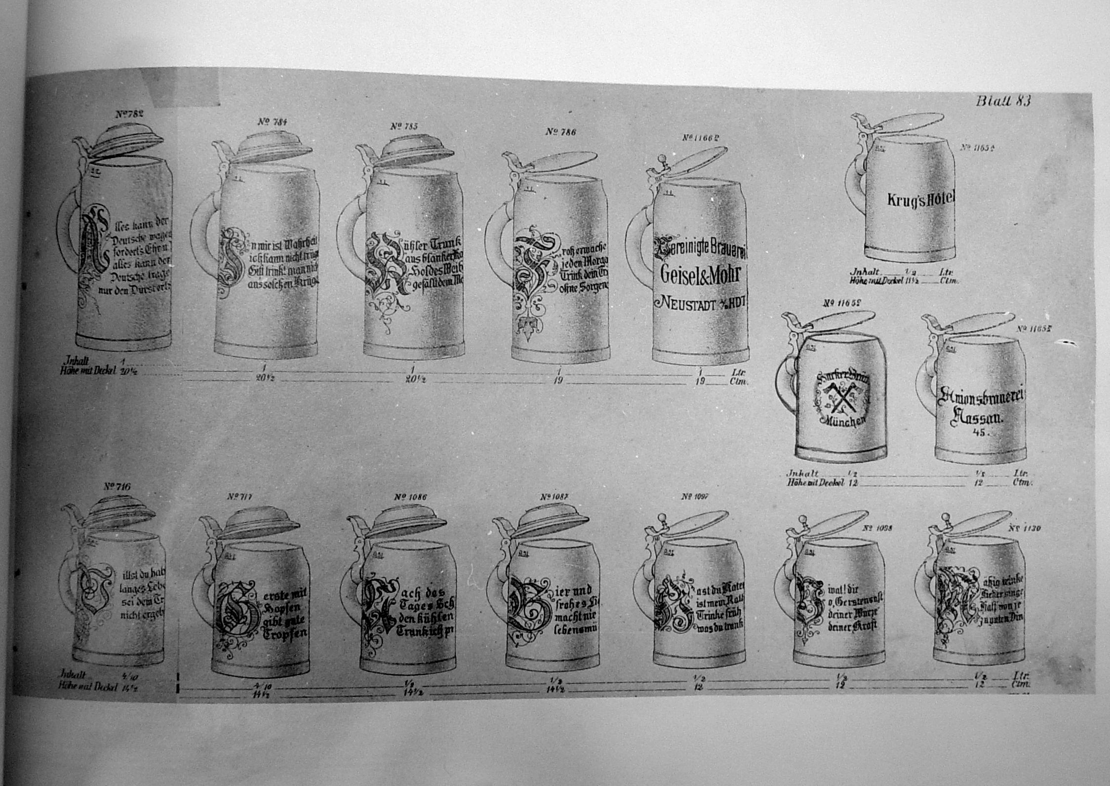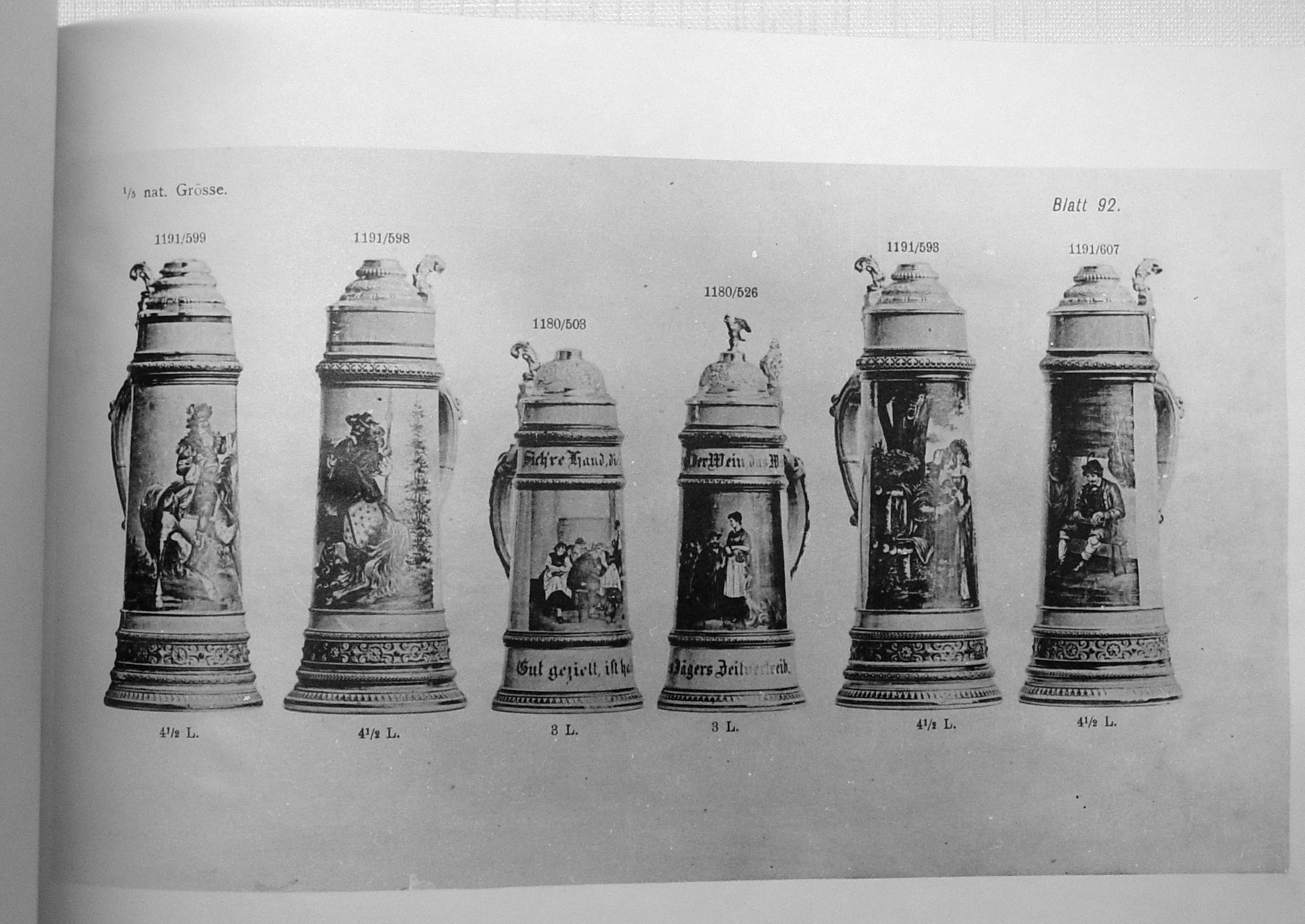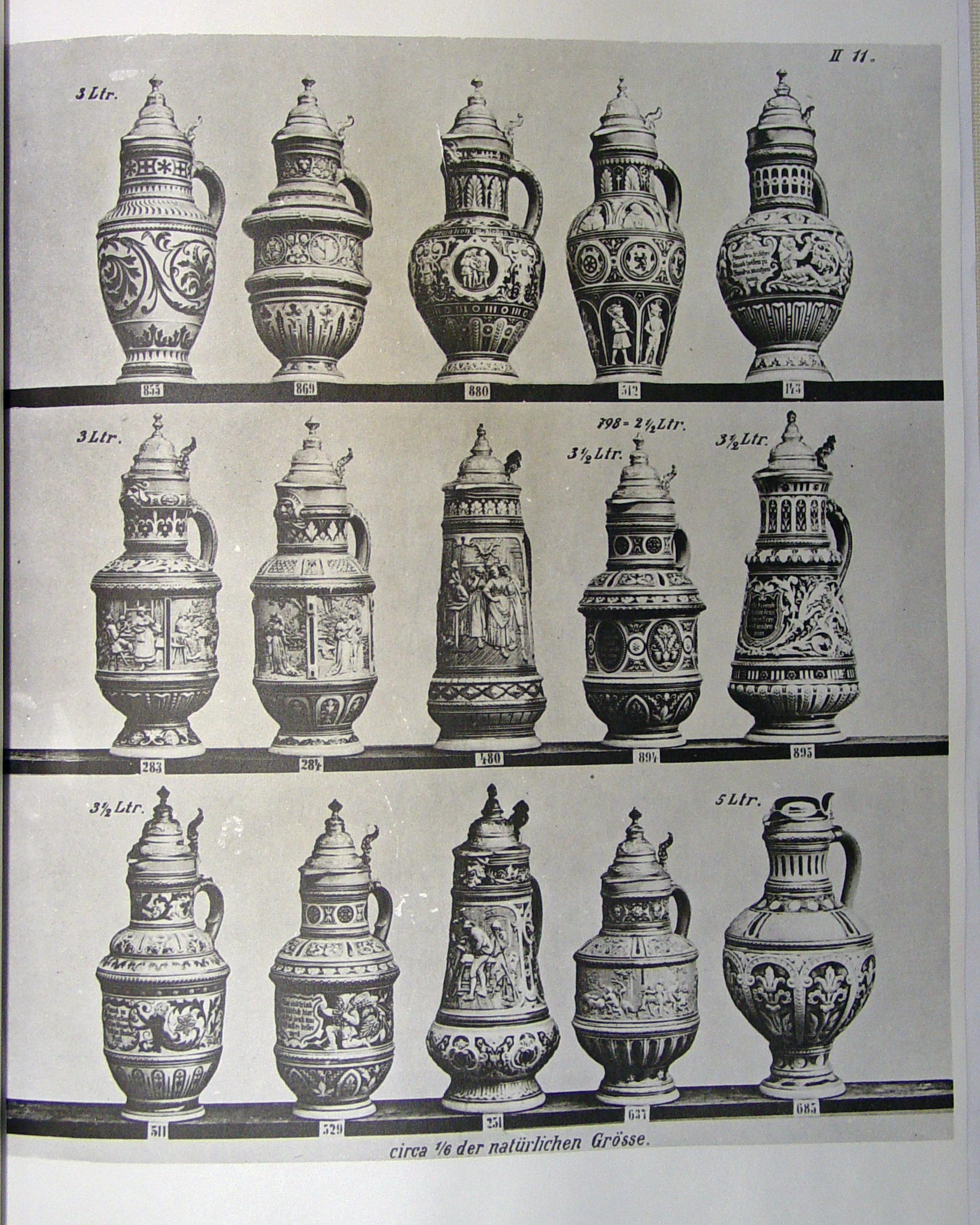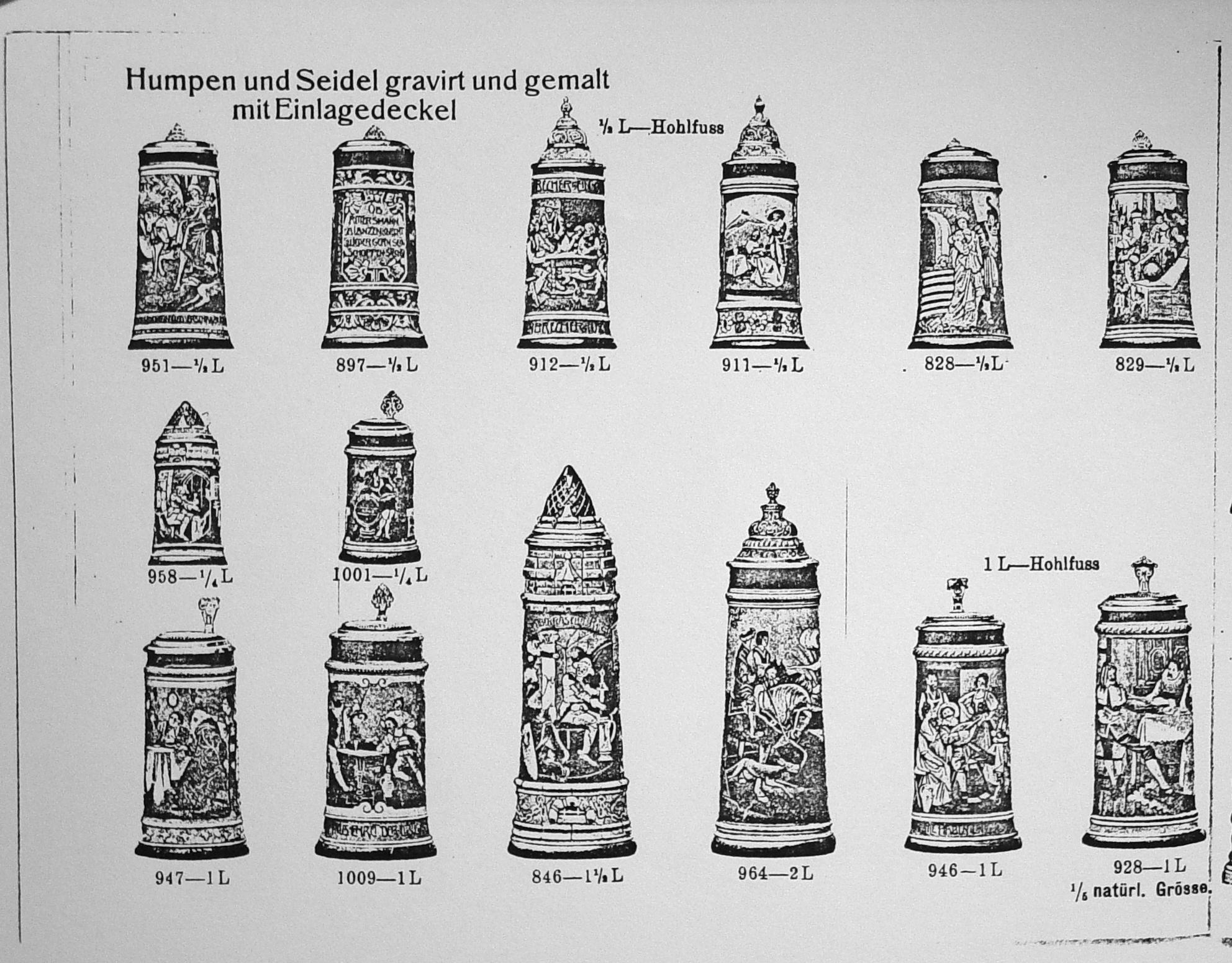 Who made this stein? Using available original manufacturers catalogs, this page allows you to look up possible answers to that question. Mold numbers beginning with 1 and ranging into the thousands appear in the first column below. For each mold number, the manufacturers who produced an item with that number are listed, along with a link to an original catalog page showing that item. Scroll down to the mold number in question, then examine the catalog pages to confirm the manufacturer of your stein.