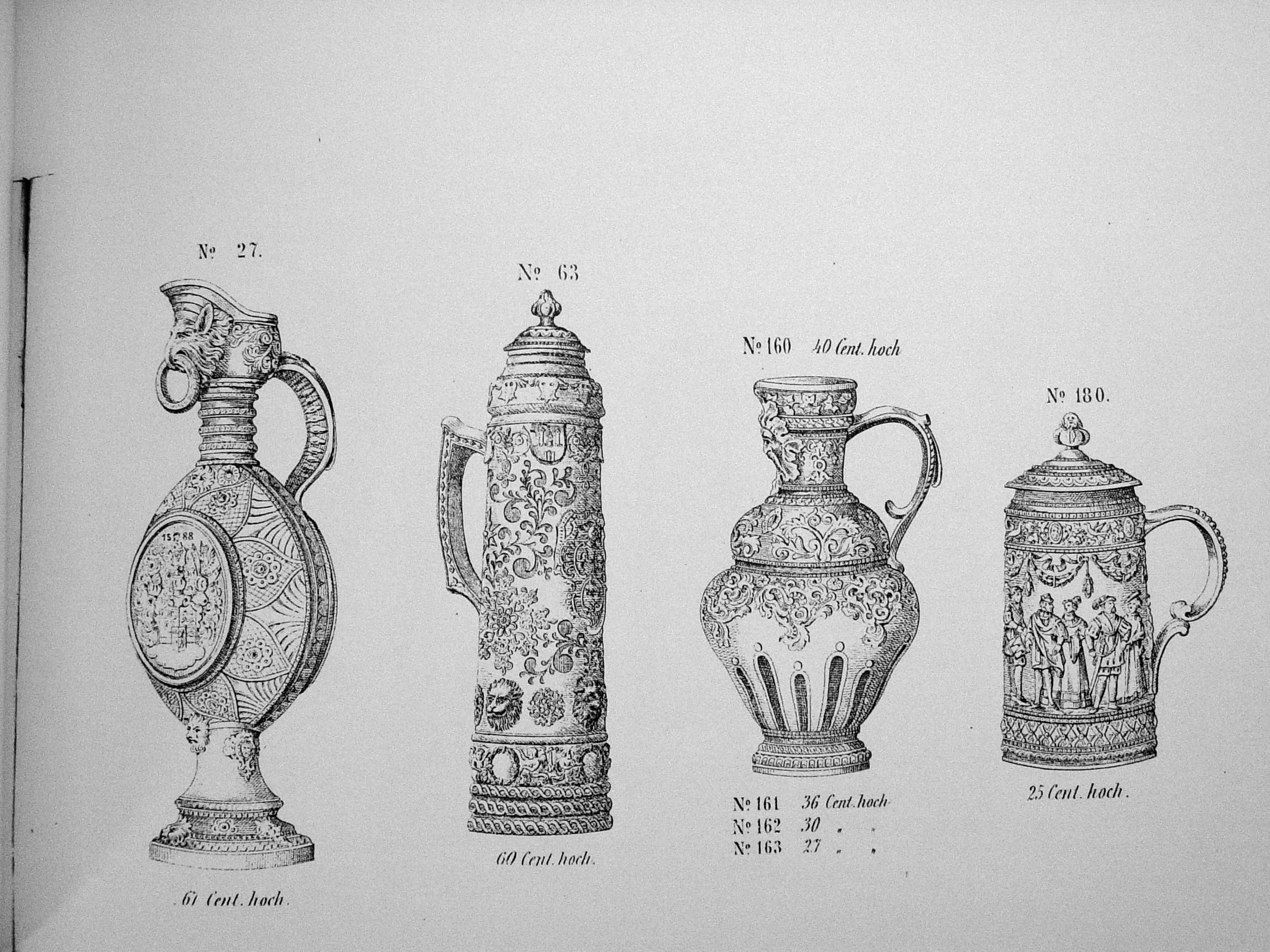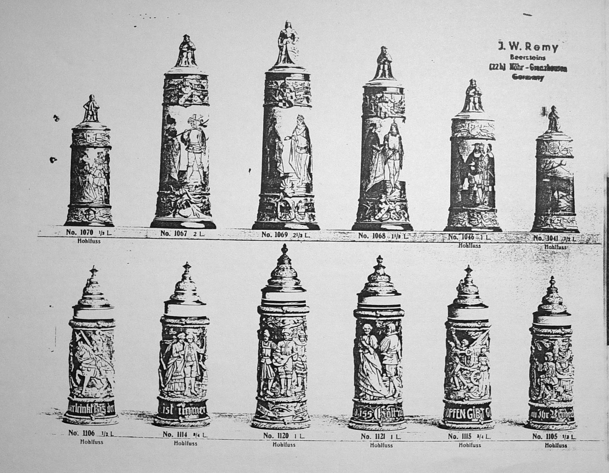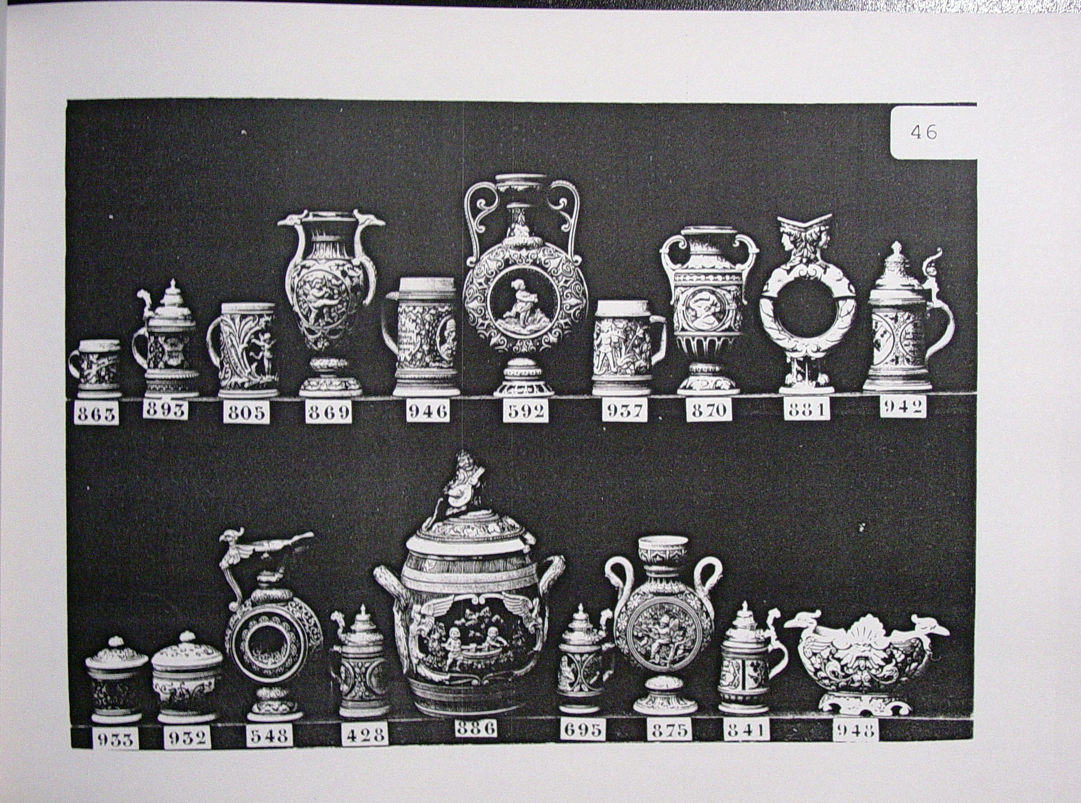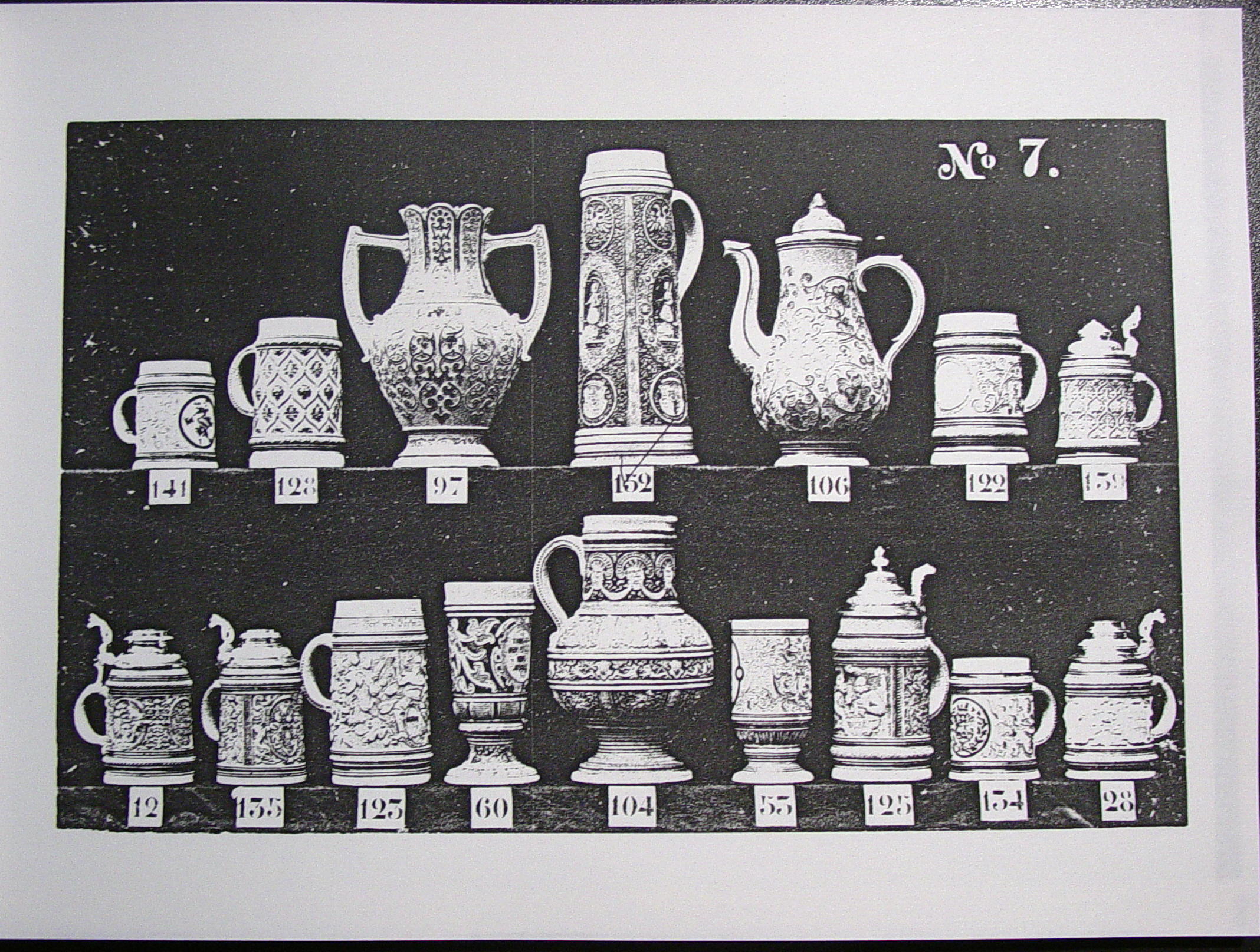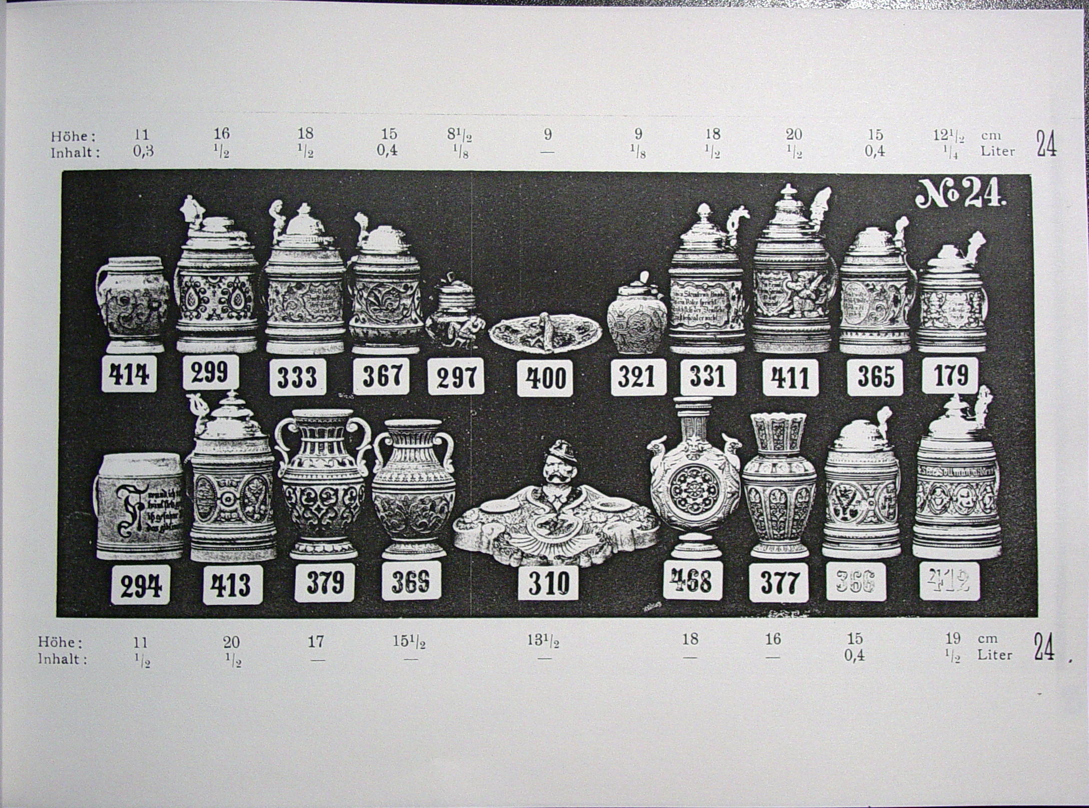 Who made this stein? Using available original manufacturers catalogs, this page allows you to look up possible answers to that question. Mold numbers beginning with 1 and ranging into the thousands appear in the first column below. For each mold number, the manufacturers who produced an item with that number are listed, along with a link to an original catalog page showing that item. Scroll down to the mold number in question, then examine the catalog pages to confirm the manufacturer of your stein.