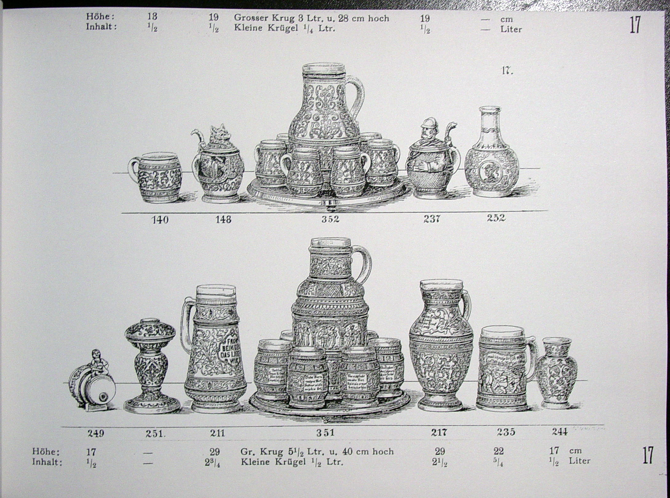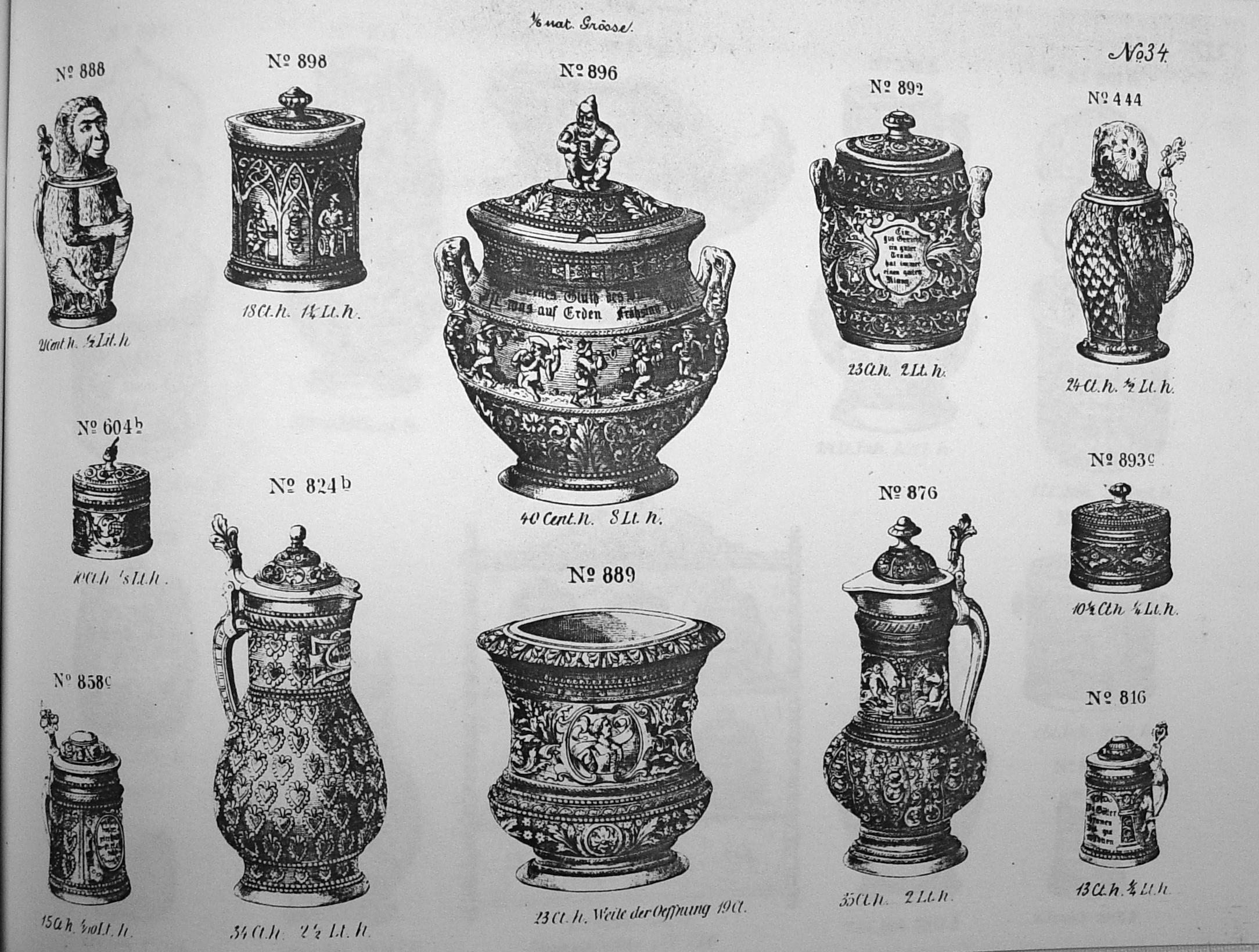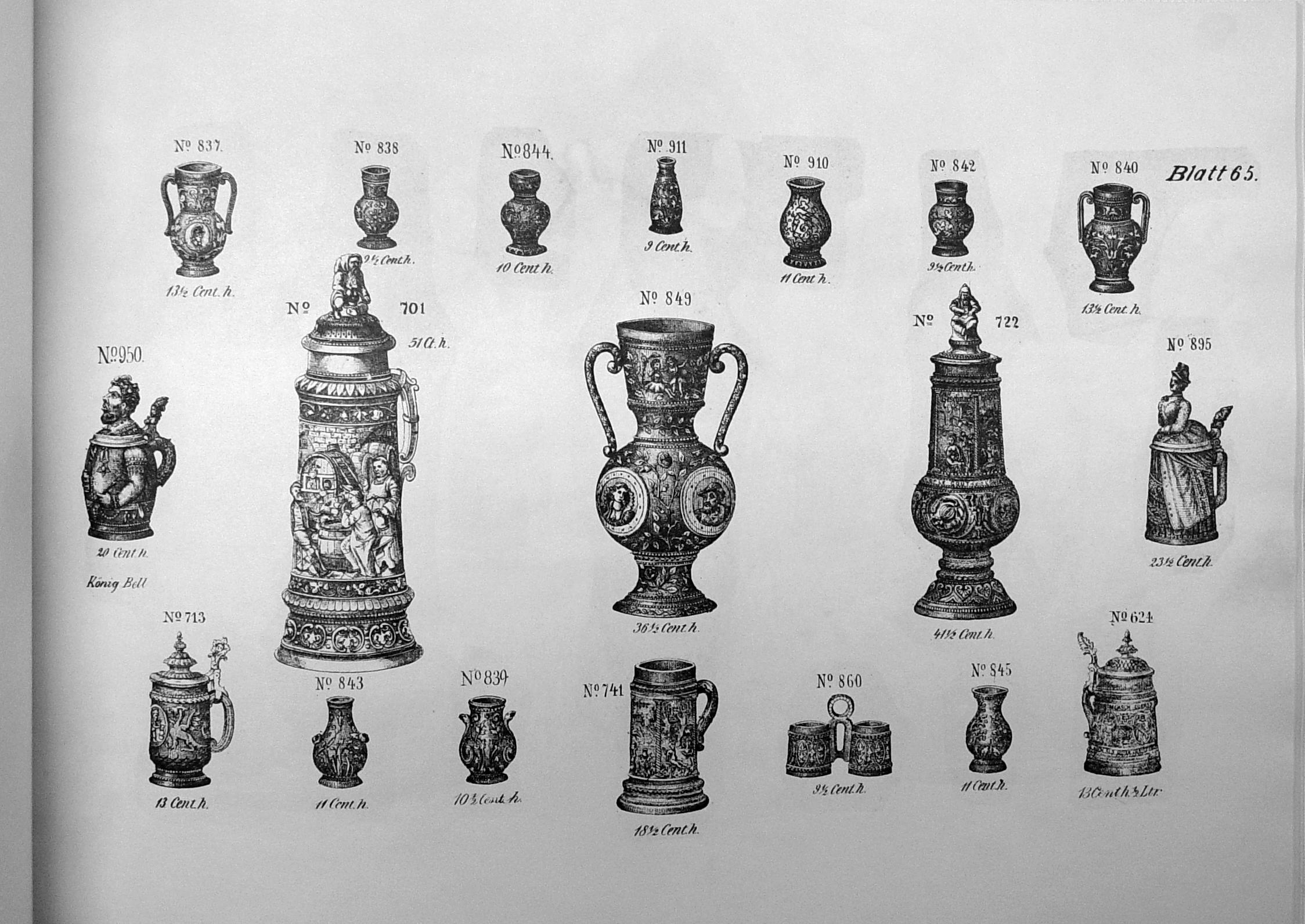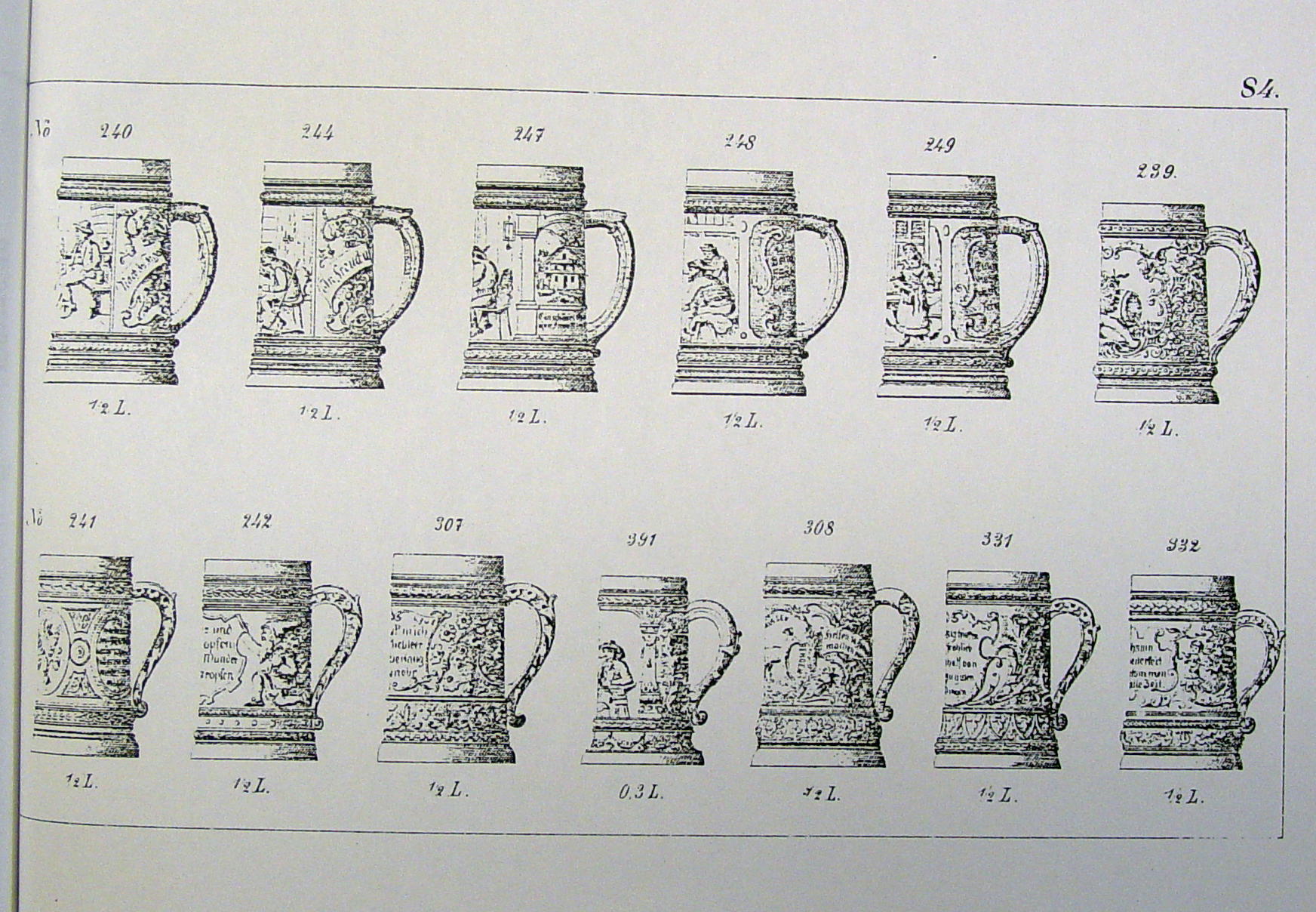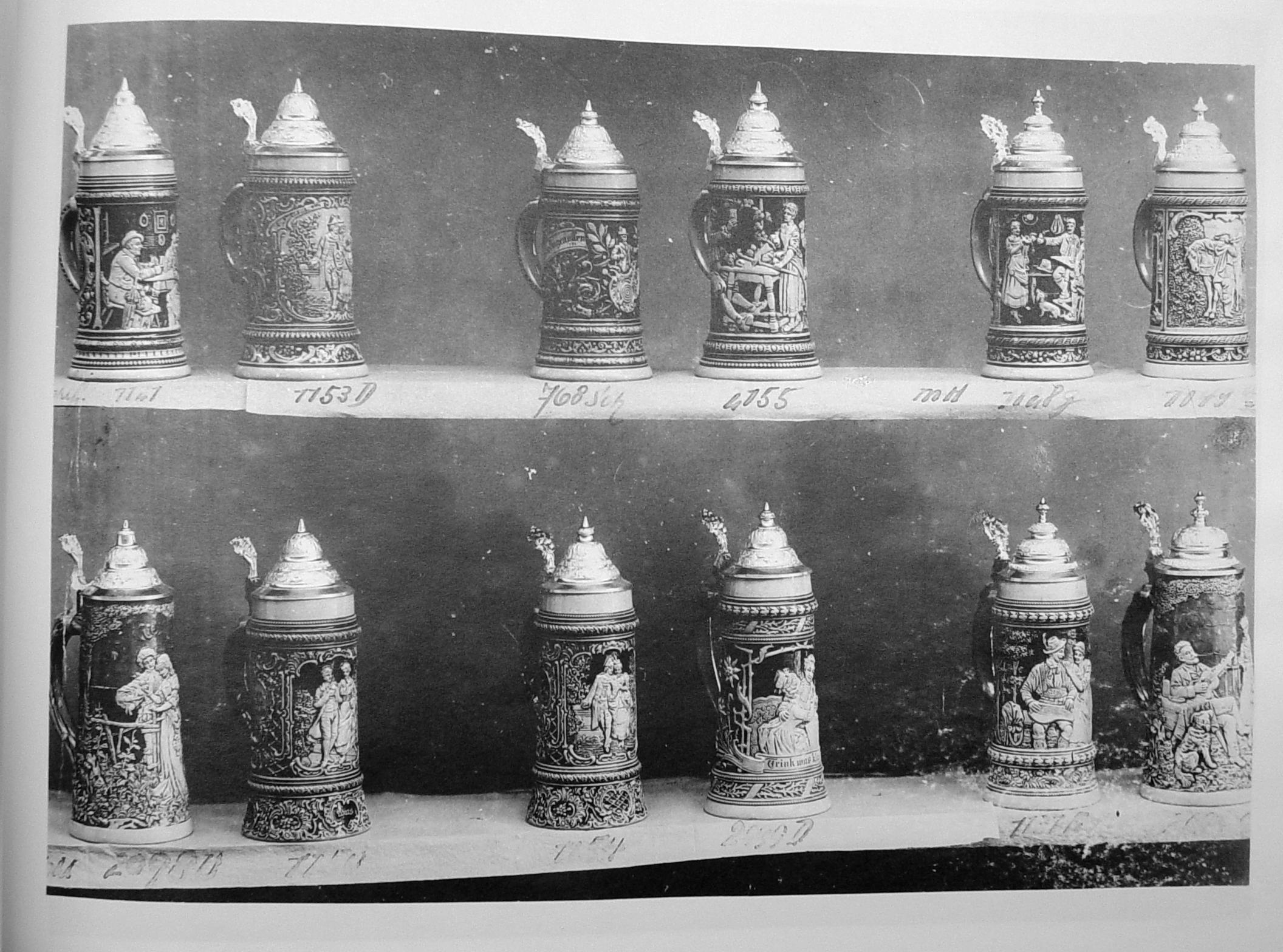 Who made this stein? Using available original manufacturers catalogs, this page allows you to look up possible answers to that question. Mold numbers beginning with 1 and ranging into the thousands appear in the first column below. For each mold number, the manufacturers who produced an item with that number are listed, along with a link to an original catalog page showing that item. Scroll down to the mold number in question, then examine the catalog pages to confirm the manufacturer of your stein.