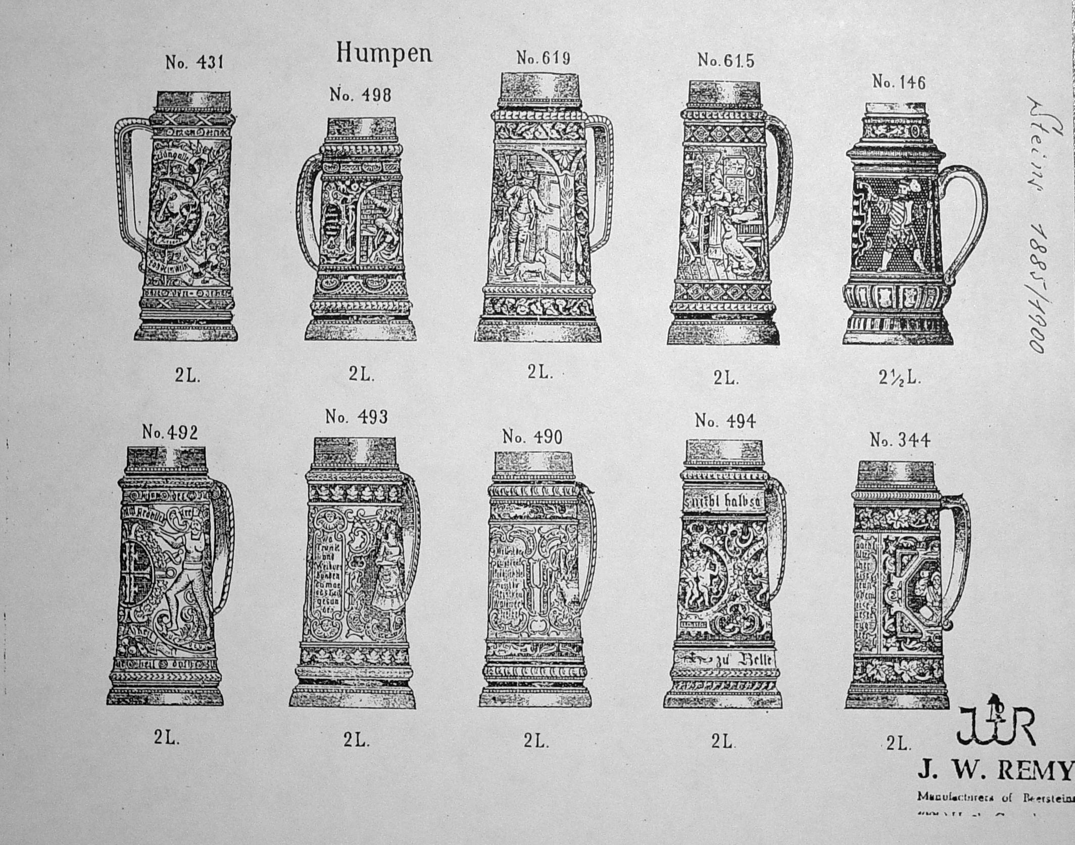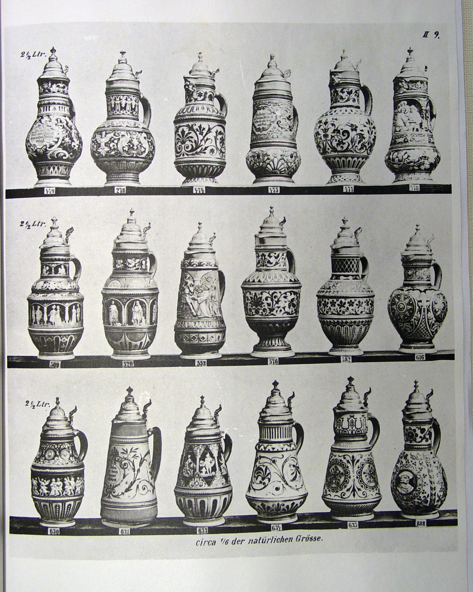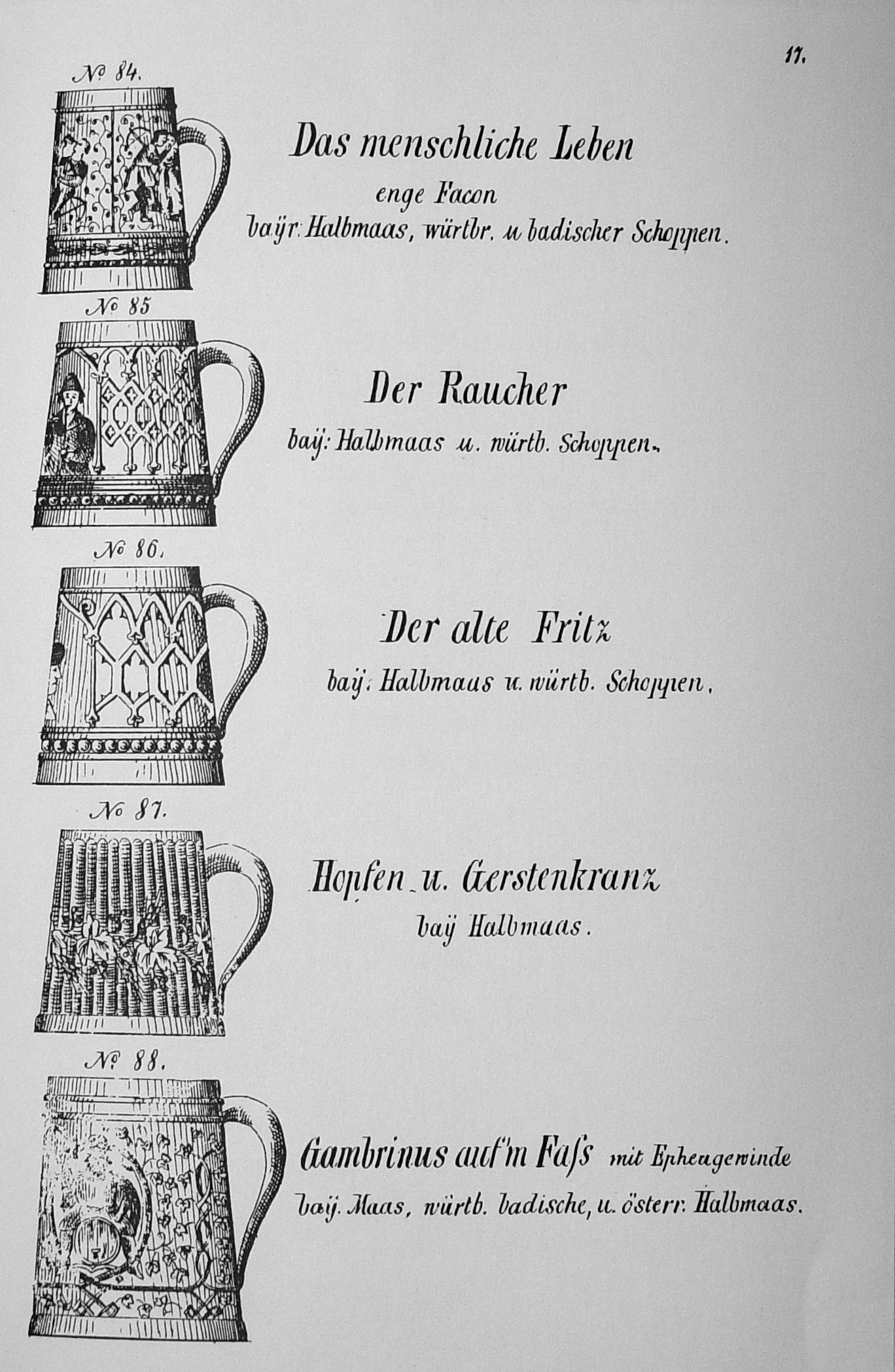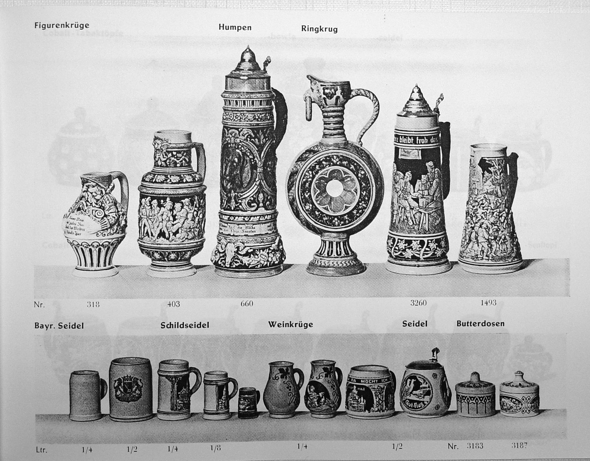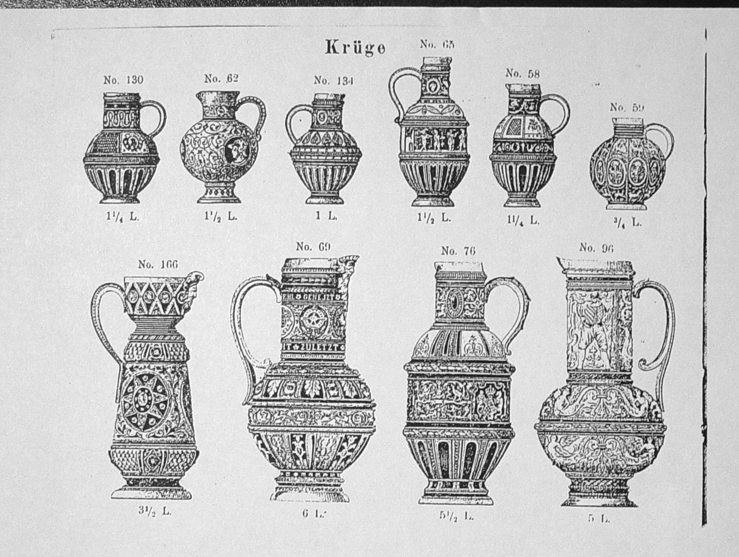 Who made this stein? Using available original manufacturers catalogs, this page allows you to look up possible answers to that question. Mold numbers beginning with 1 and ranging into the thousands appear in the first column below. For each mold number, the manufacturers who produced an item with that number are listed, along with a link to an original catalog page showing that item. Scroll down to the mold number in question, then examine the catalog pages to confirm the manufacturer of your stein.