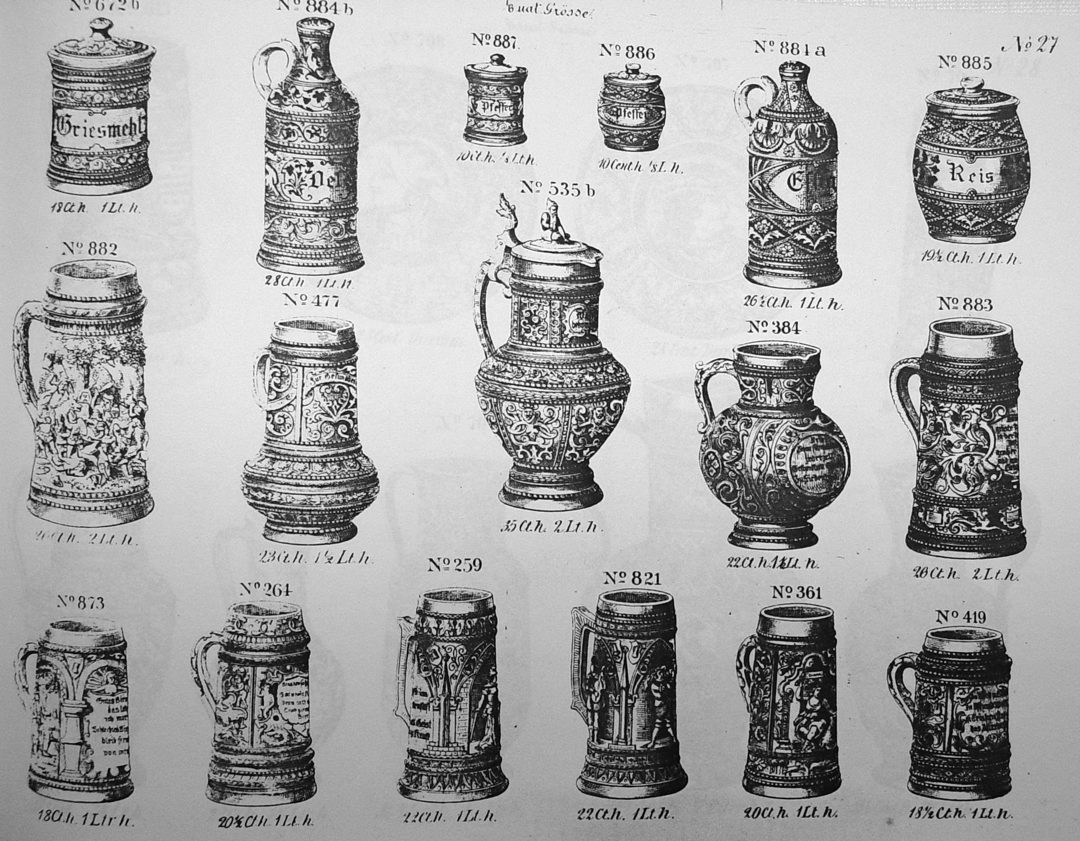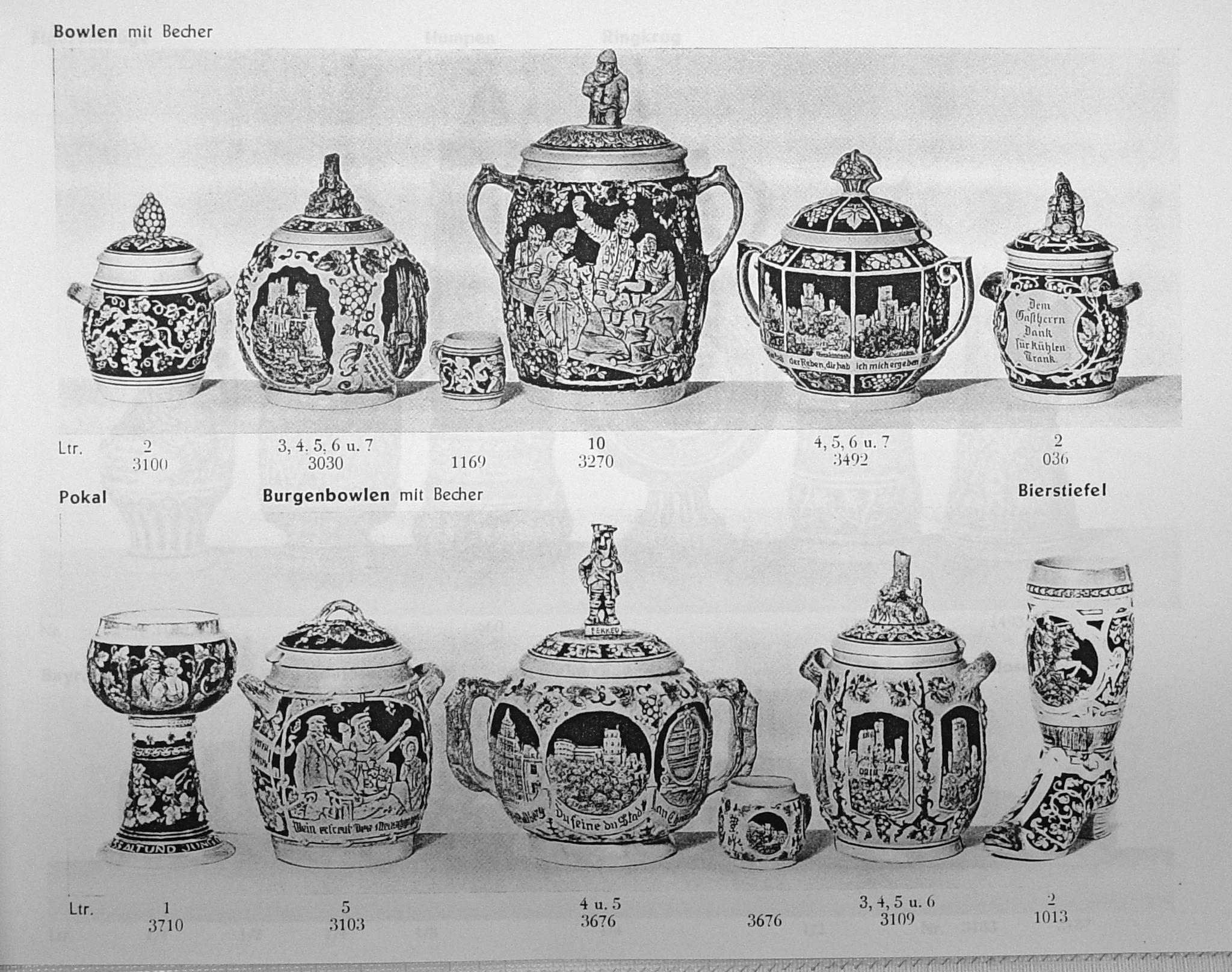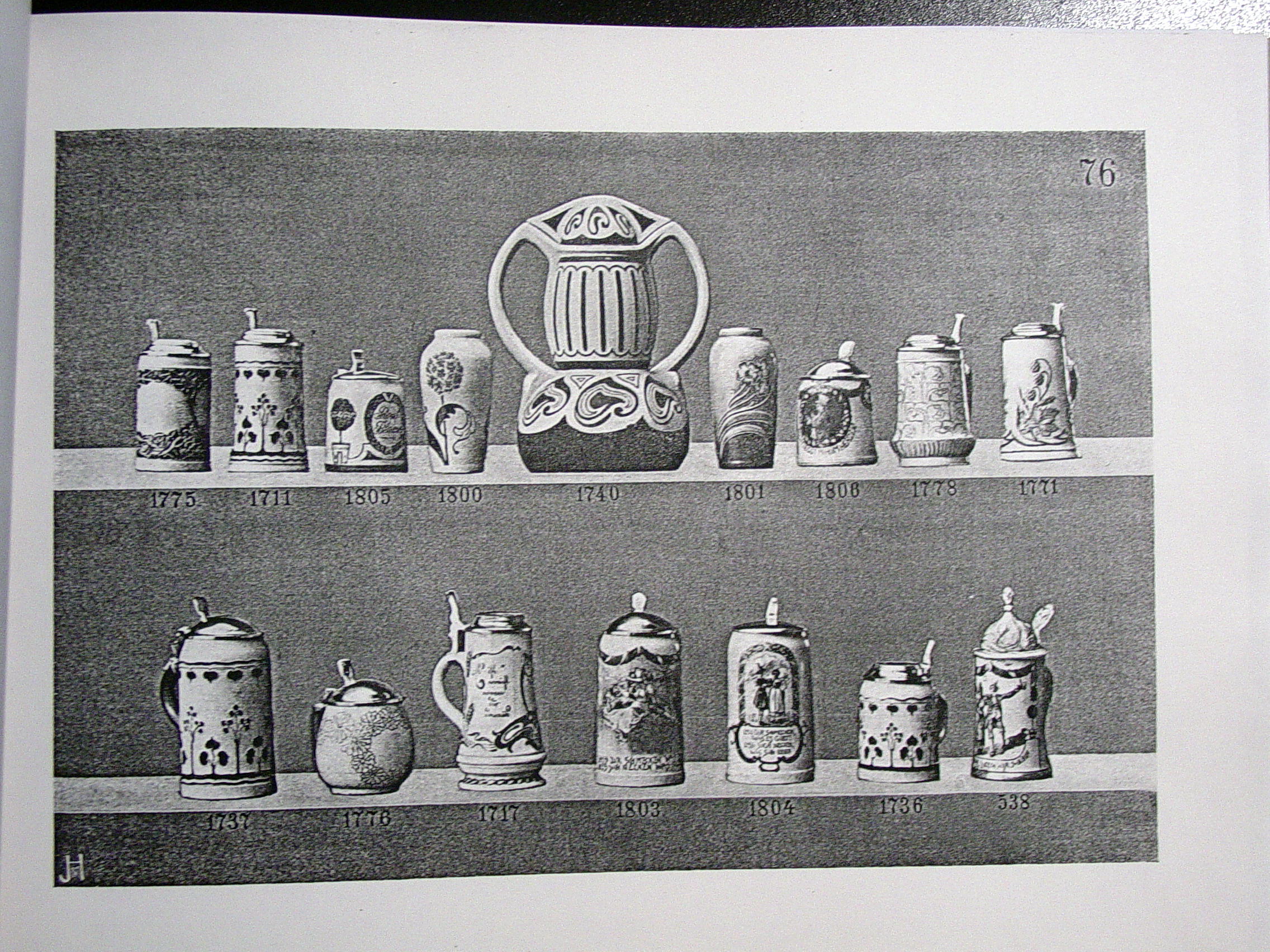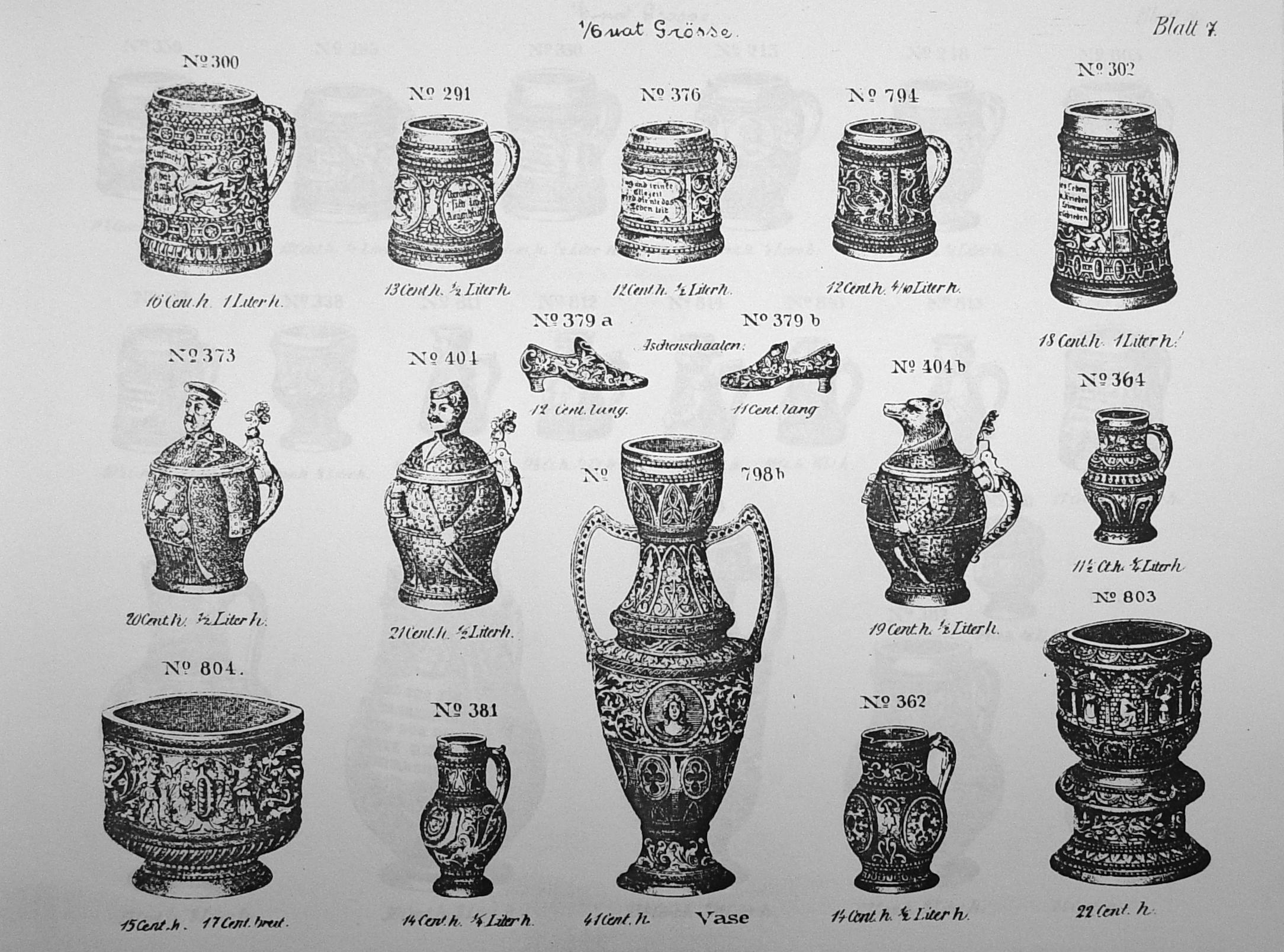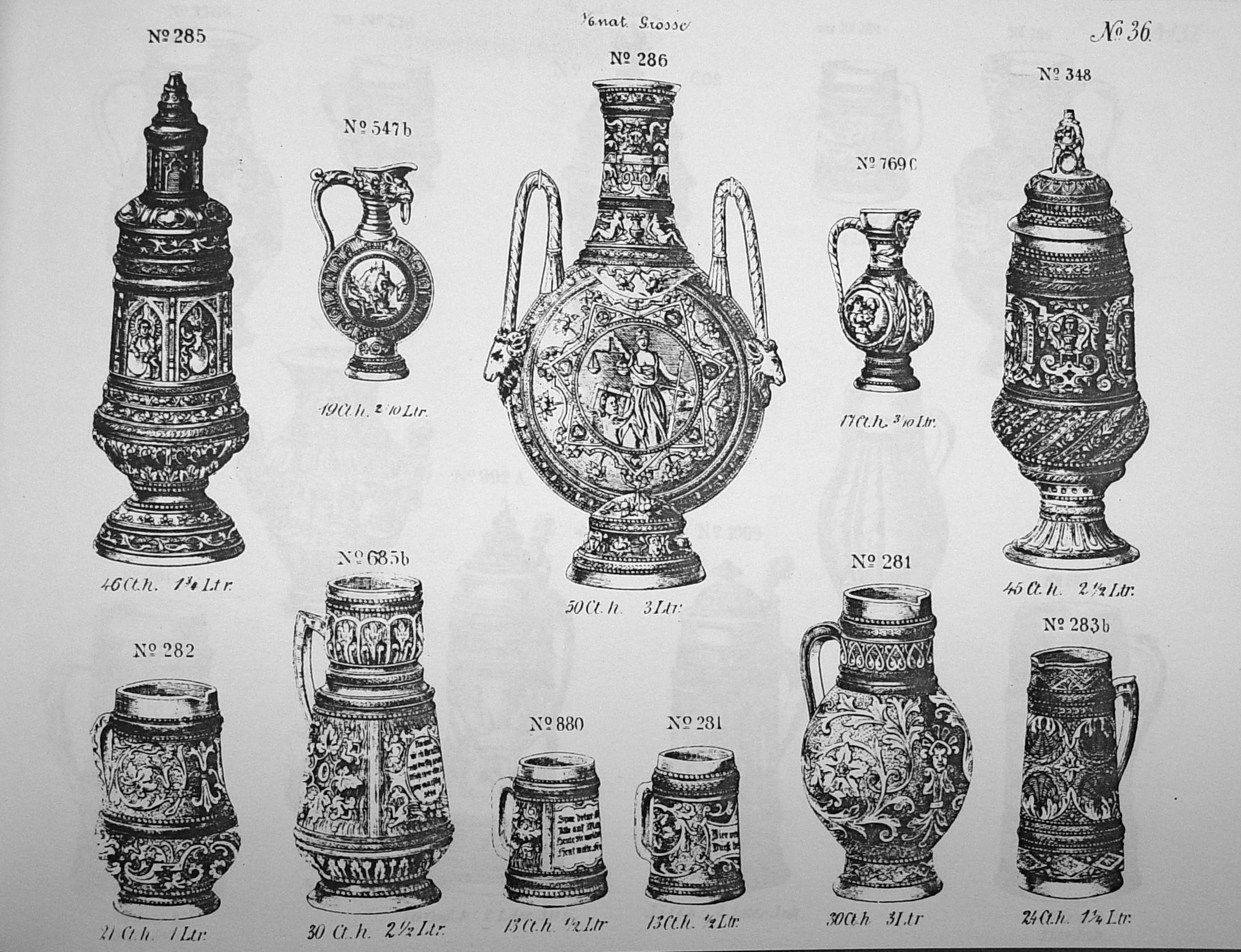 Who made this stein? Using available original manufacturers catalogs, this page allows you to look up possible answers to that question. Mold numbers beginning with 1 and ranging into the thousands appear in the first column below. For each mold number, the manufacturers who produced an item with that number are listed, along with a link to an original catalog page showing that item. Scroll down to the mold number in question, then examine the catalog pages to confirm the manufacturer of your stein.
