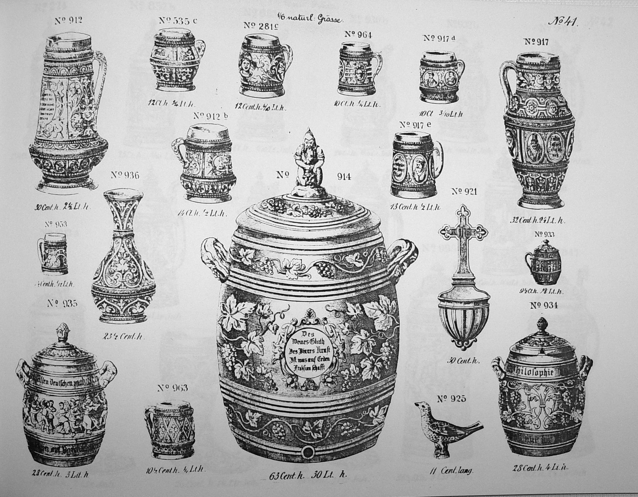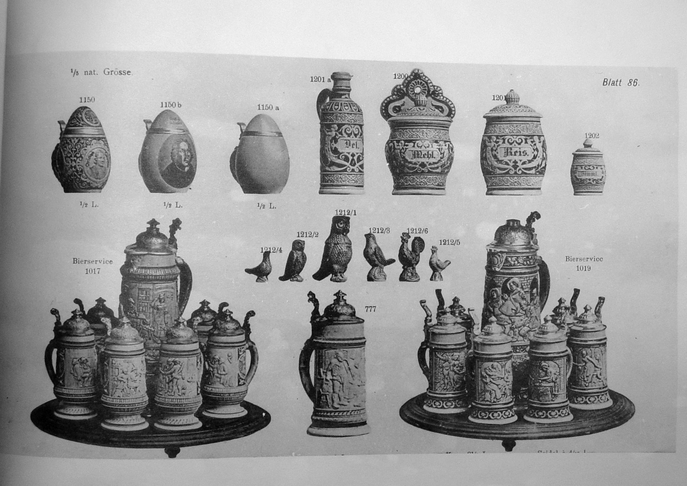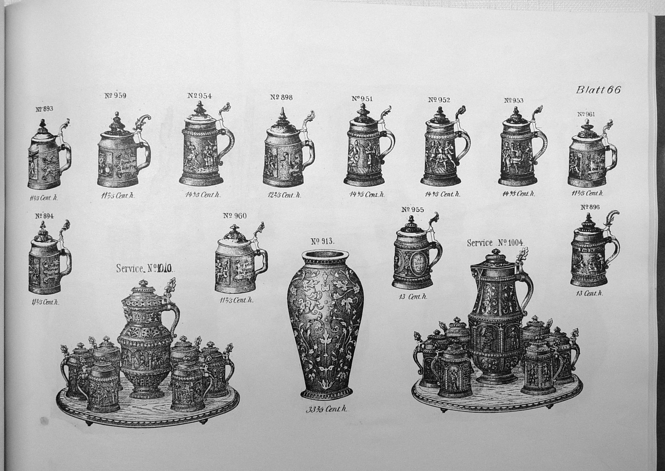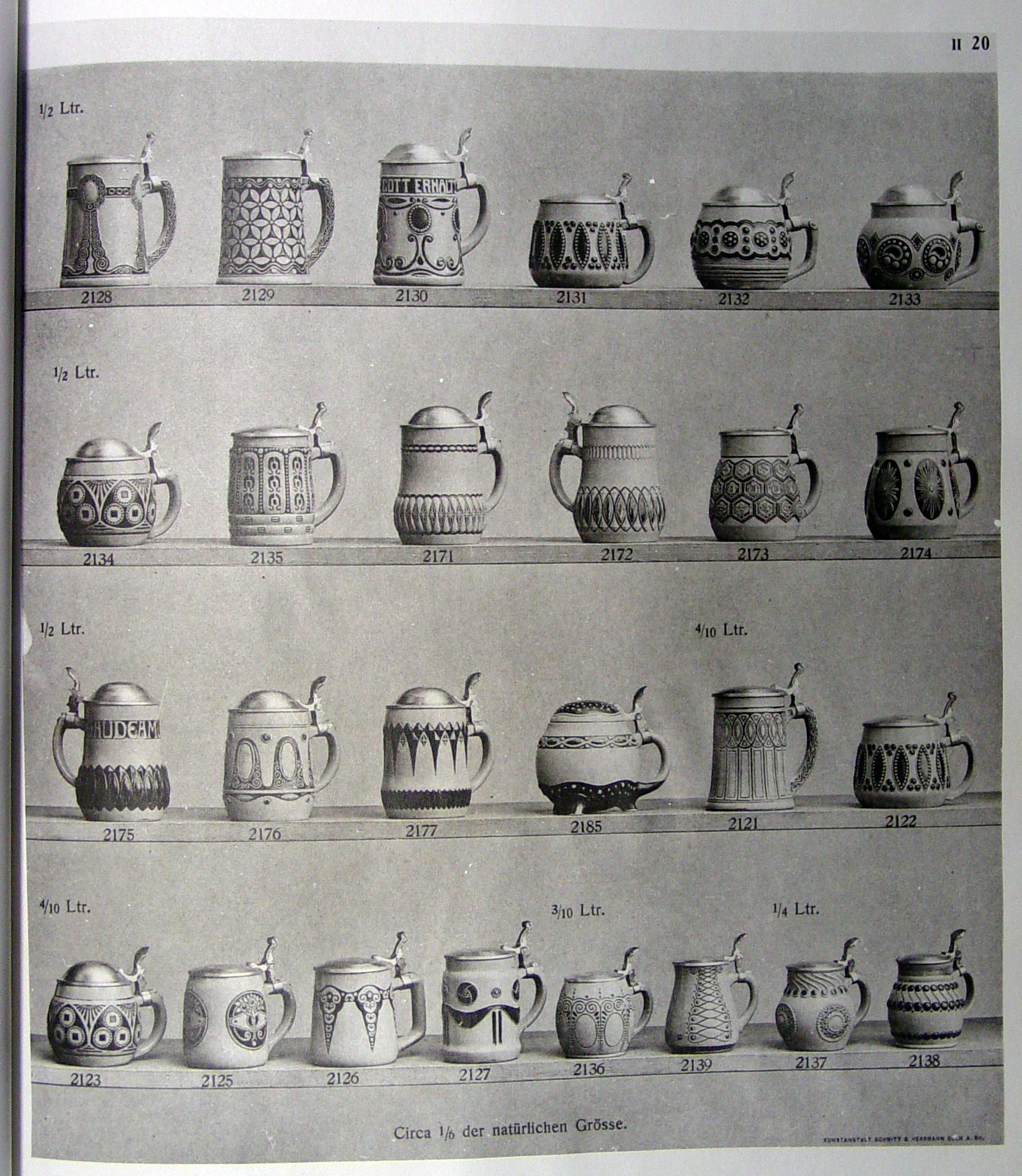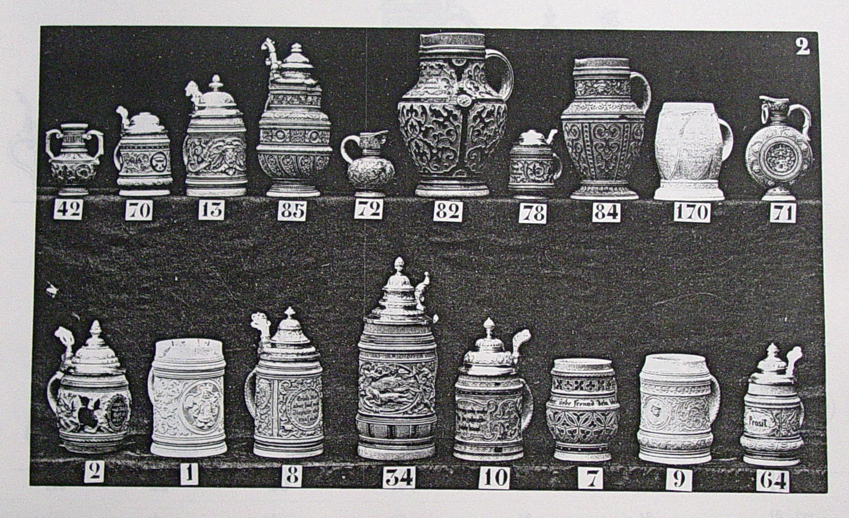 Who made this stein? Using available original manufacturers catalogs, this page allows you to look up possible answers to that question. Mold numbers beginning with 1 and ranging into the thousands appear in the first column below. For each mold number, the manufacturers who produced an item with that number are listed, along with a link to an original catalog page showing that item. Scroll down to the mold number in question, then examine the catalog pages to confirm the manufacturer of your stein.