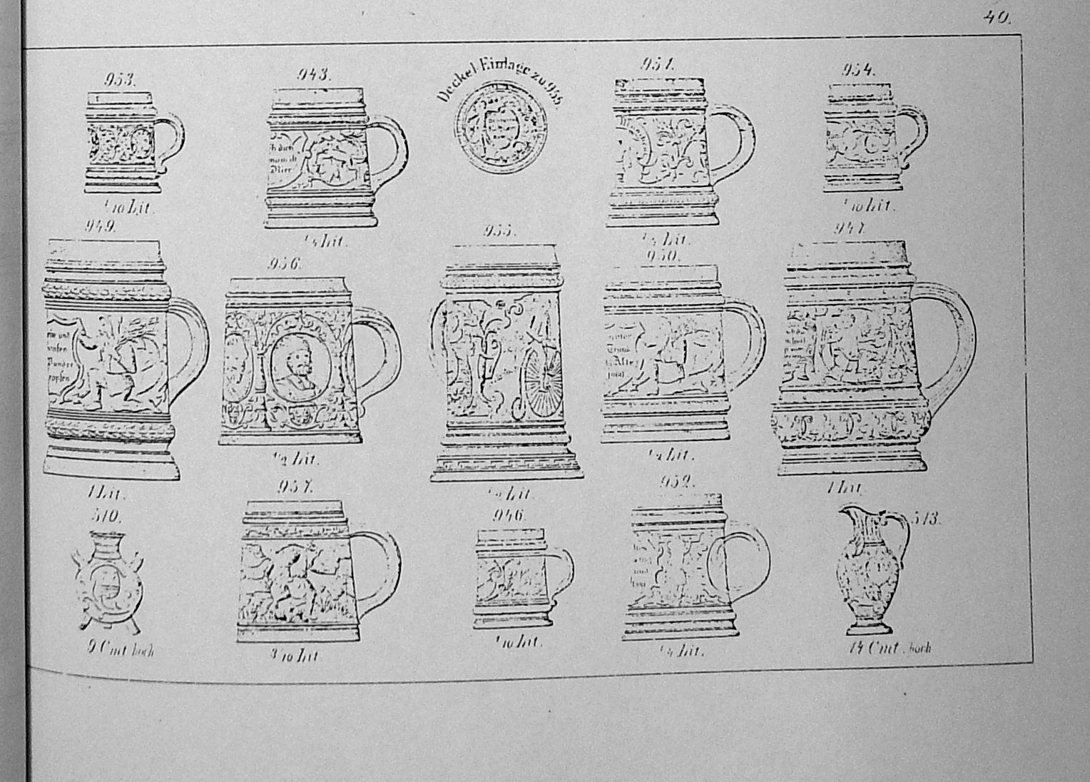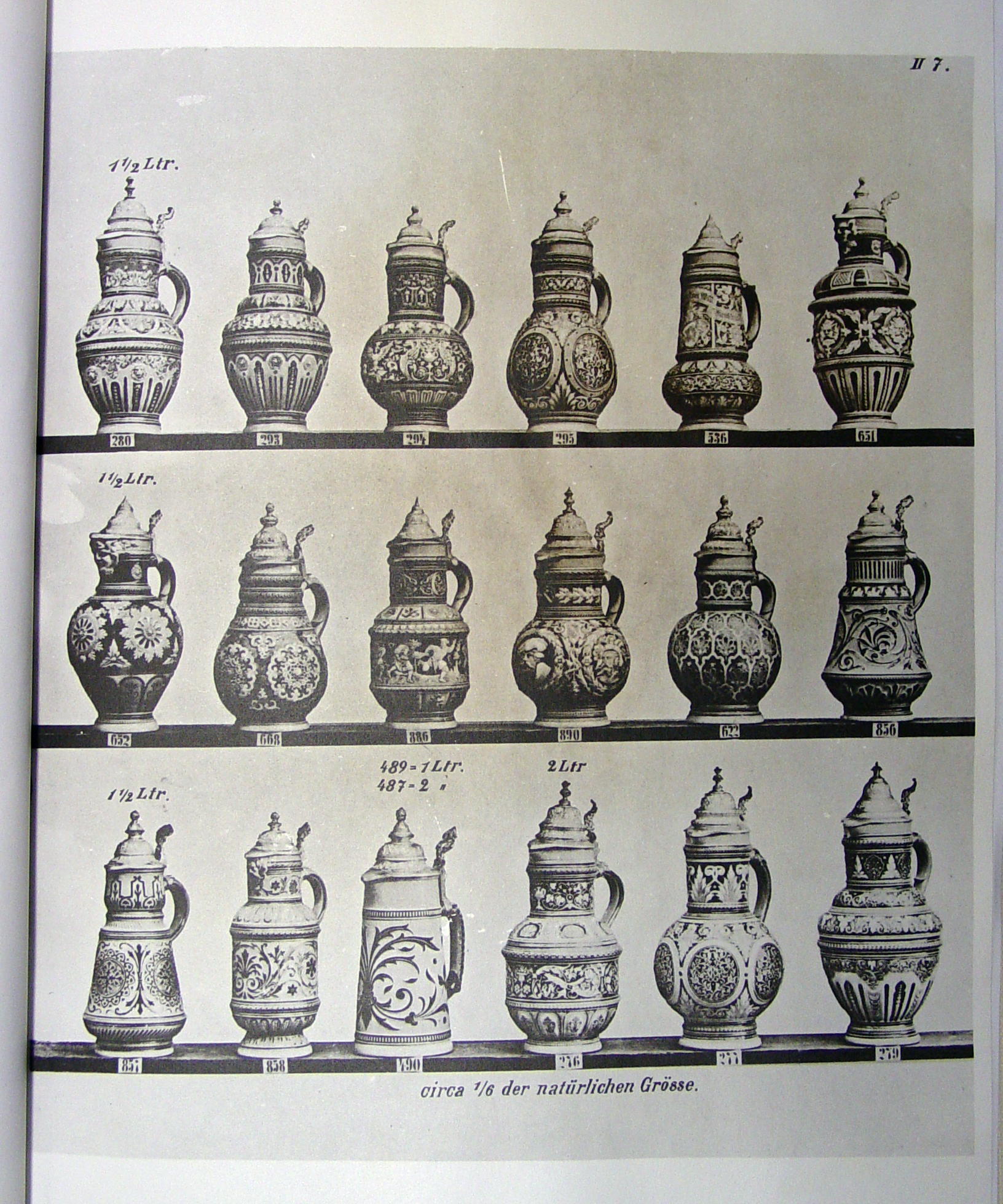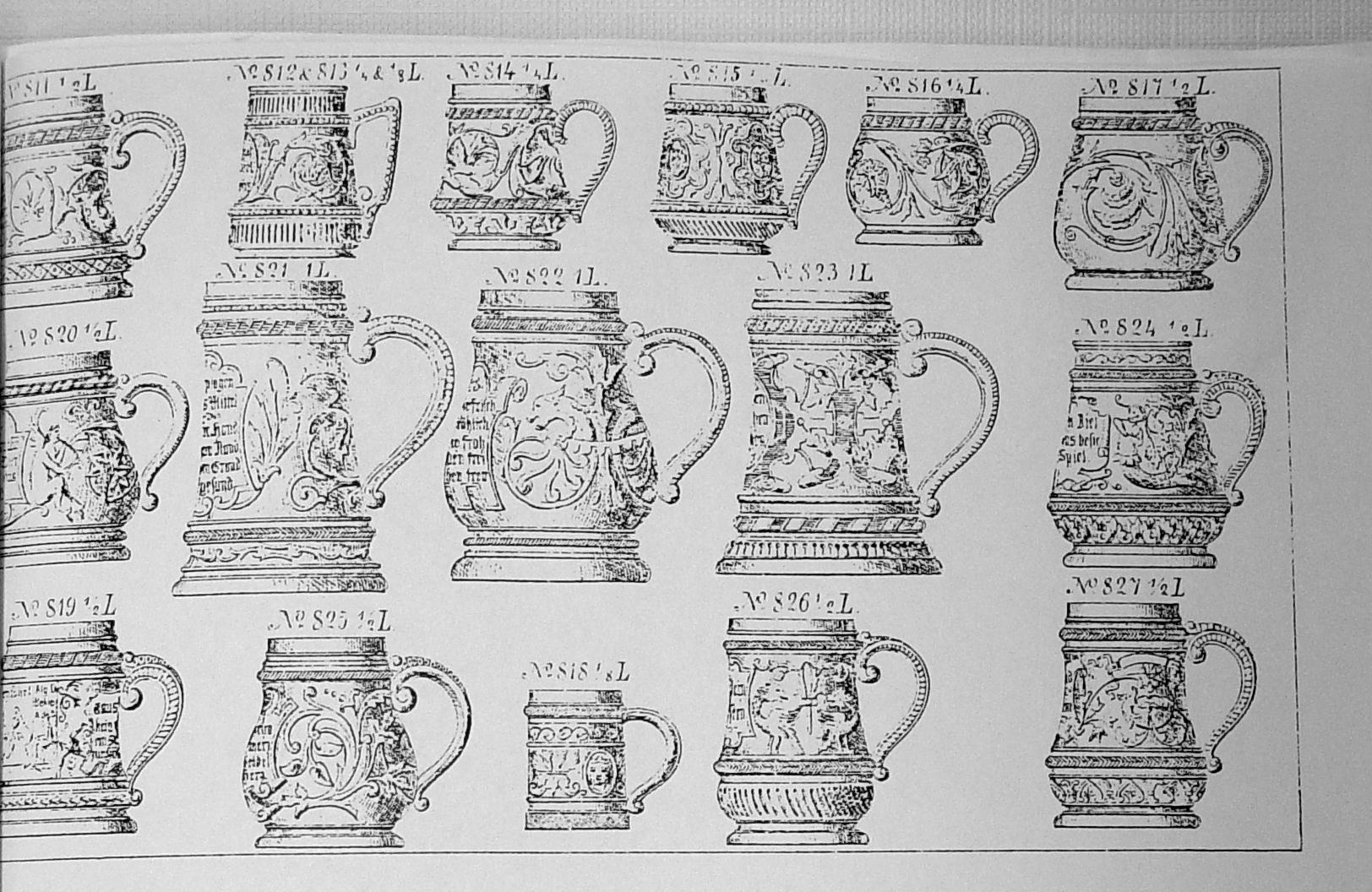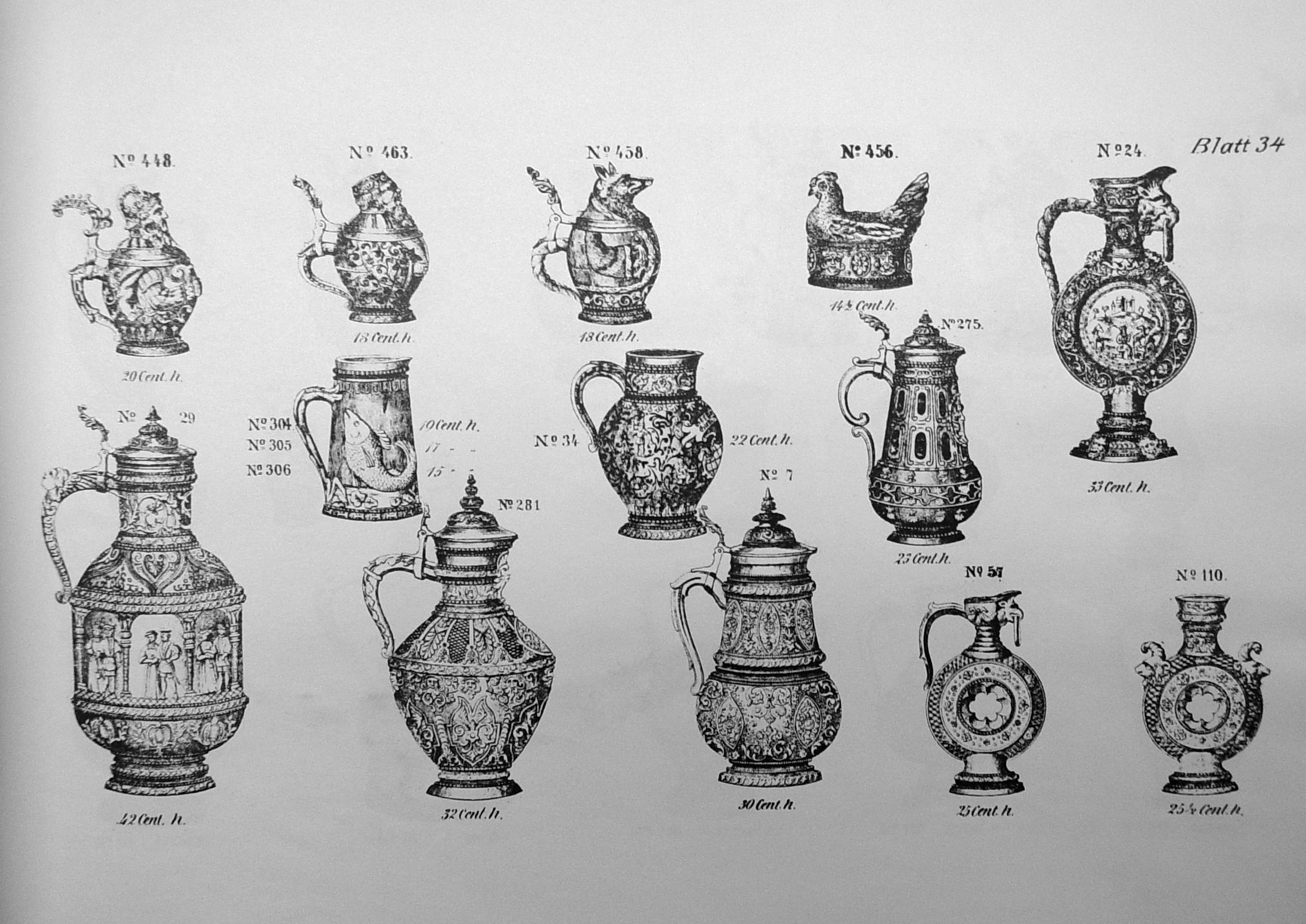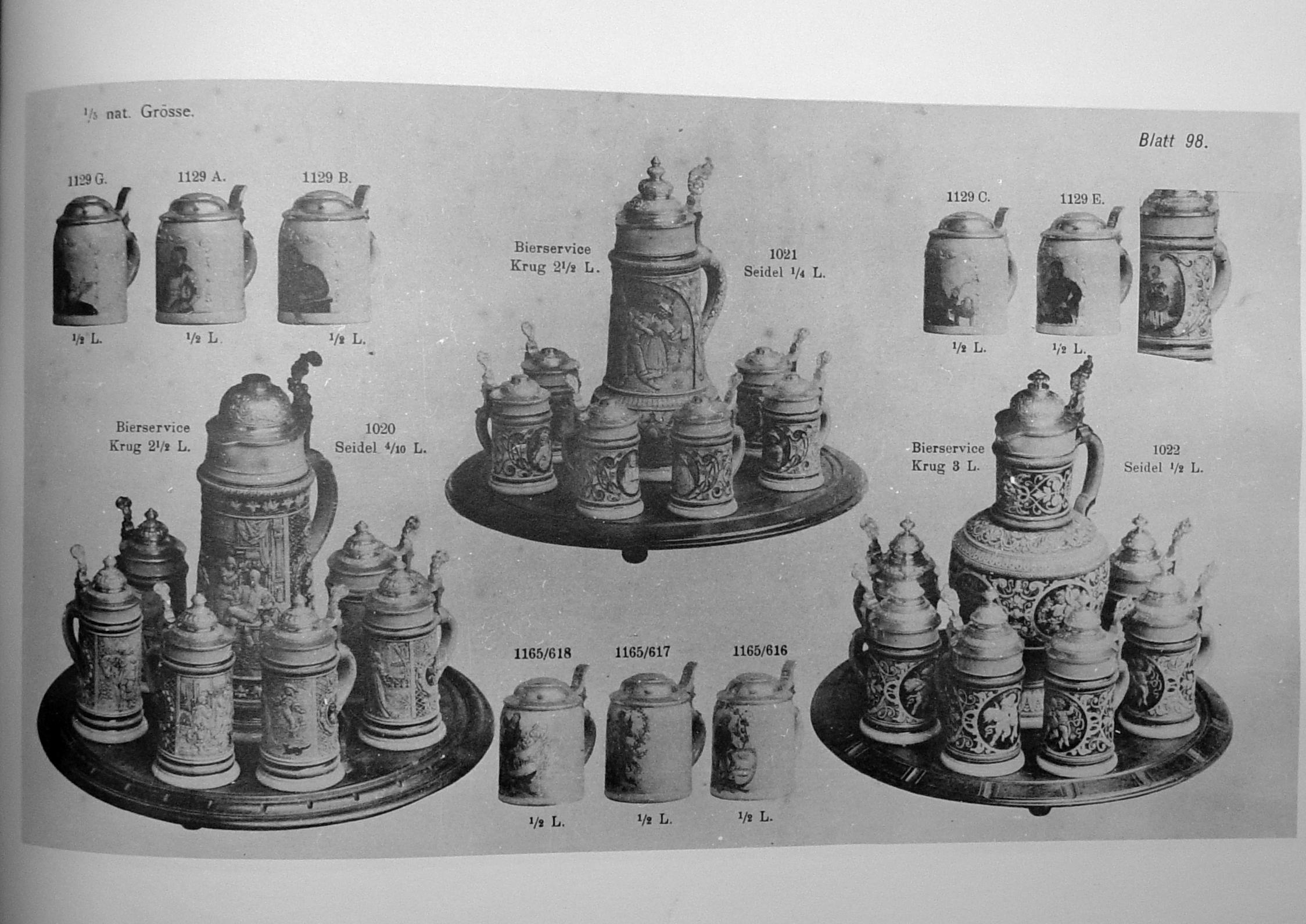 Who made this stein? Using available original manufacturers catalogs, this page allows you to look up possible answers to that question. Mold numbers beginning with 1 and ranging into the thousands appear in the first column below. For each mold number, the manufacturers who produced an item with that number are listed, along with a link to an original catalog page showing that item. Scroll down to the mold number in question, then examine the catalog pages to confirm the manufacturer of your stein.