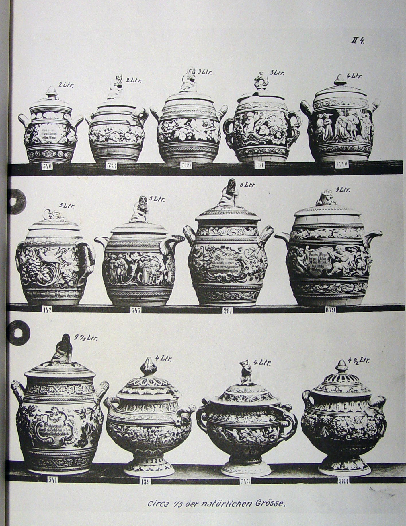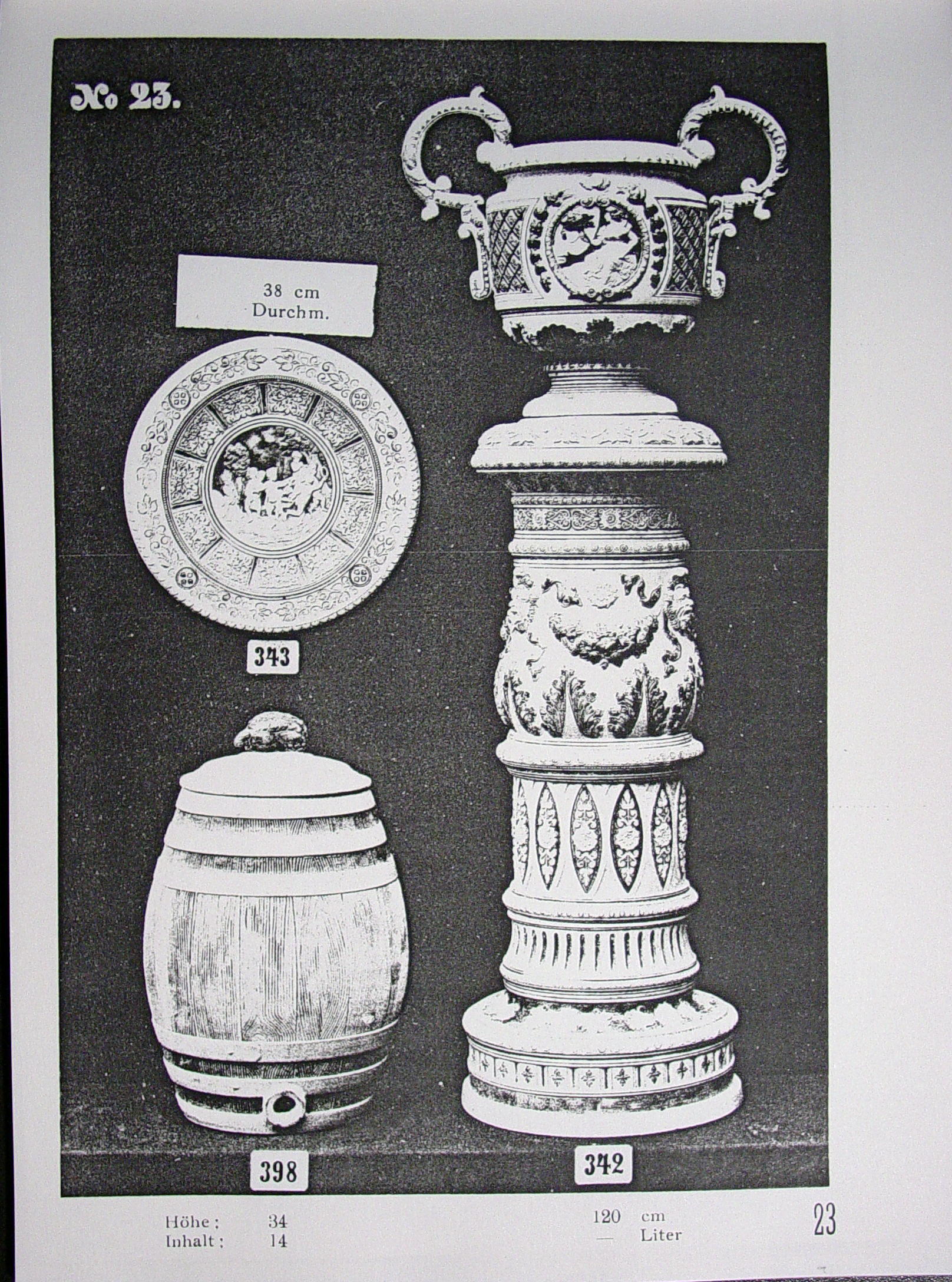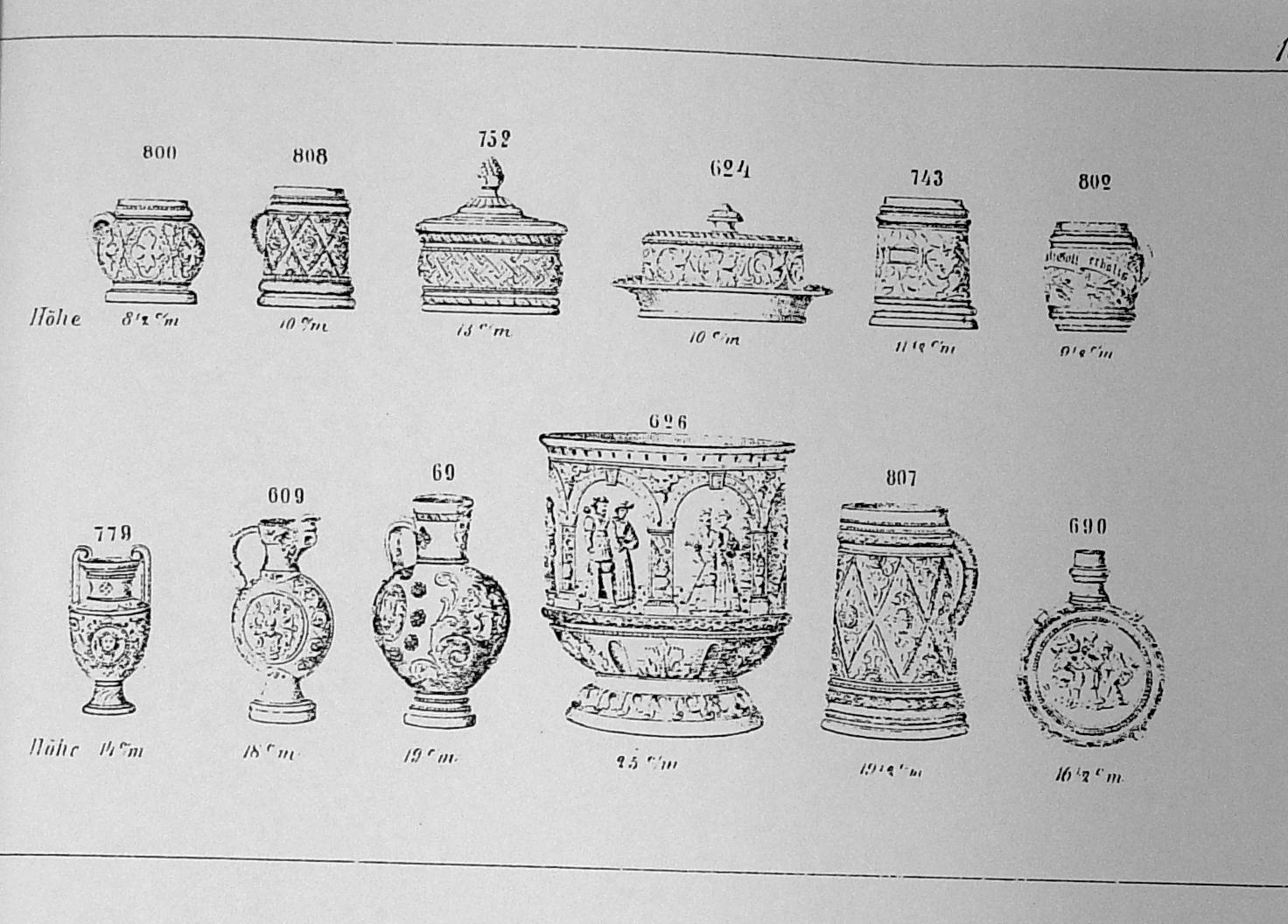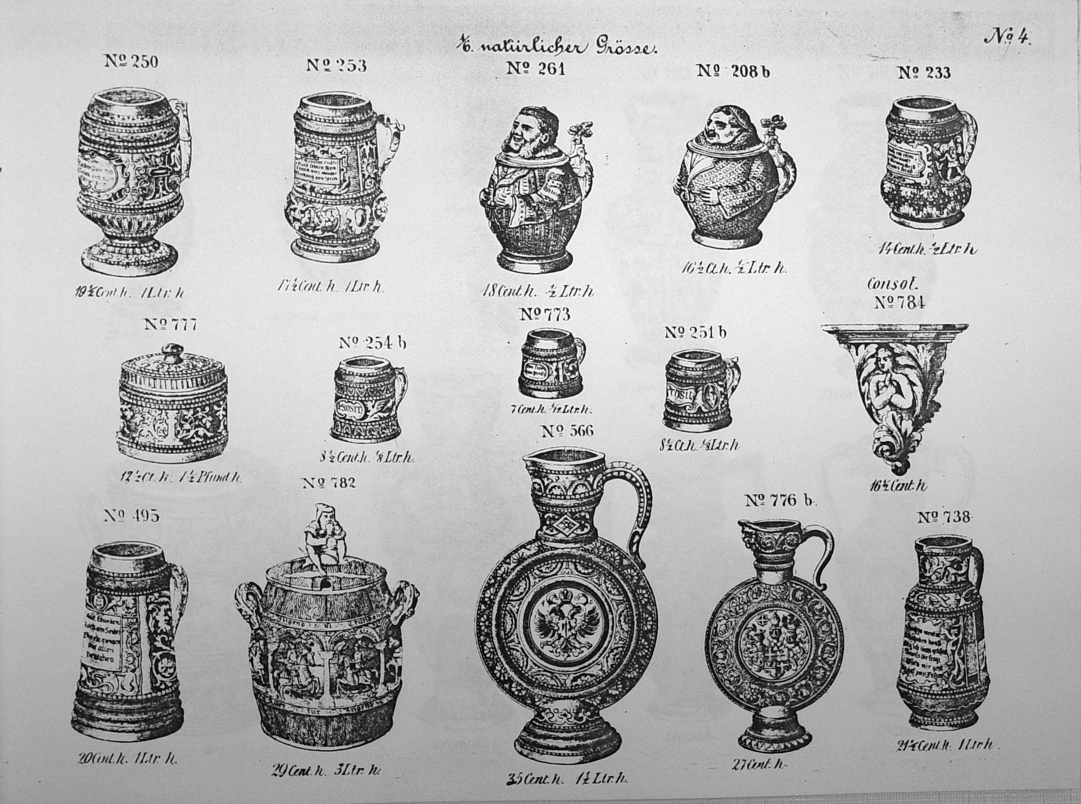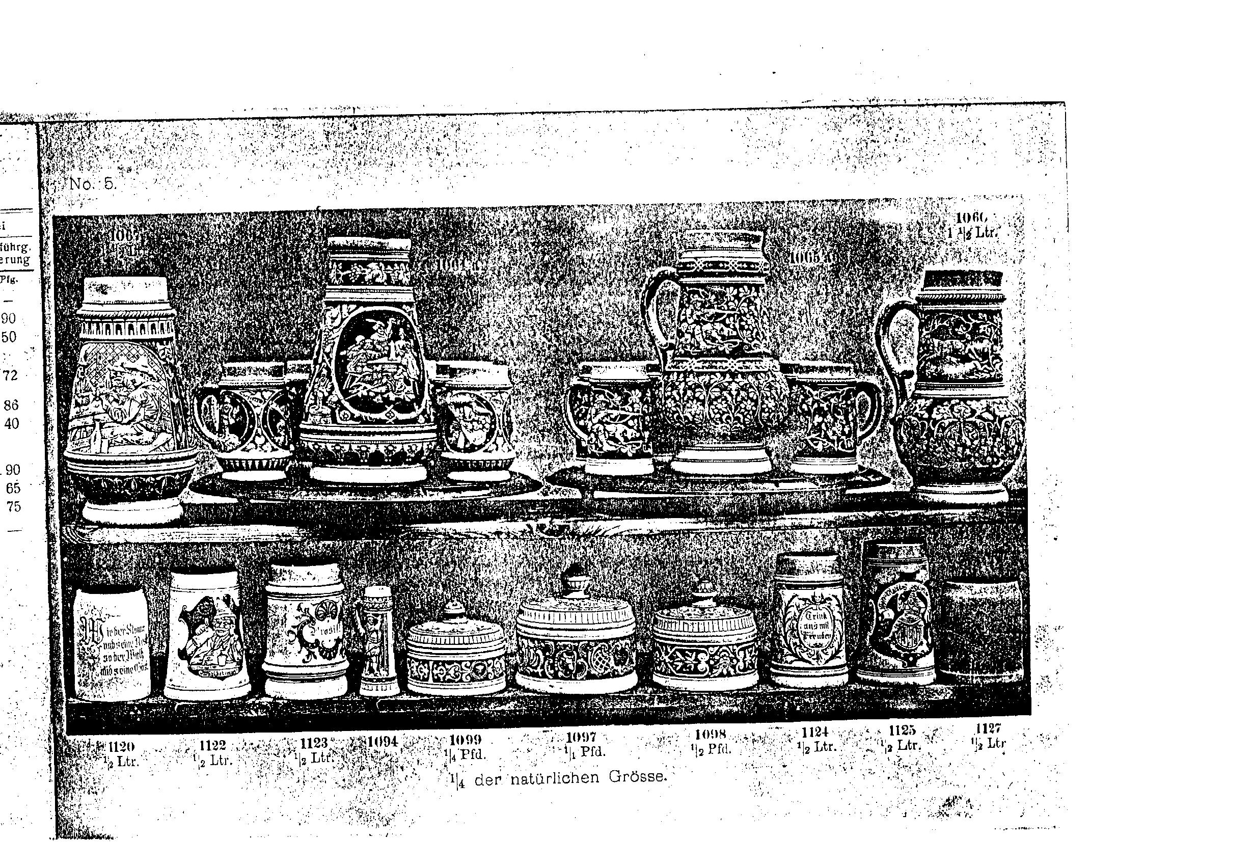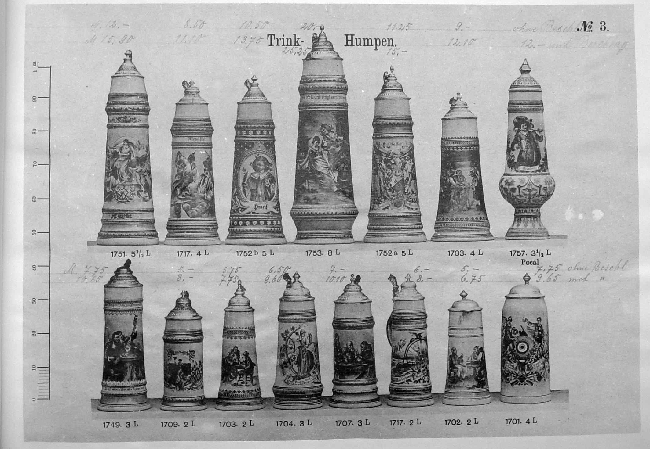 Who made this stein? Using available original manufacturers catalogs, this page allows you to look up possible answers to that question. Mold numbers beginning with 1 and ranging into the thousands appear in the first column below. For each mold number, the manufacturers who produced an item with that number are listed, along with a link to an original catalog page showing that item. Scroll down to the mold number in question, then examine the catalog pages to confirm the manufacturer of your stein.
