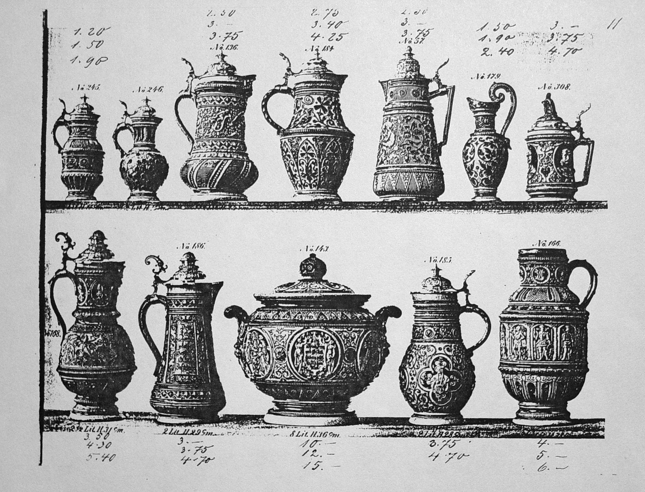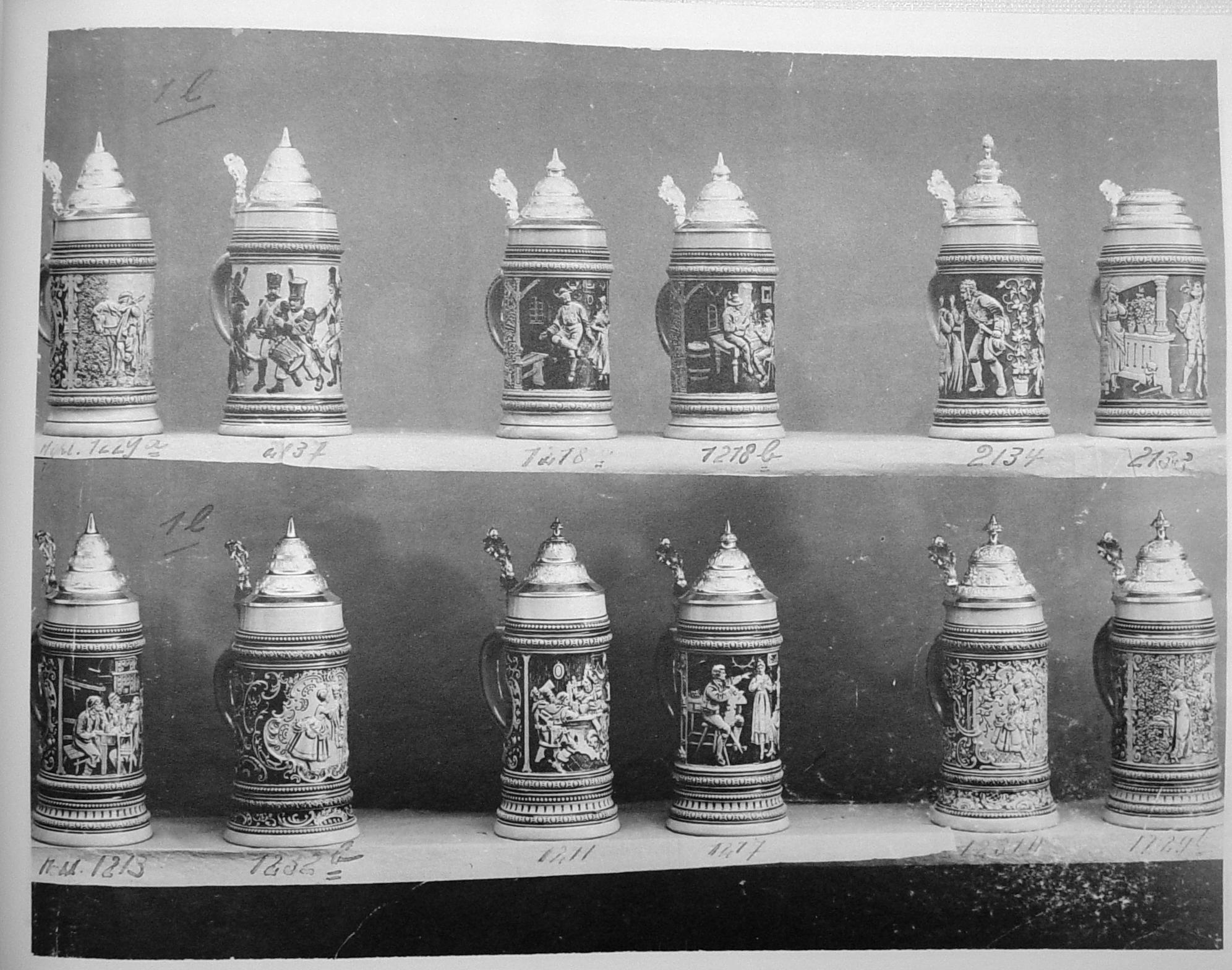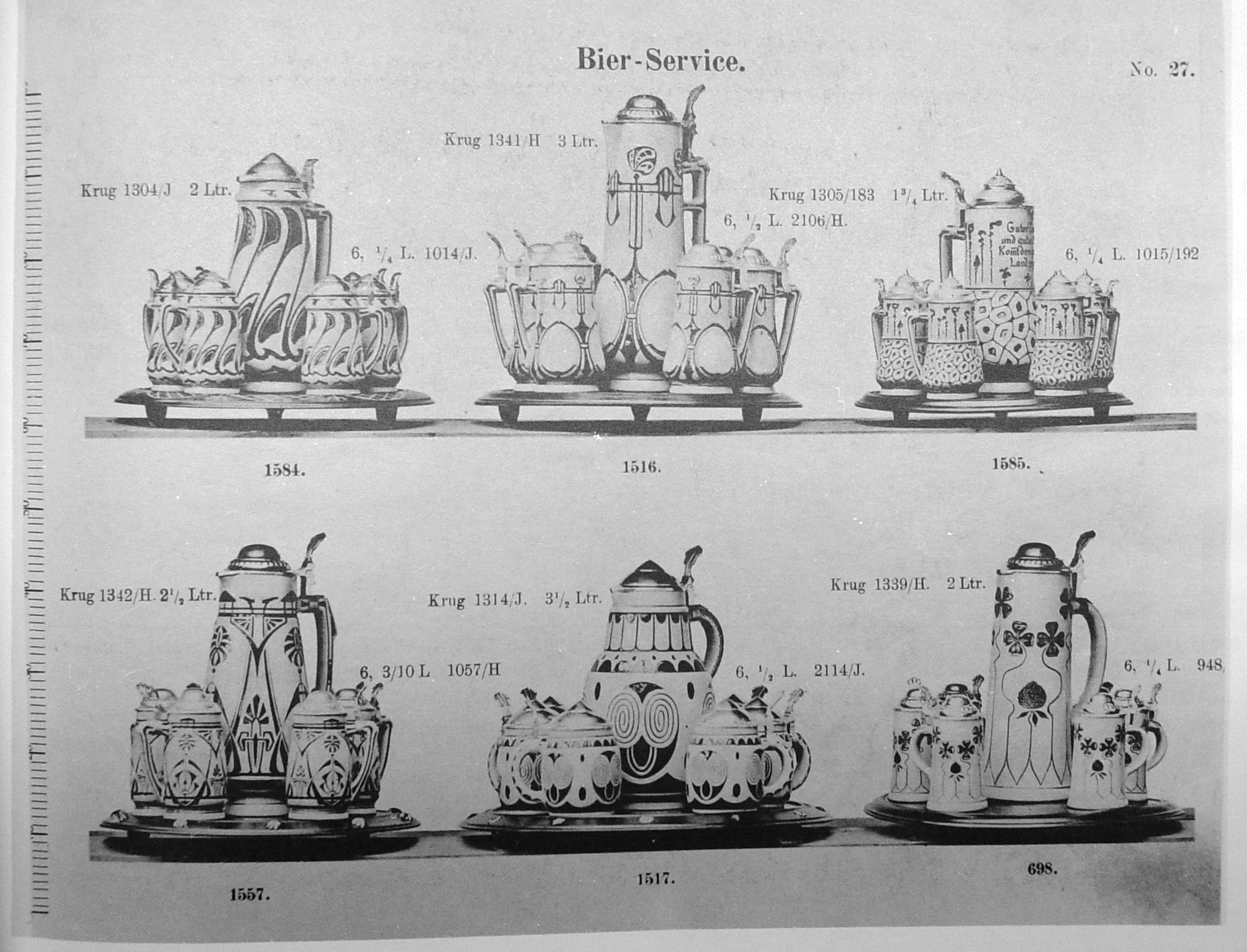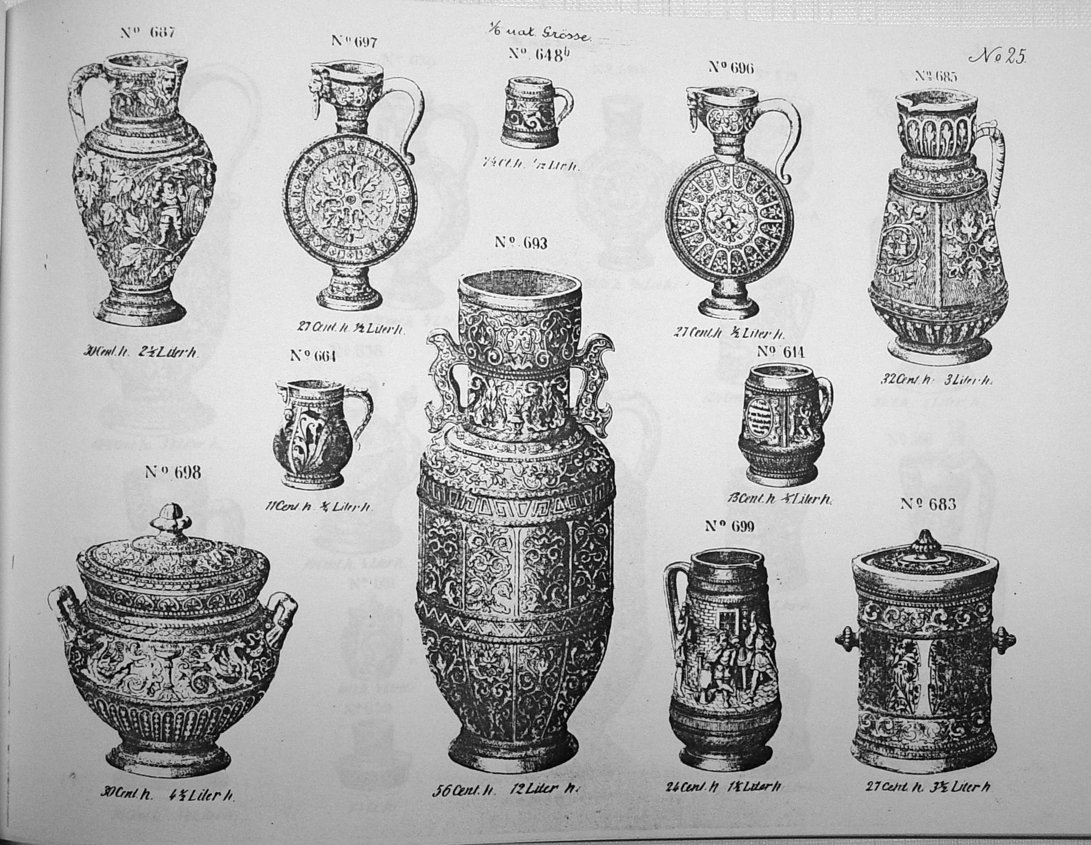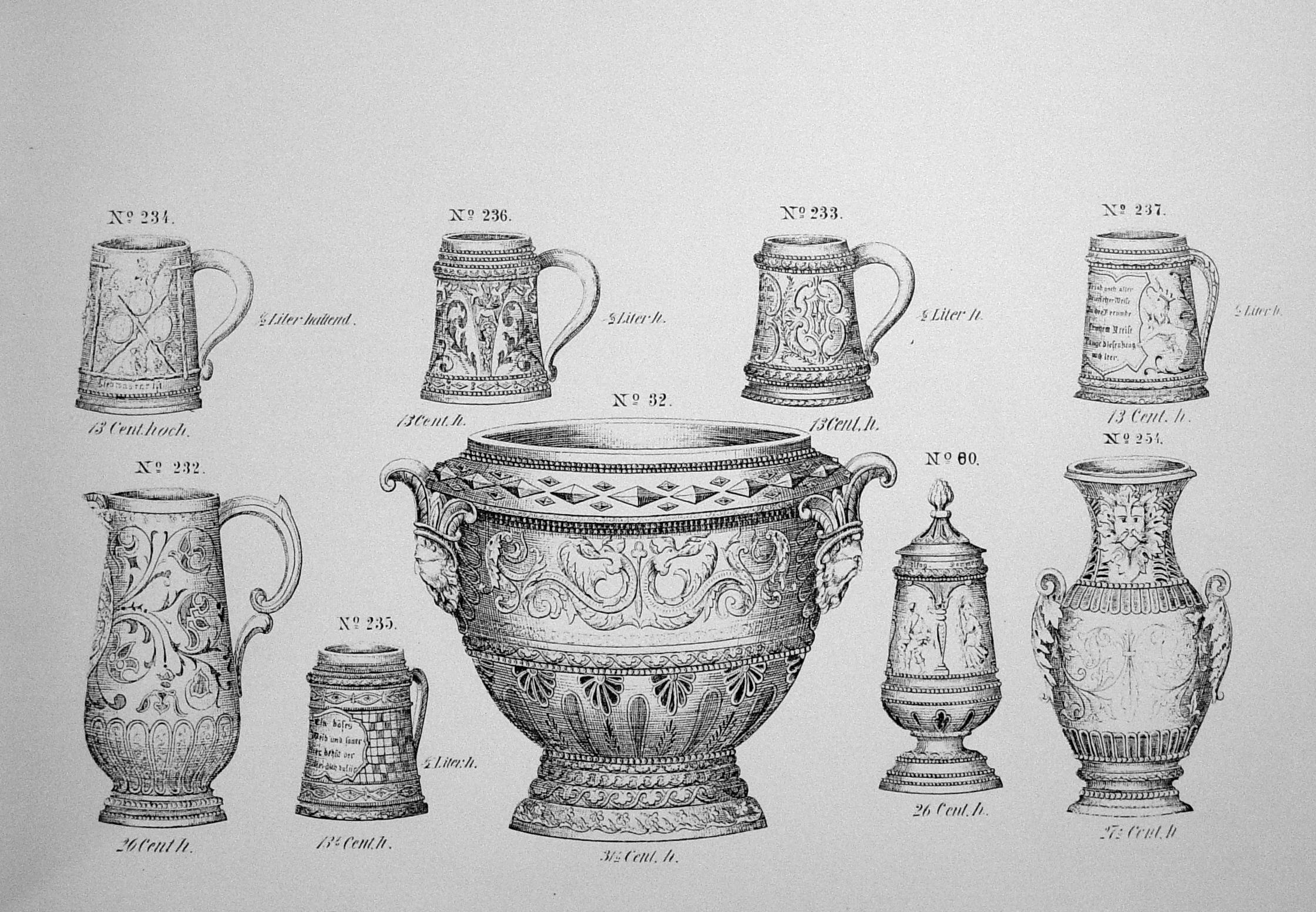 Who made this stein? Using available original manufacturers catalogs, this page allows you to look up possible answers to that question. Mold numbers beginning with 1 and ranging into the thousands appear in the first column below. For each mold number, the manufacturers who produced an item with that number are listed, along with a link to an original catalog page showing that item. Scroll down to the mold number in question, then examine the catalog pages to confirm the manufacturer of your stein.