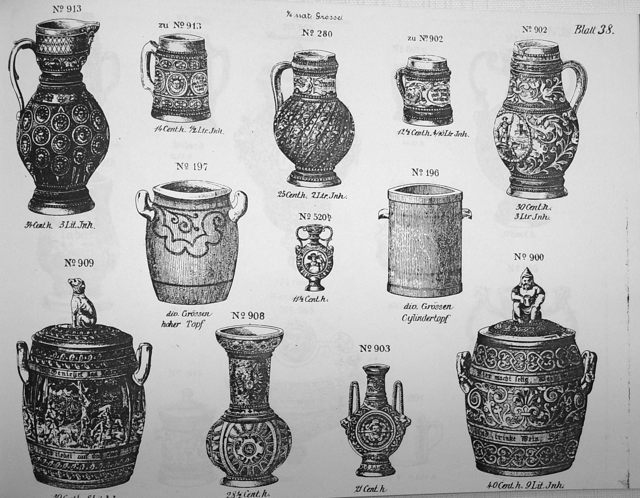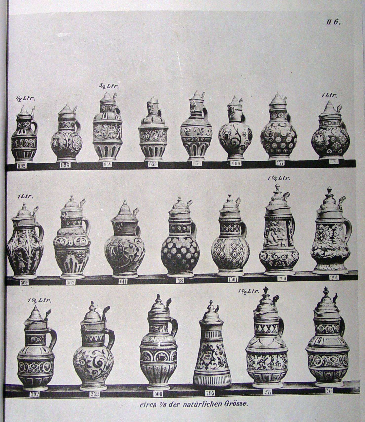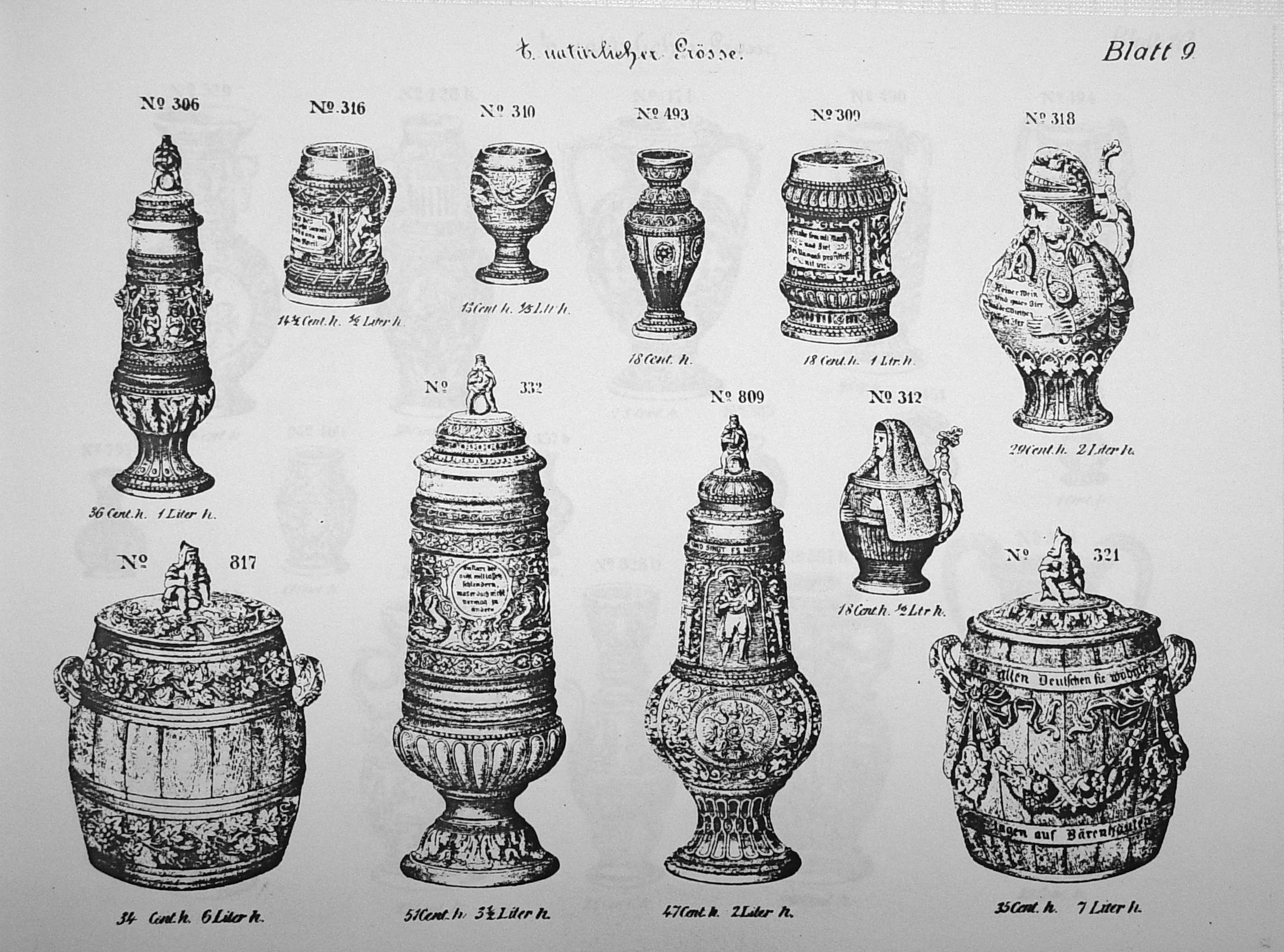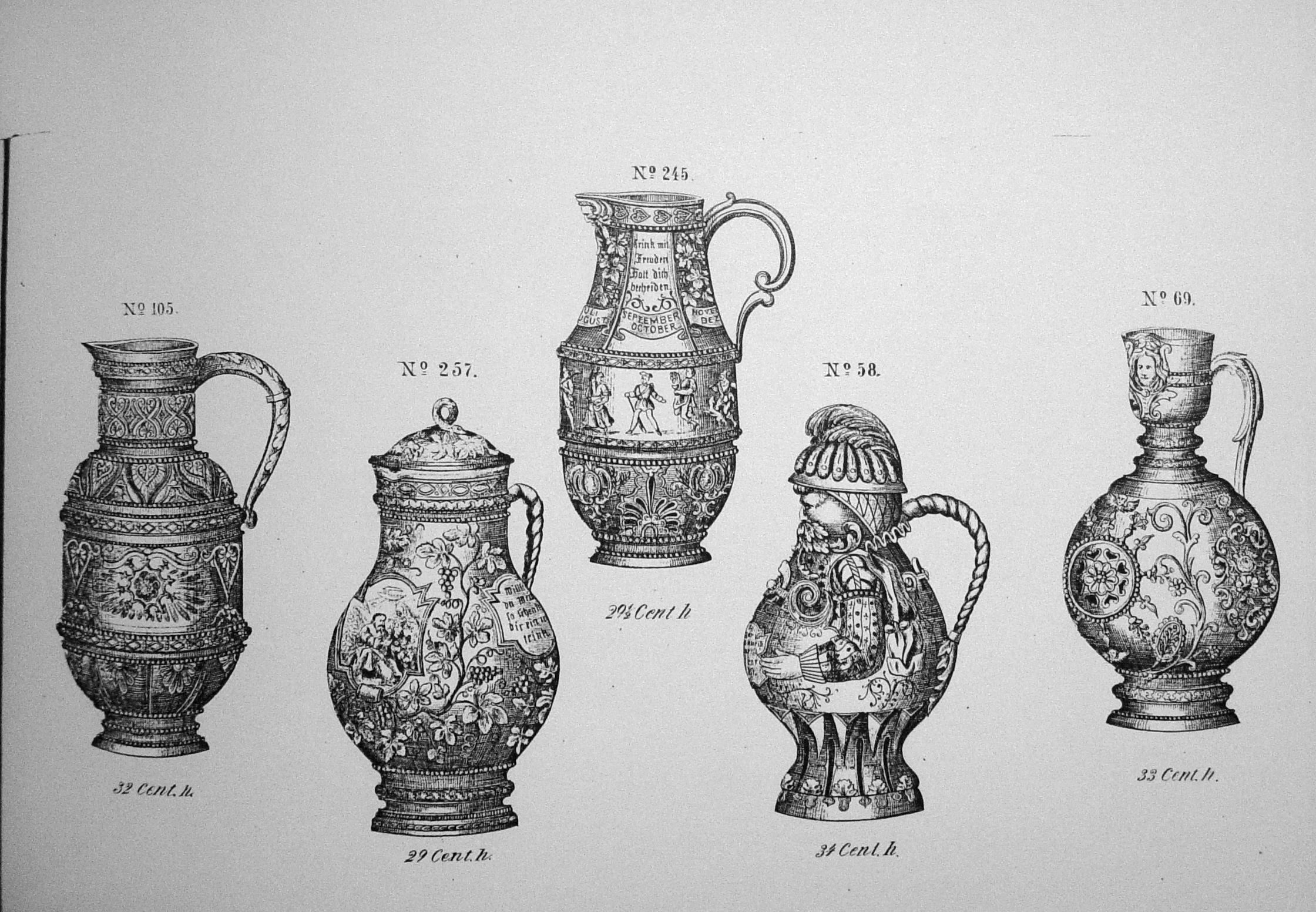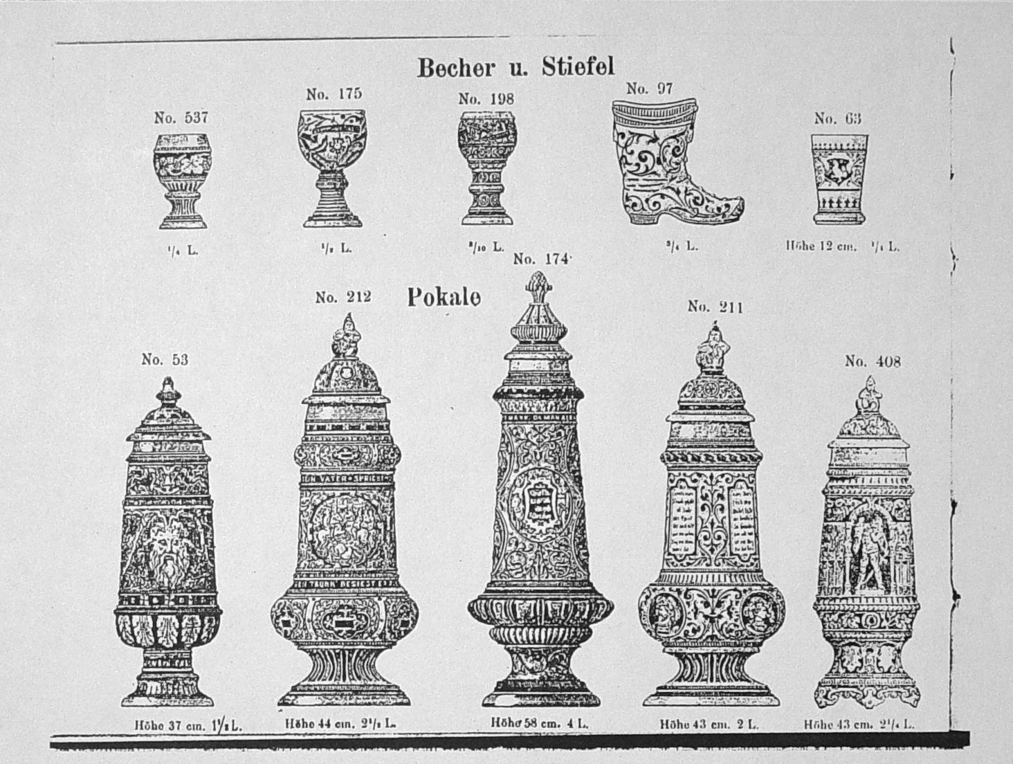 Who made this stein? Using available original manufacturers catalogs, this page allows you to look up possible answers to that question. Mold numbers beginning with 1 and ranging into the thousands appear in the first column below. For each mold number, the manufacturers who produced an item with that number are listed, along with a link to an original catalog page showing that item. Scroll down to the mold number in question, then examine the catalog pages to confirm the manufacturer of your stein.