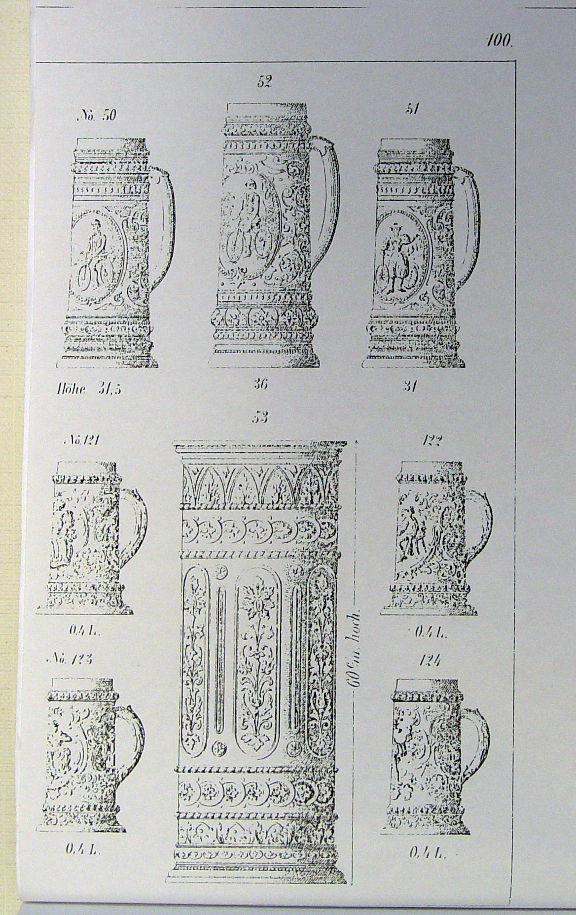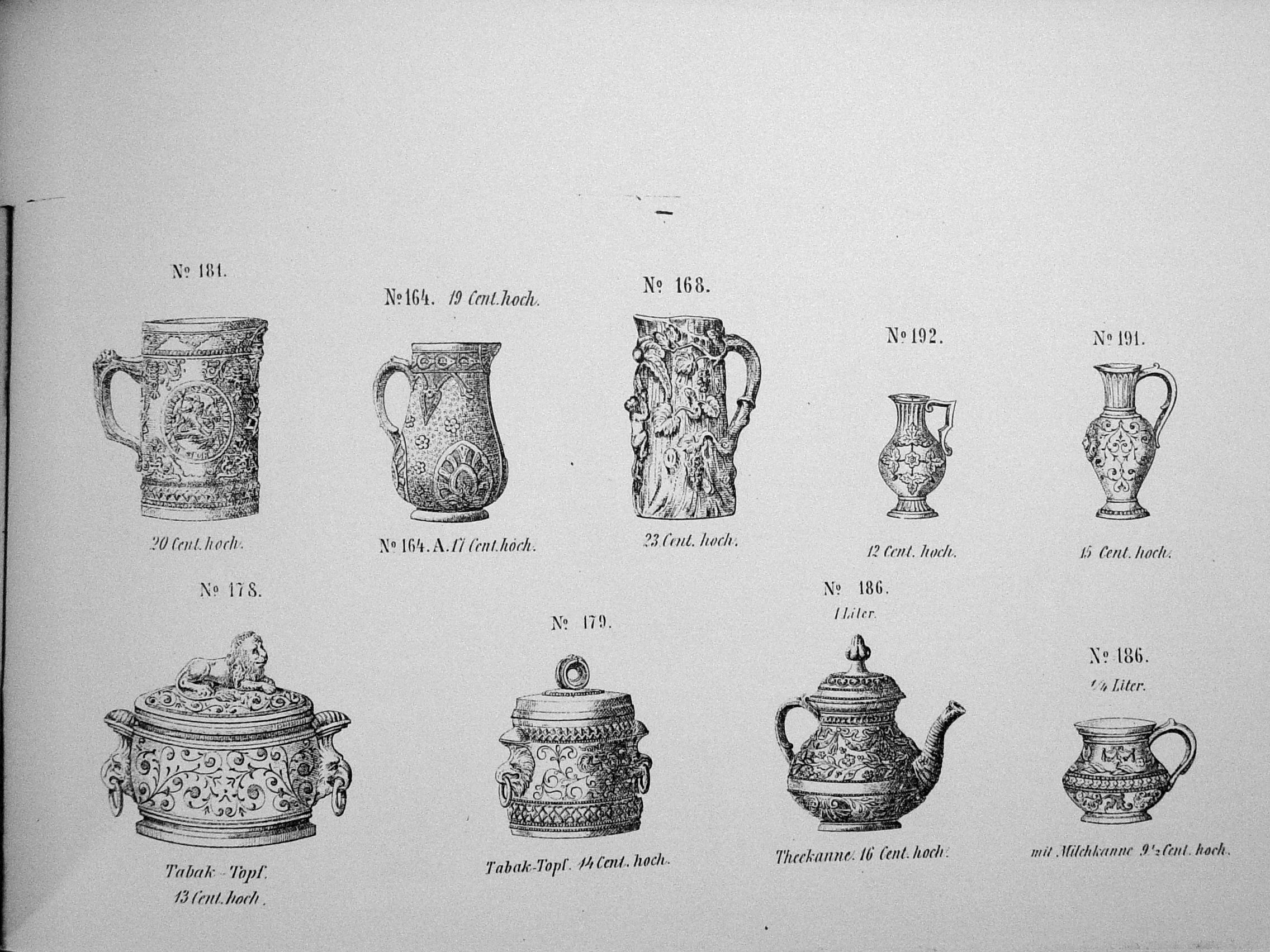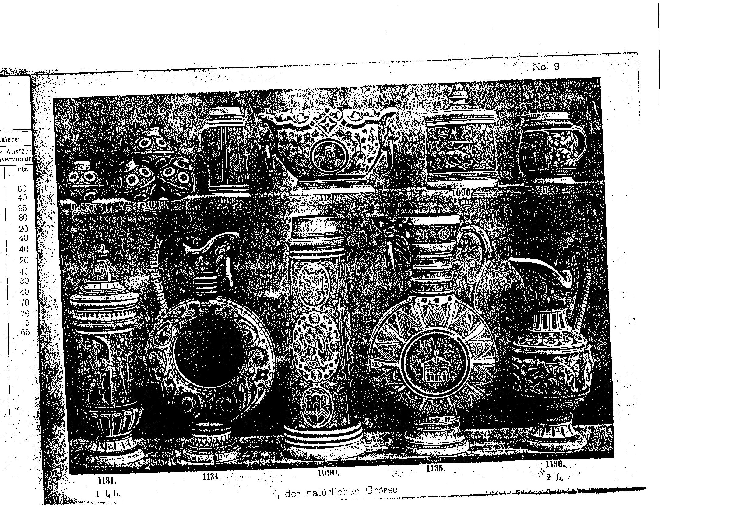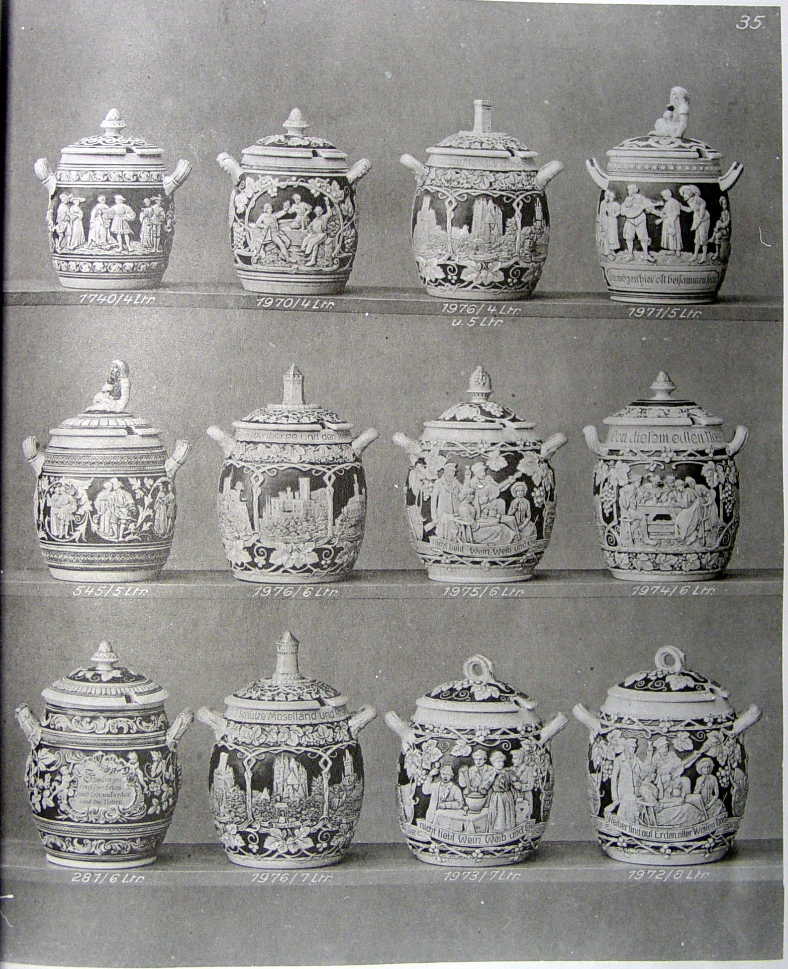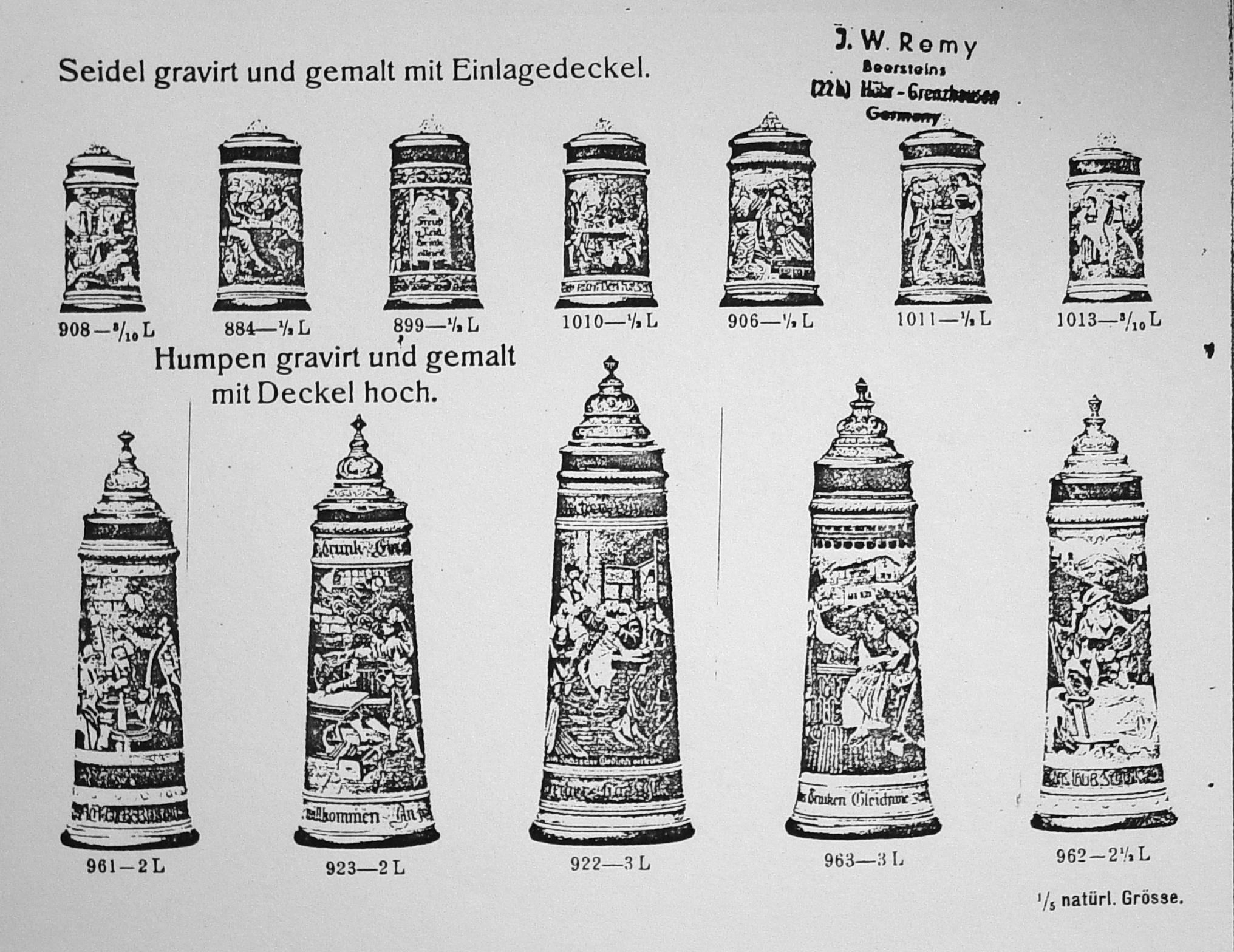 Who made this stein? Using available original manufacturers catalogs, this page allows you to look up possible answers to that question. Mold numbers beginning with 1 and ranging into the thousands appear in the first column below. For each mold number, the manufacturers who produced an item with that number are listed, along with a link to an original catalog page showing that item. Scroll down to the mold number in question, then examine the catalog pages to confirm the manufacturer of your stein.
