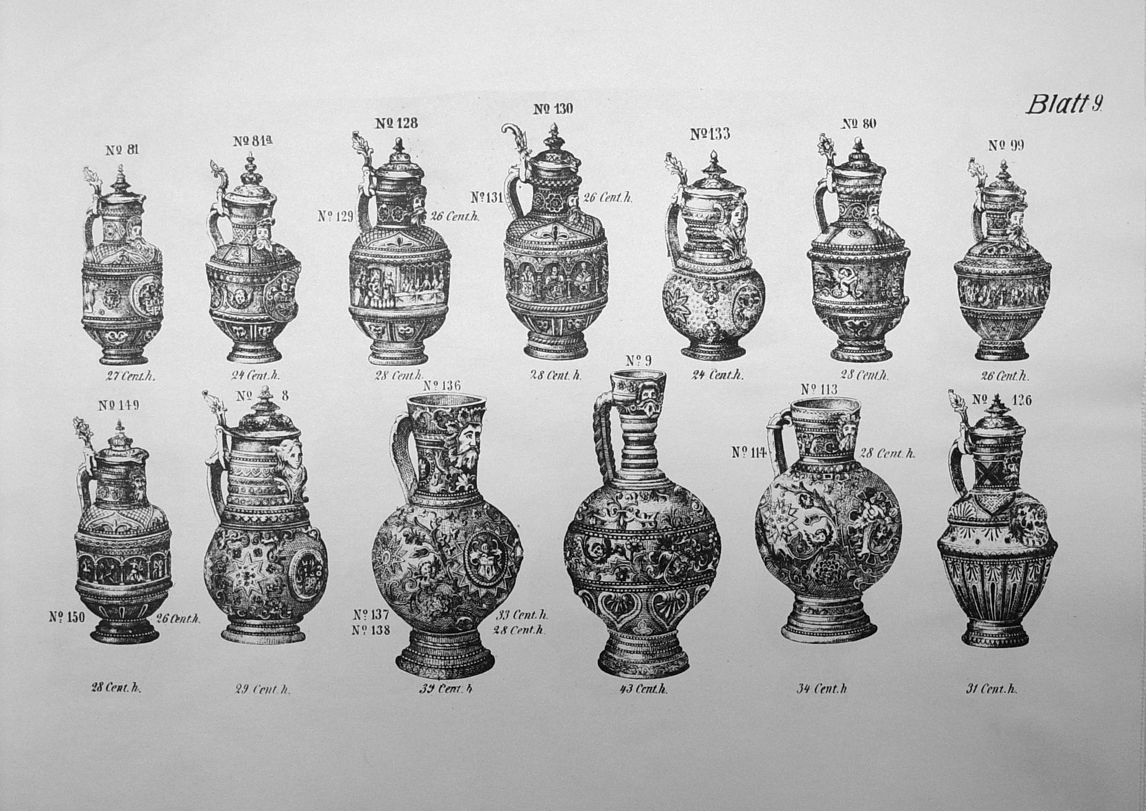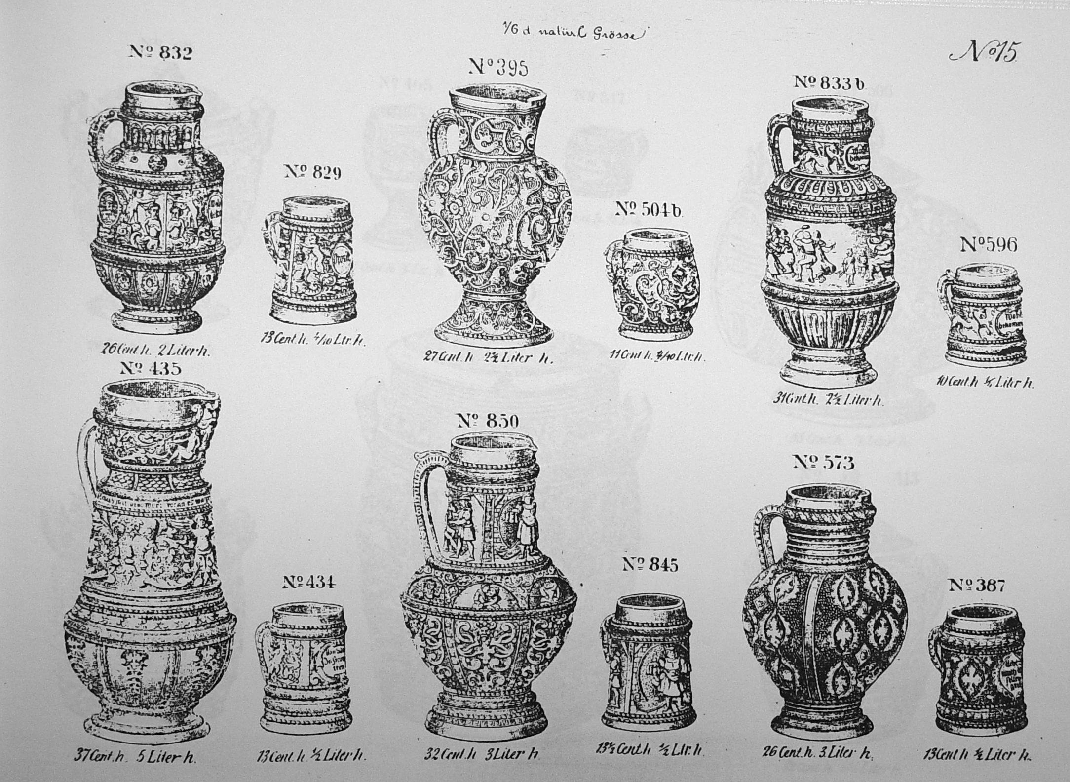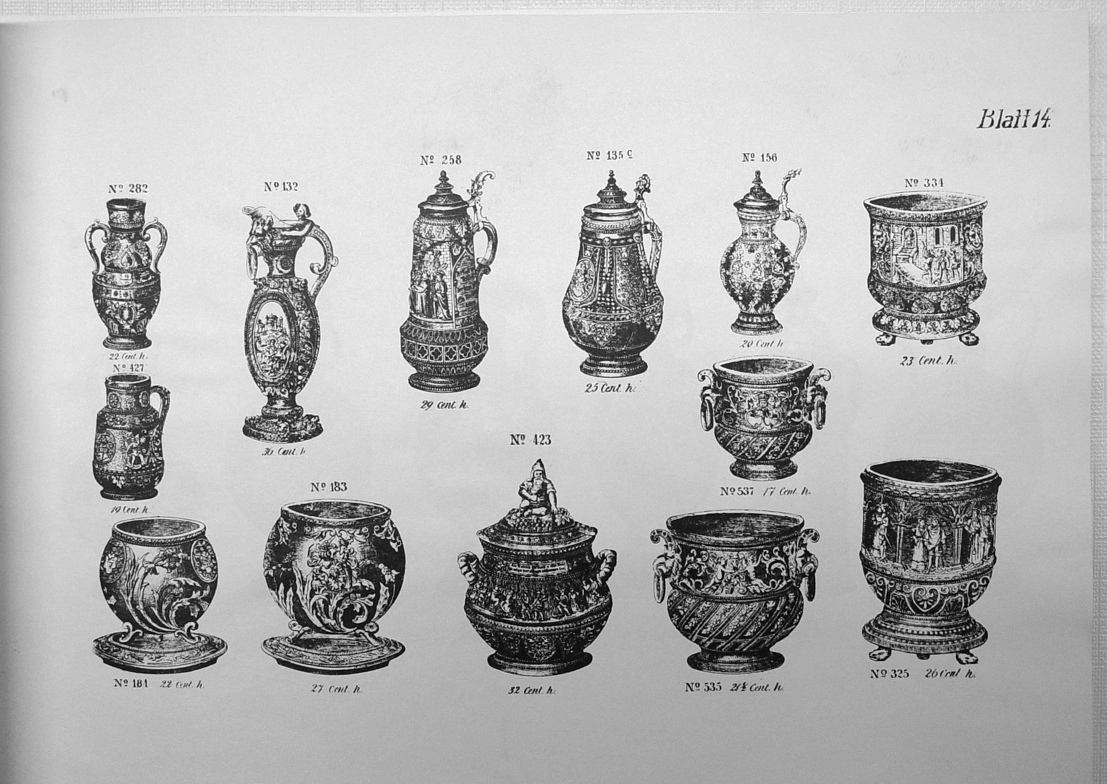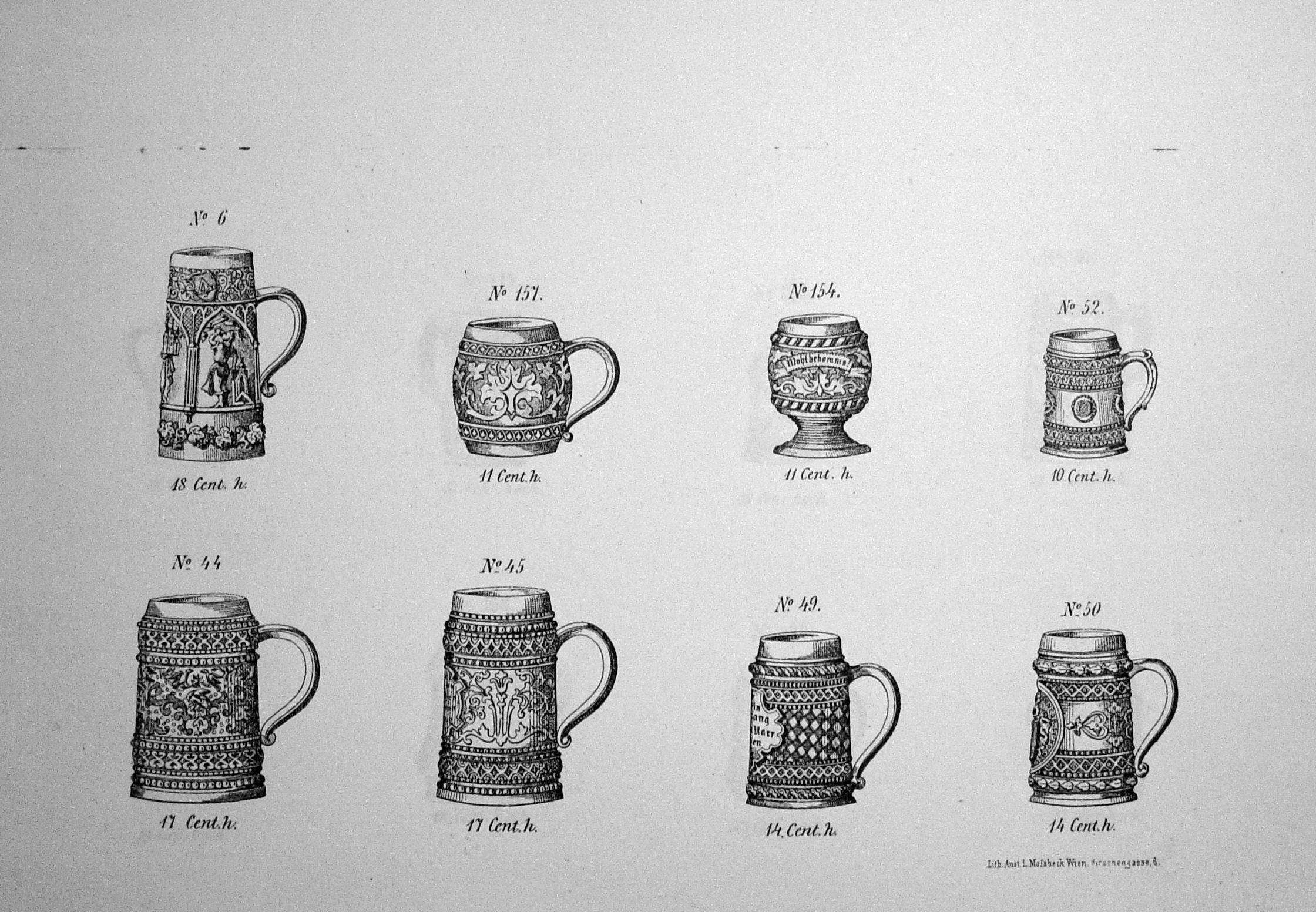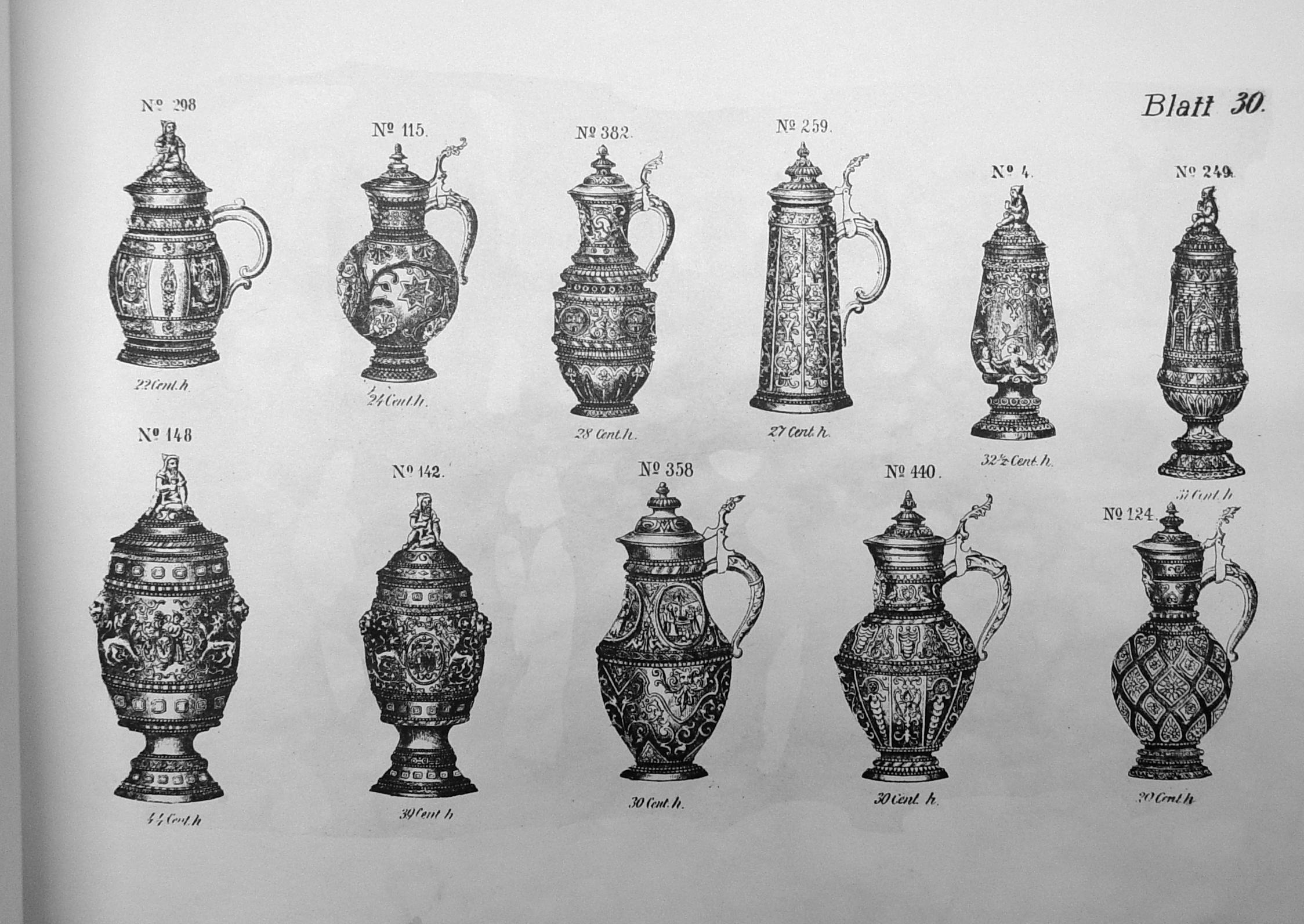 Who made this stein? Using available original manufacturers catalogs, this page allows you to look up possible answers to that question. Mold numbers beginning with 1 and ranging into the thousands appear in the first column below. For each mold number, the manufacturers who produced an item with that number are listed, along with a link to an original catalog page showing that item. Scroll down to the mold number in question, then examine the catalog pages to confirm the manufacturer of your stein.
