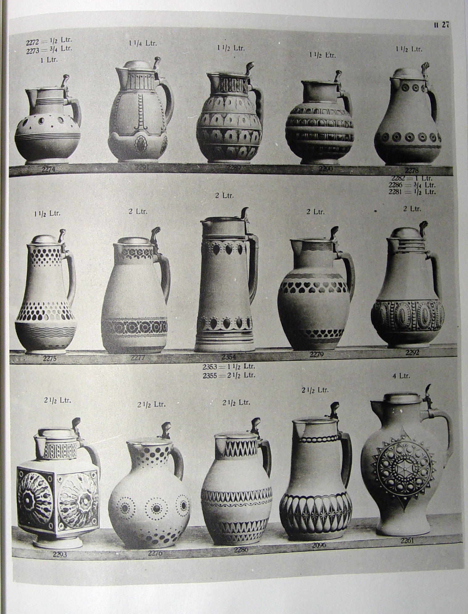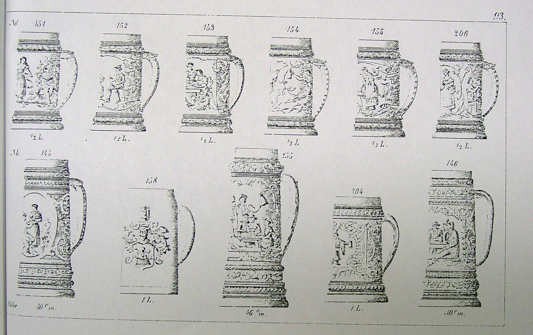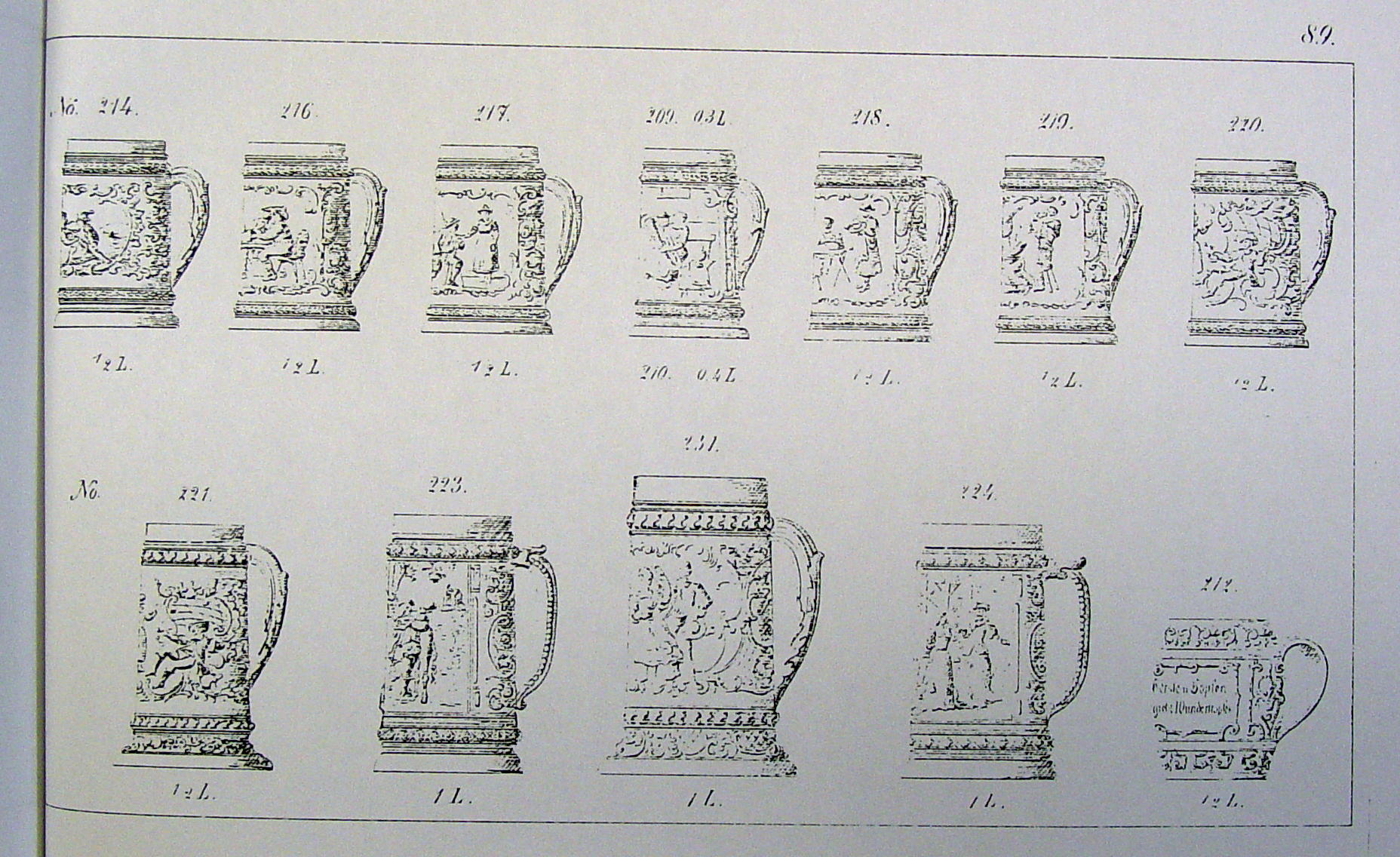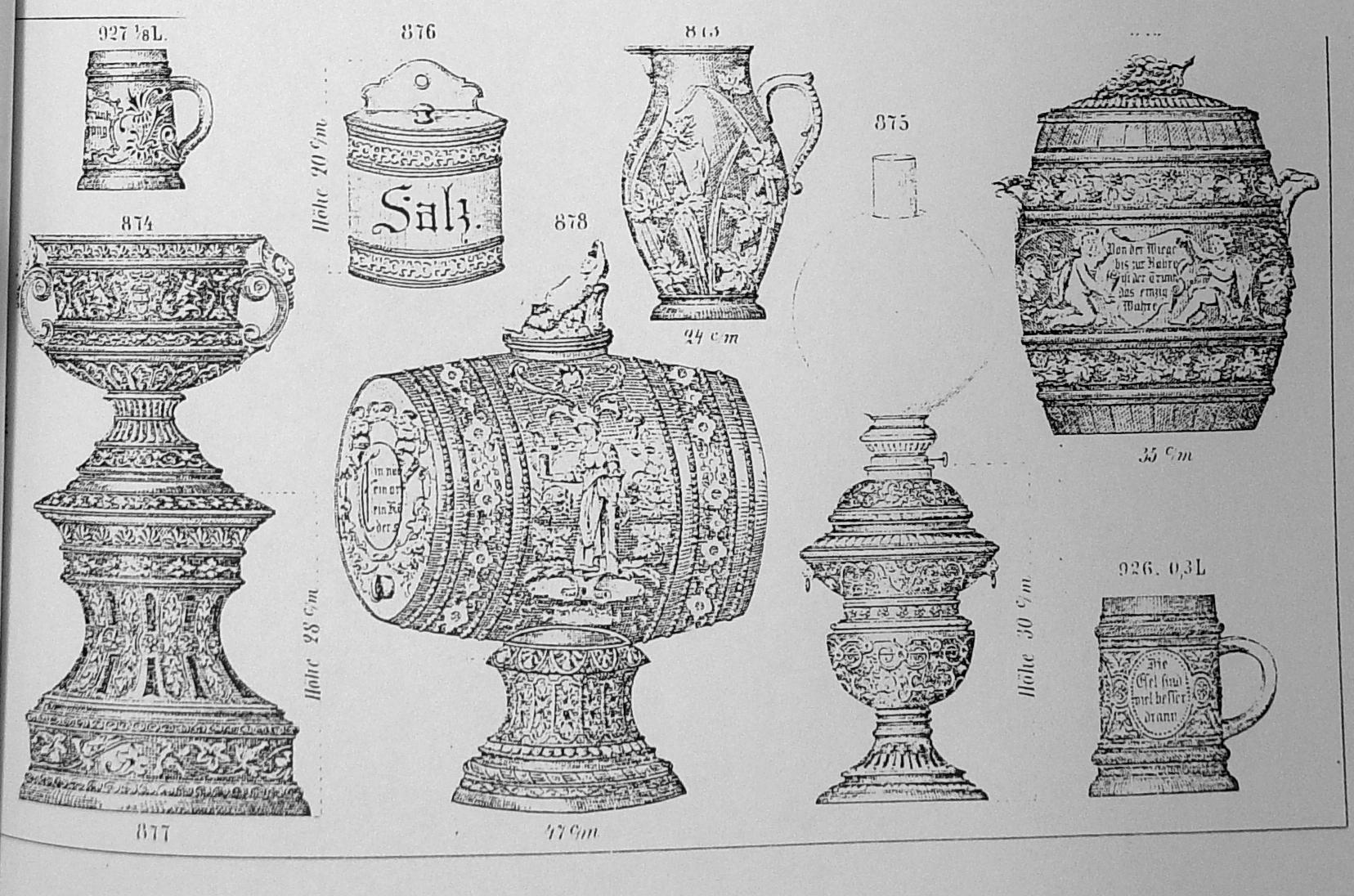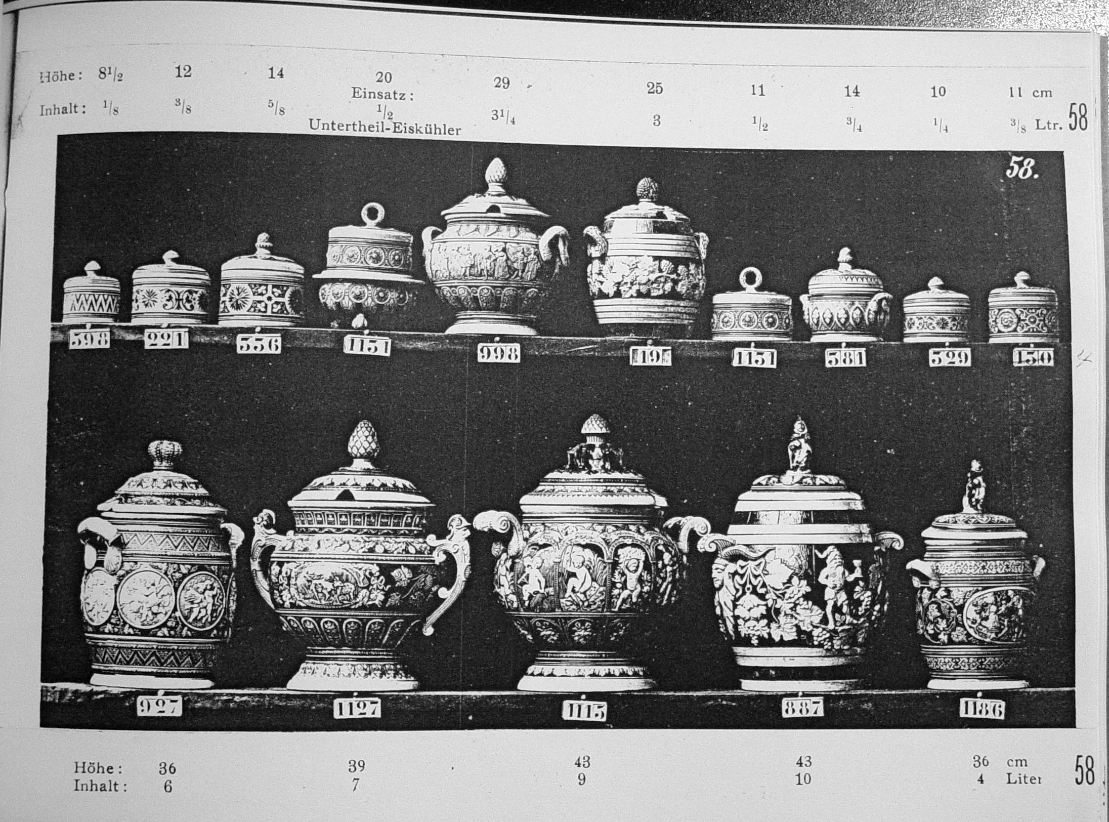 Who made this stein? Using available original manufacturers catalogs, this page allows you to look up possible answers to that question. Mold numbers beginning with 1 and ranging into the thousands appear in the first column below. For each mold number, the manufacturers who produced an item with that number are listed, along with a link to an original catalog page showing that item. Scroll down to the mold number in question, then examine the catalog pages to confirm the manufacturer of your stein.