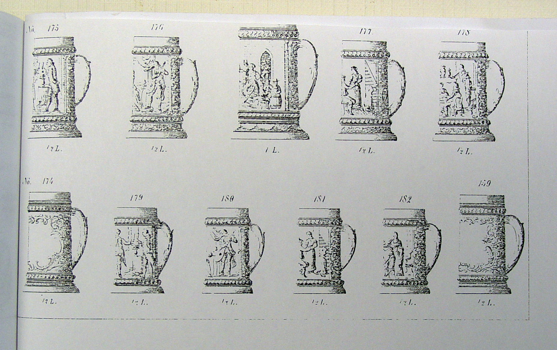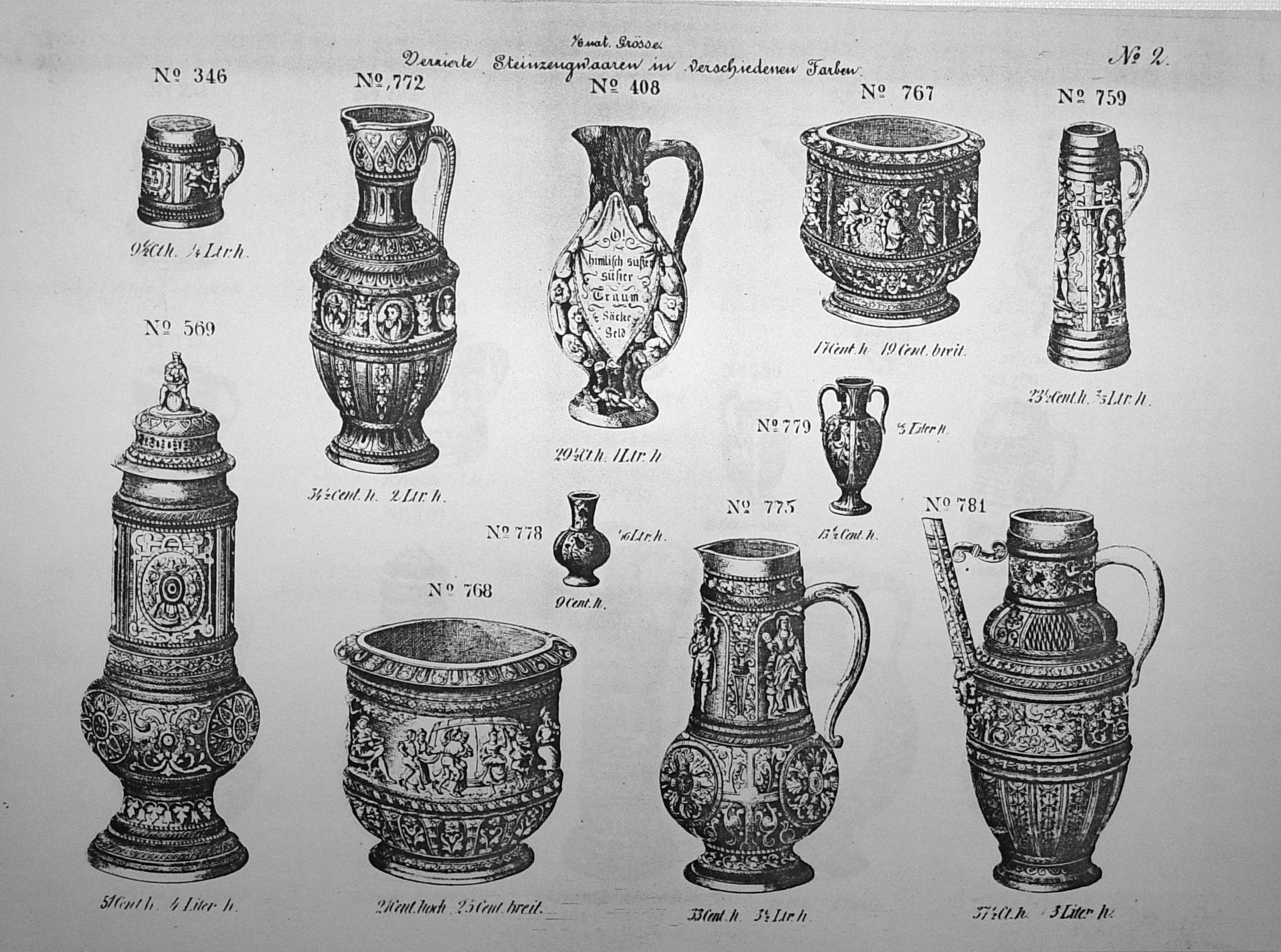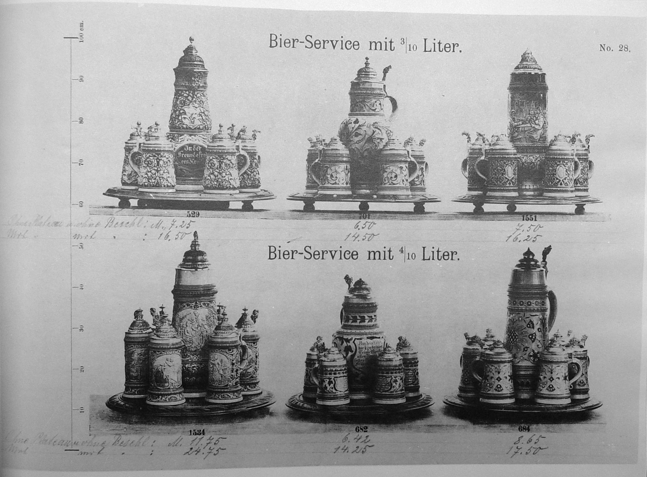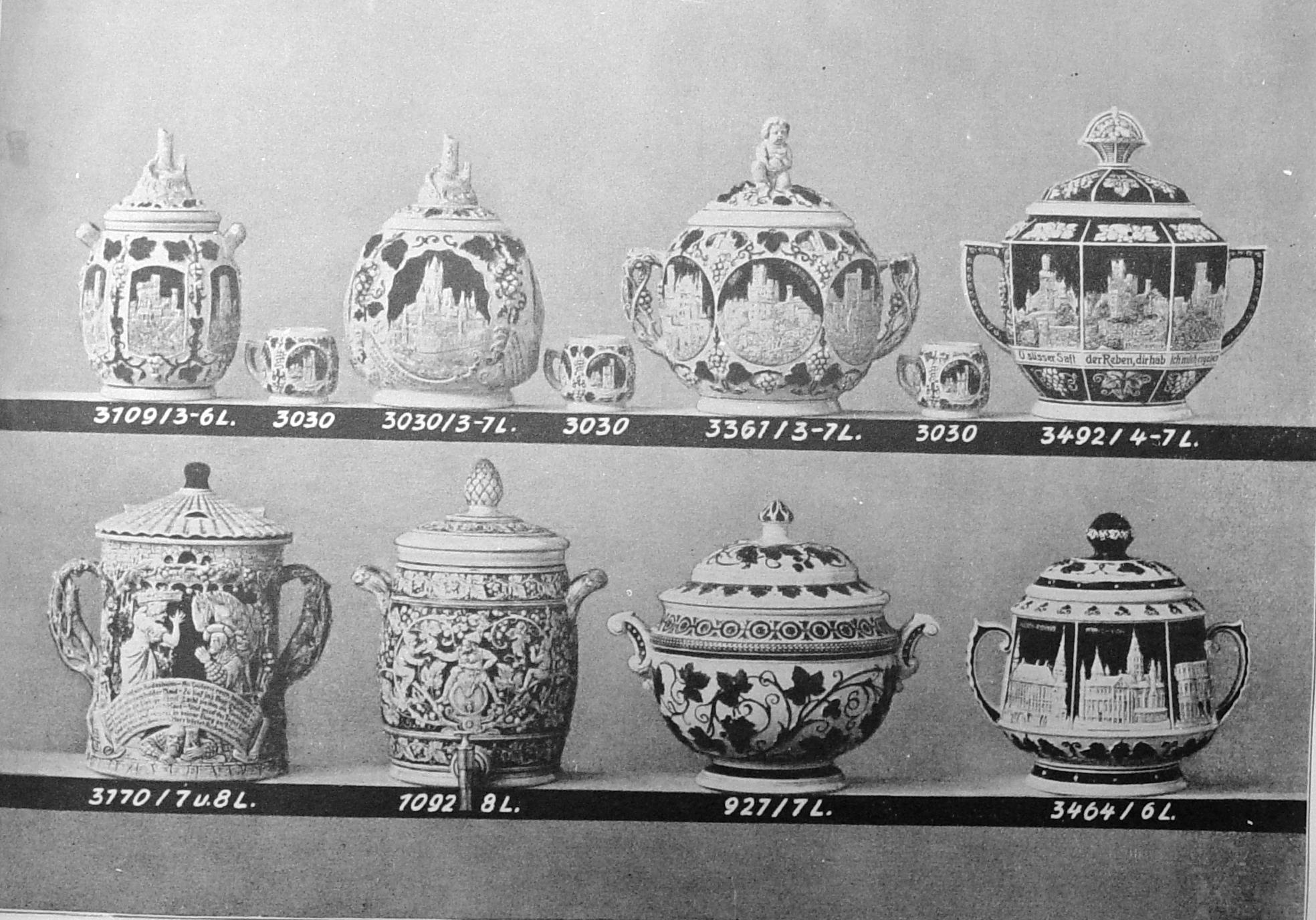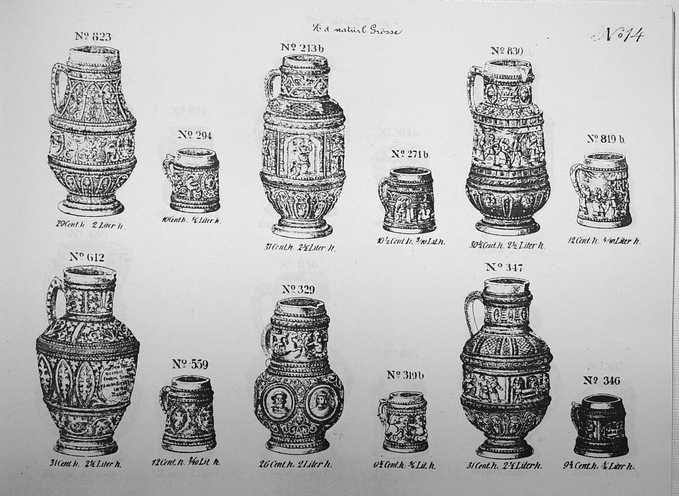 Who made this stein? Using available original manufacturers catalogs, this page allows you to look up possible answers to that question. Mold numbers beginning with 1 and ranging into the thousands appear in the first column below. For each mold number, the manufacturers who produced an item with that number are listed, along with a link to an original catalog page showing that item. Scroll down to the mold number in question, then examine the catalog pages to confirm the manufacturer of your stein.
