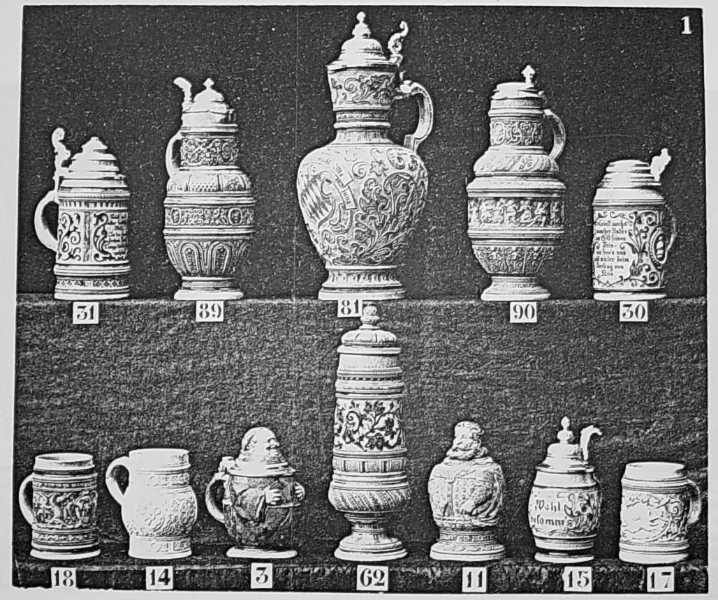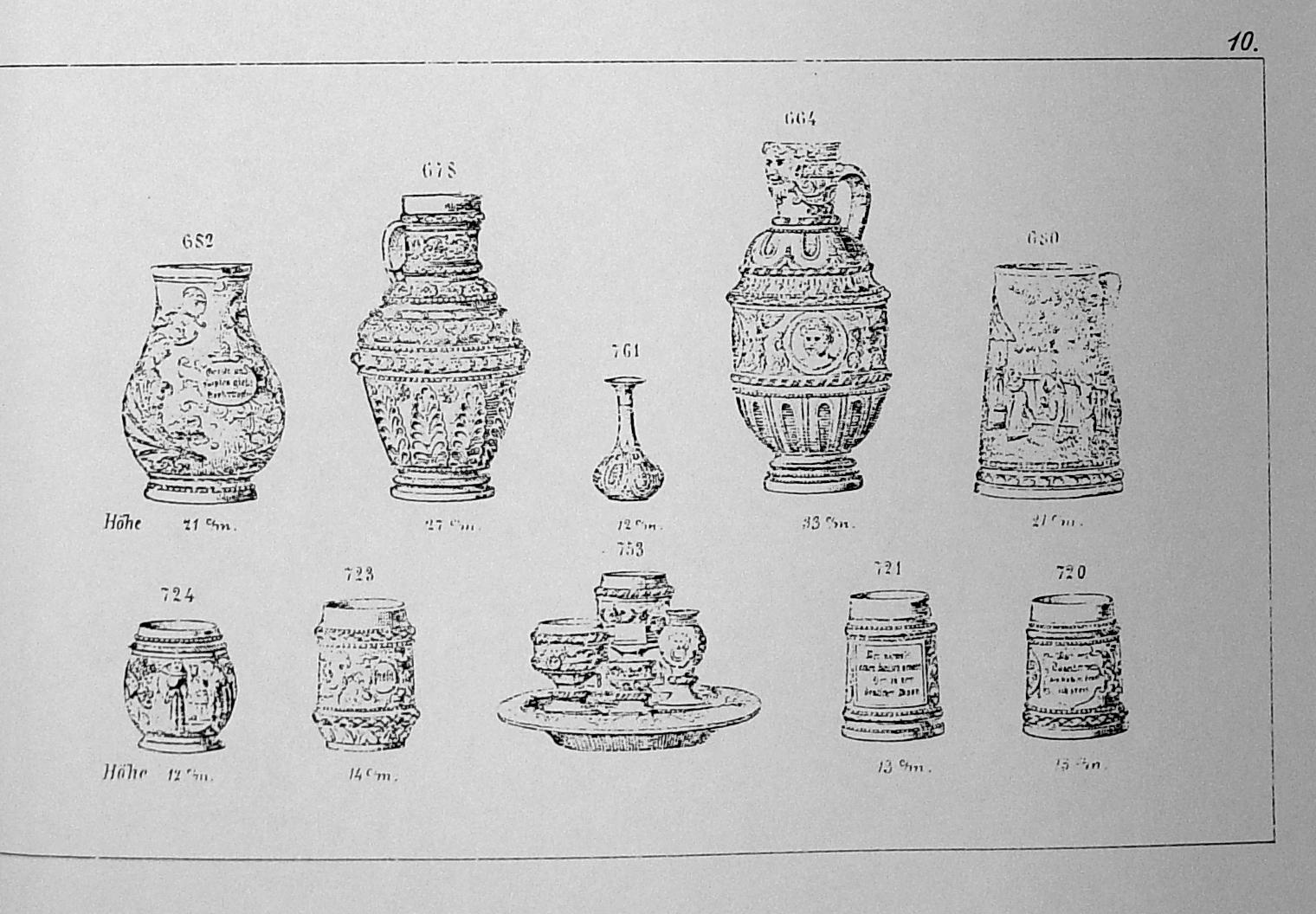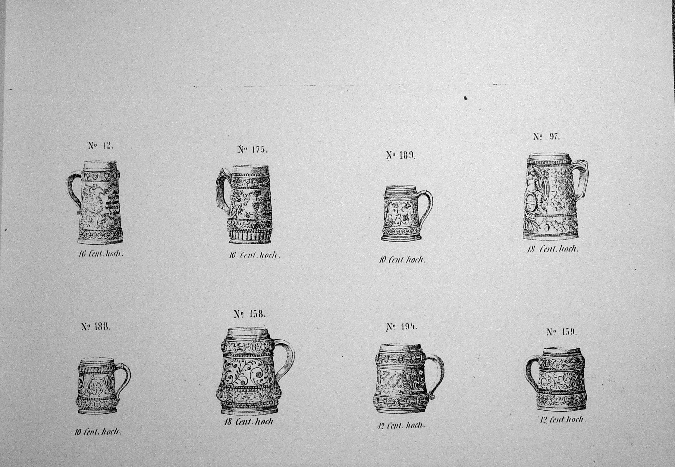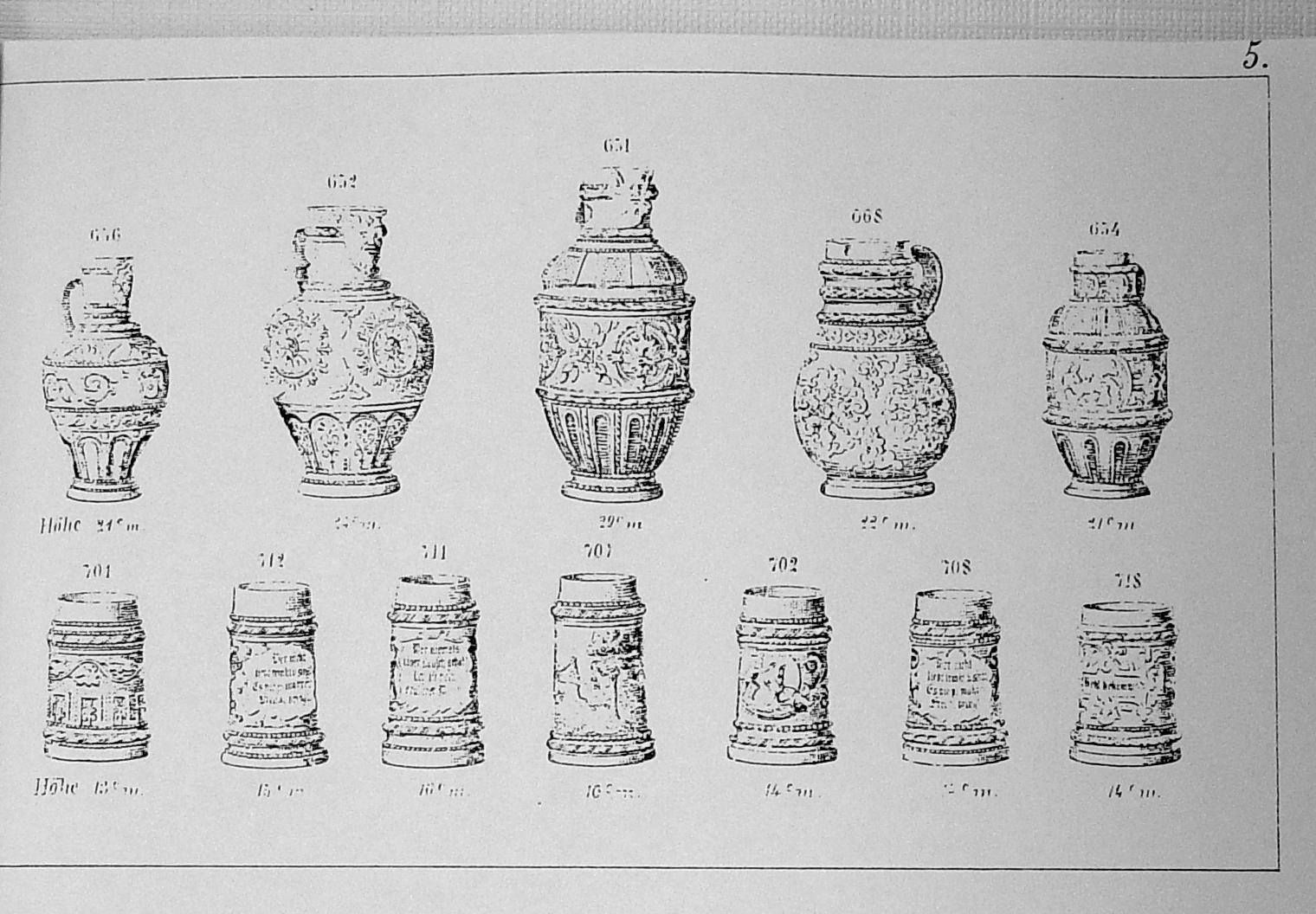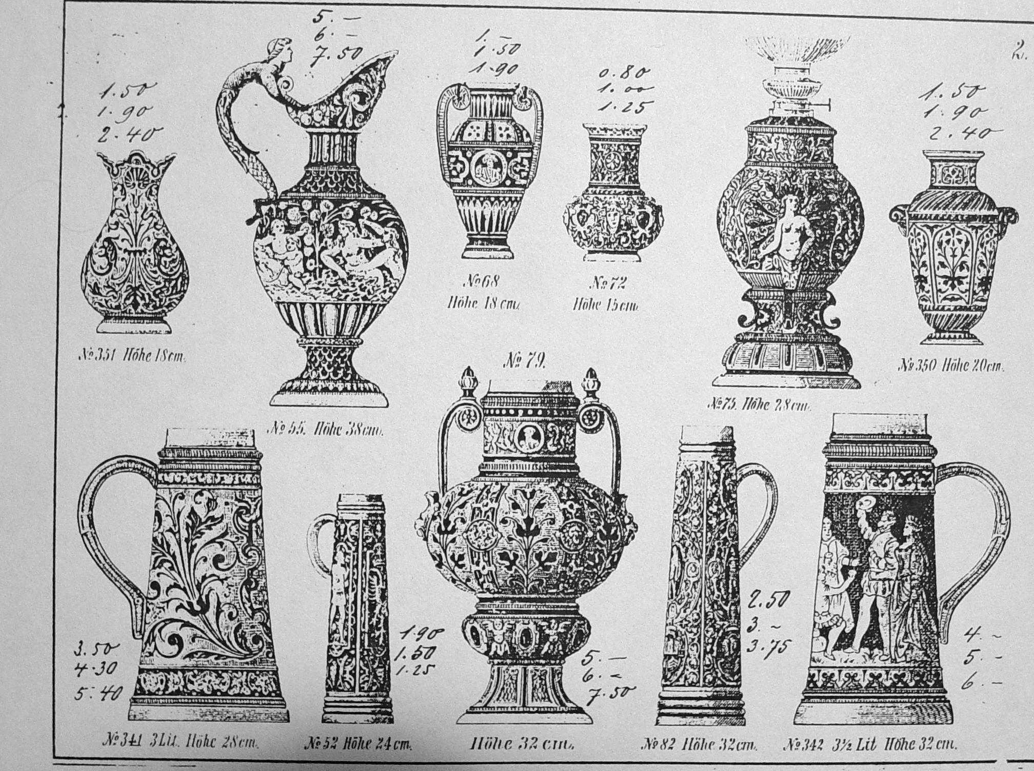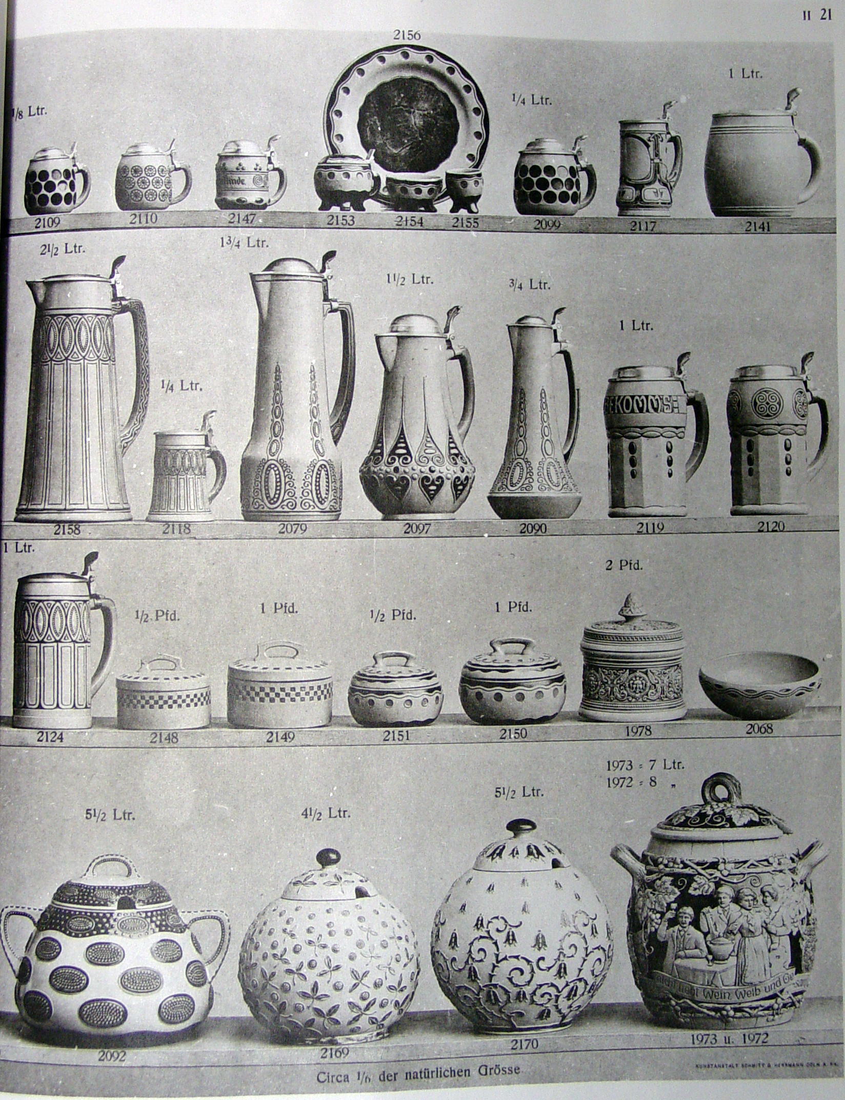 Who made this stein? Using available original manufacturers catalogs, this page allows you to look up possible answers to that question. Mold numbers beginning with 1 and ranging into the thousands appear in the first column below. For each mold number, the manufacturers who produced an item with that number are listed, along with a link to an original catalog page showing that item. Scroll down to the mold number in question, then examine the catalog pages to confirm the manufacturer of your stein.