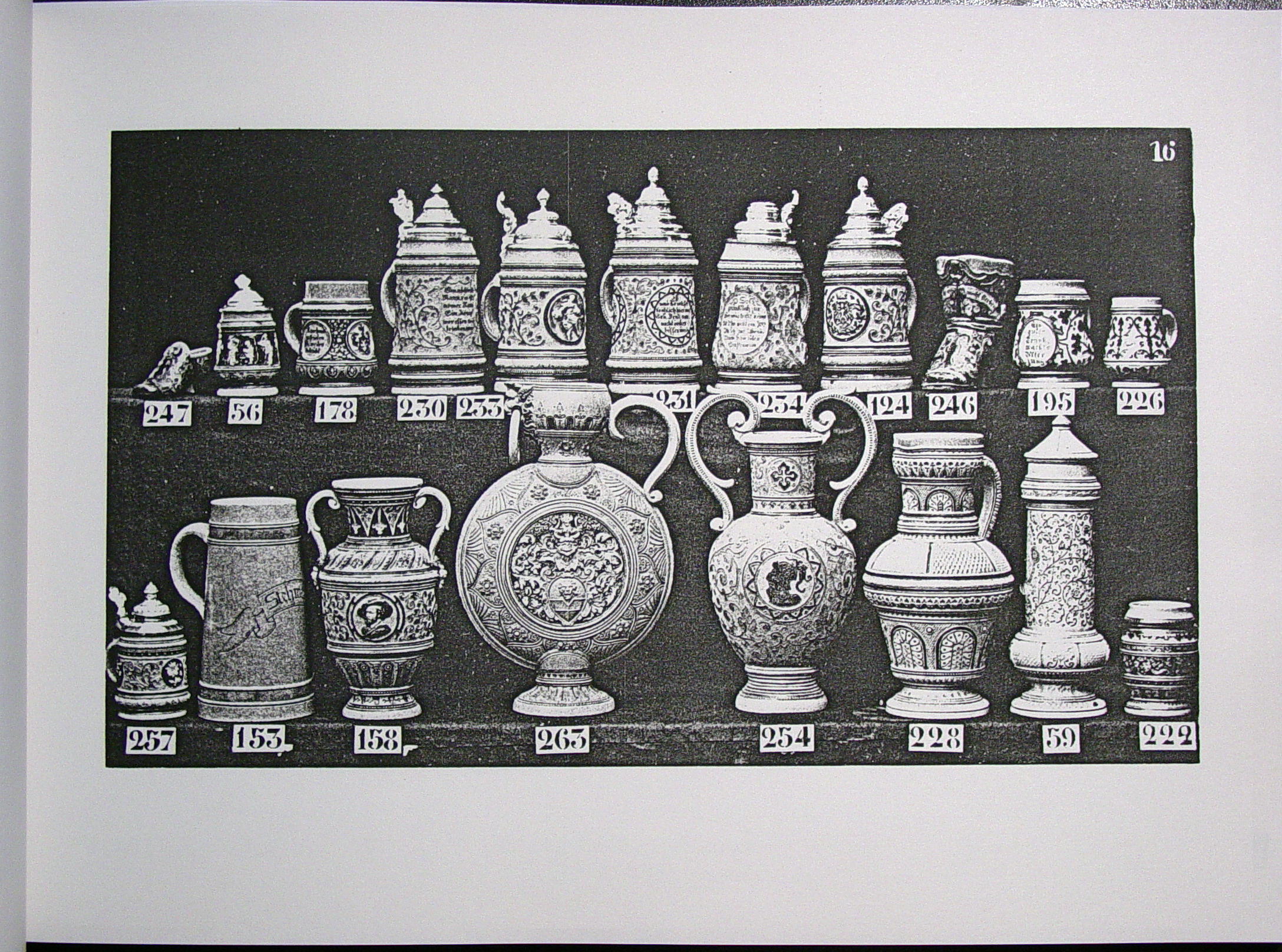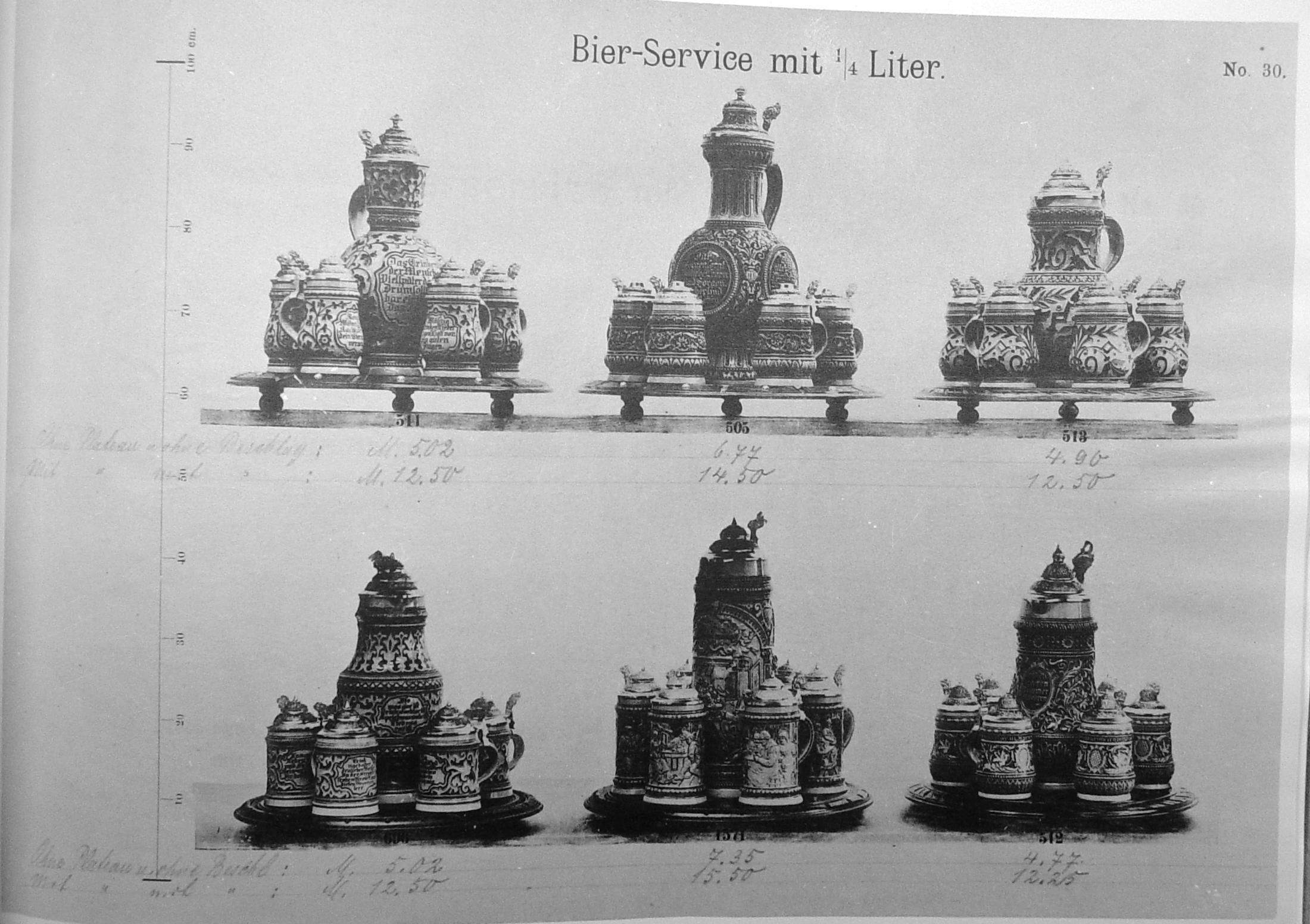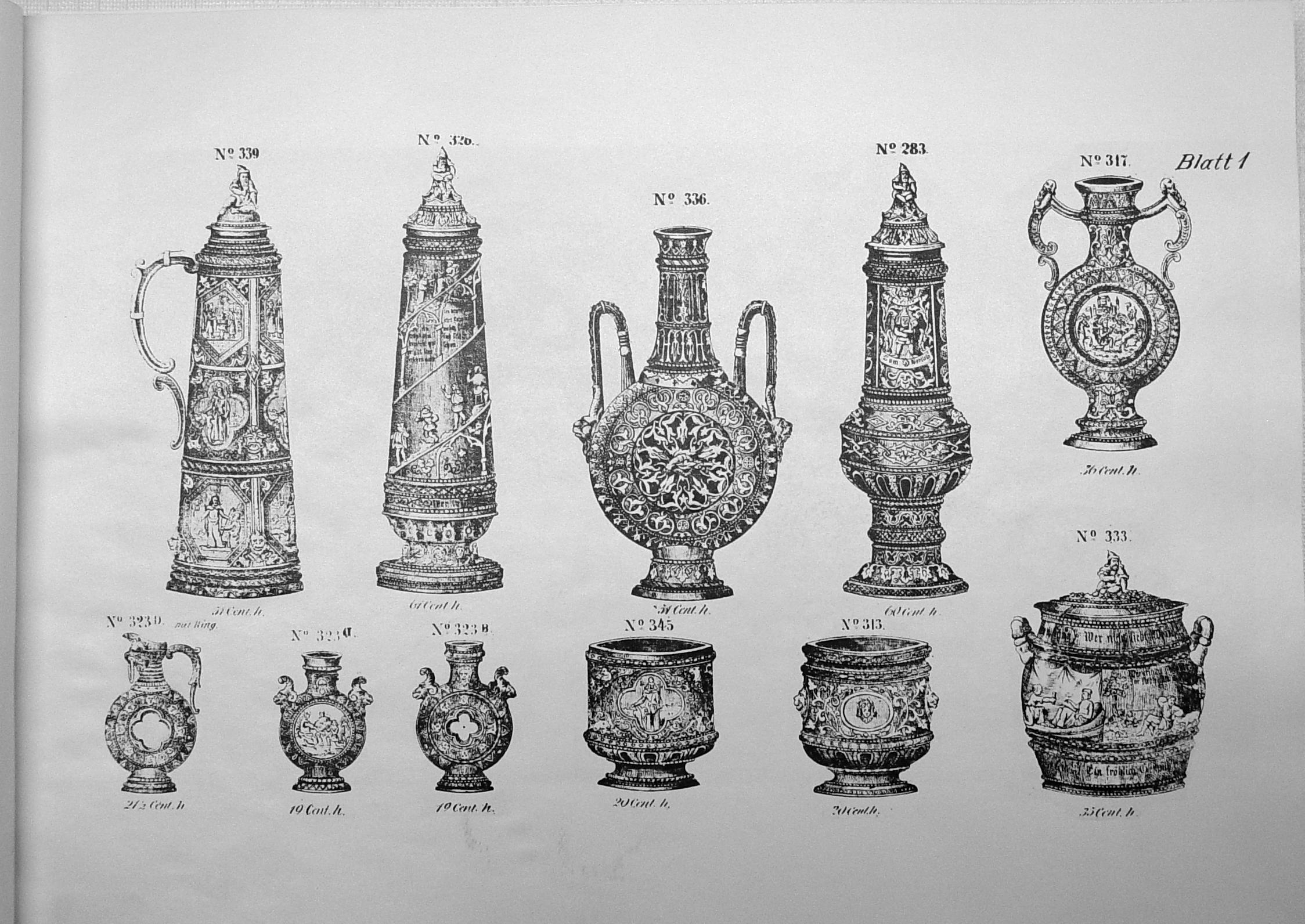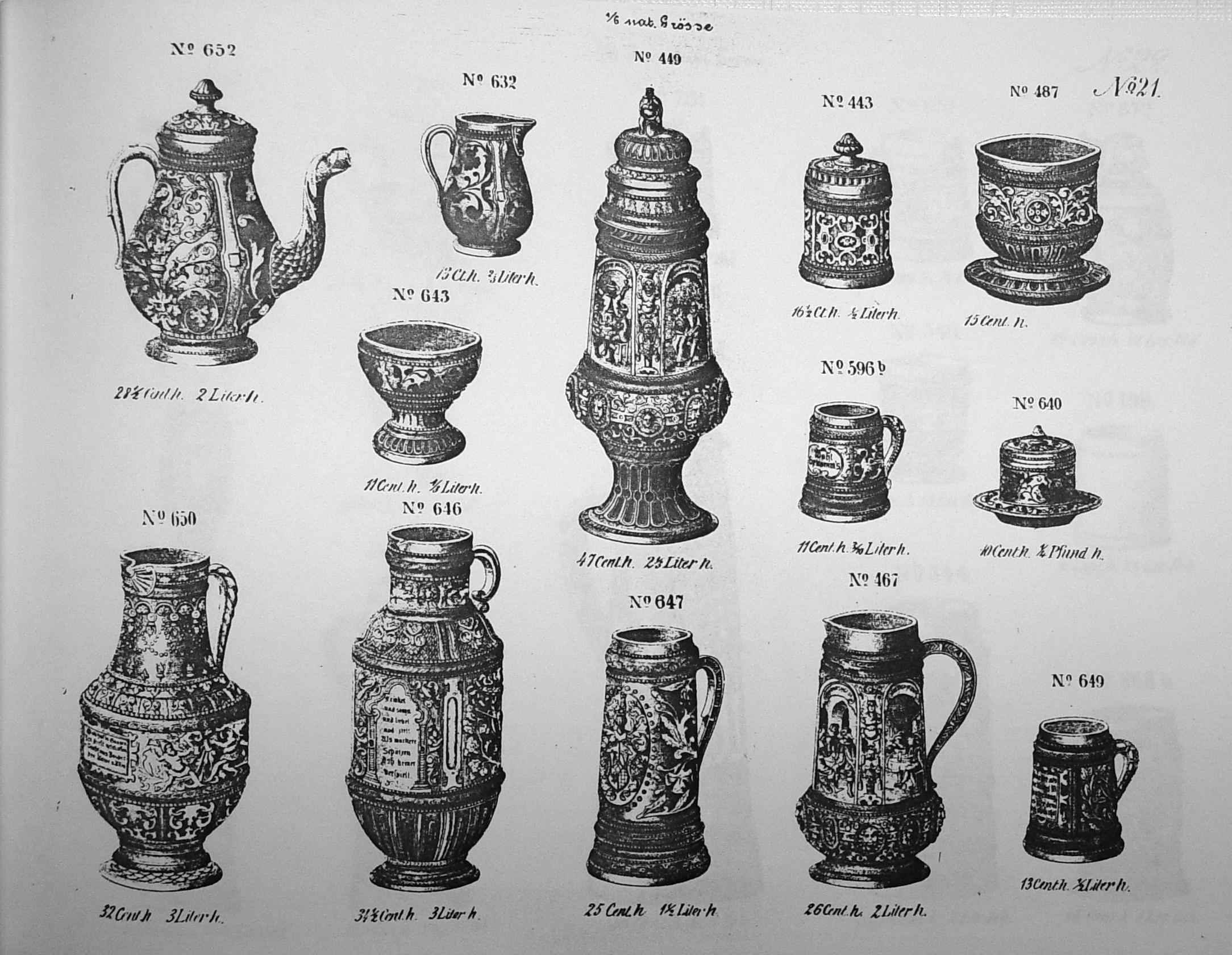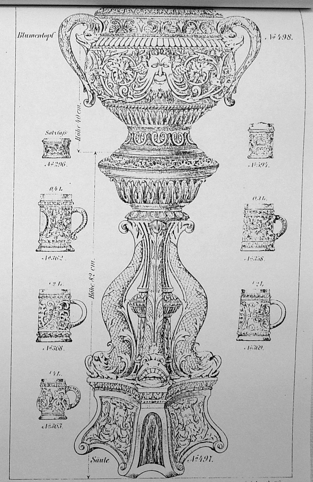 Who made this stein? Using available original manufacturers catalogs, this page allows you to look up possible answers to that question. Mold numbers beginning with 1 and ranging into the thousands appear in the first column below. For each mold number, the manufacturers who produced an item with that number are listed, along with a link to an original catalog page showing that item. Scroll down to the mold number in question, then examine the catalog pages to confirm the manufacturer of your stein.