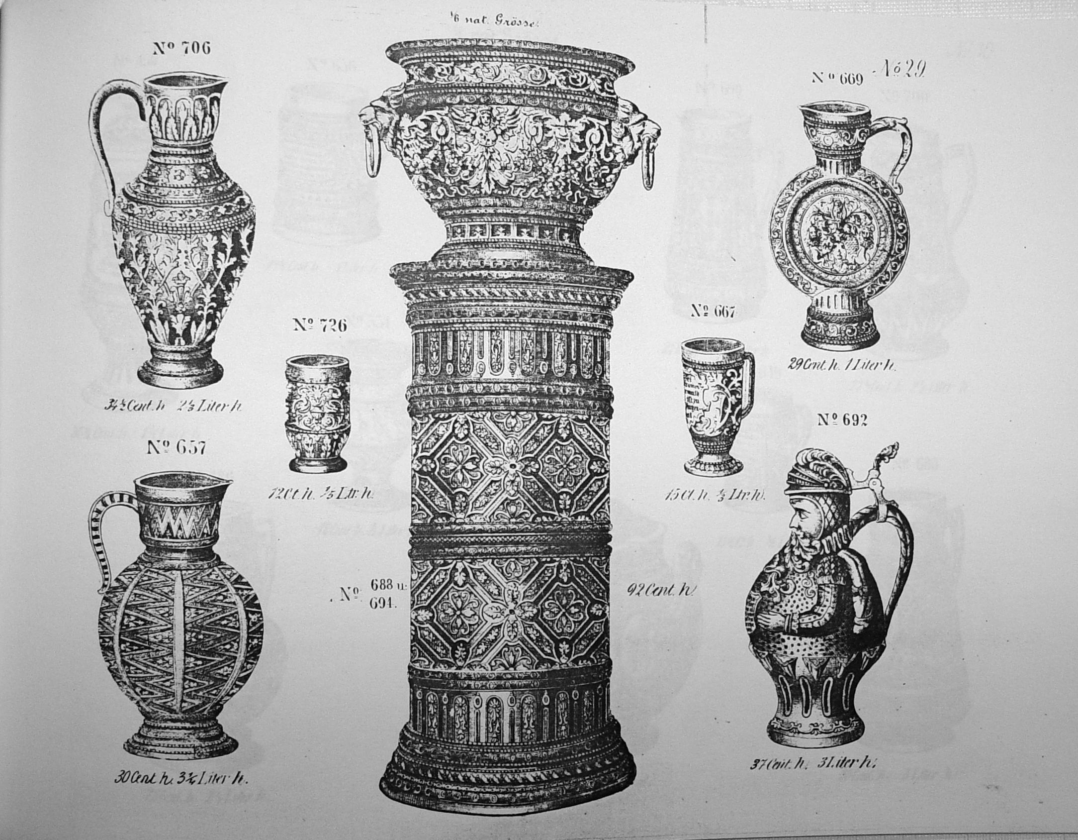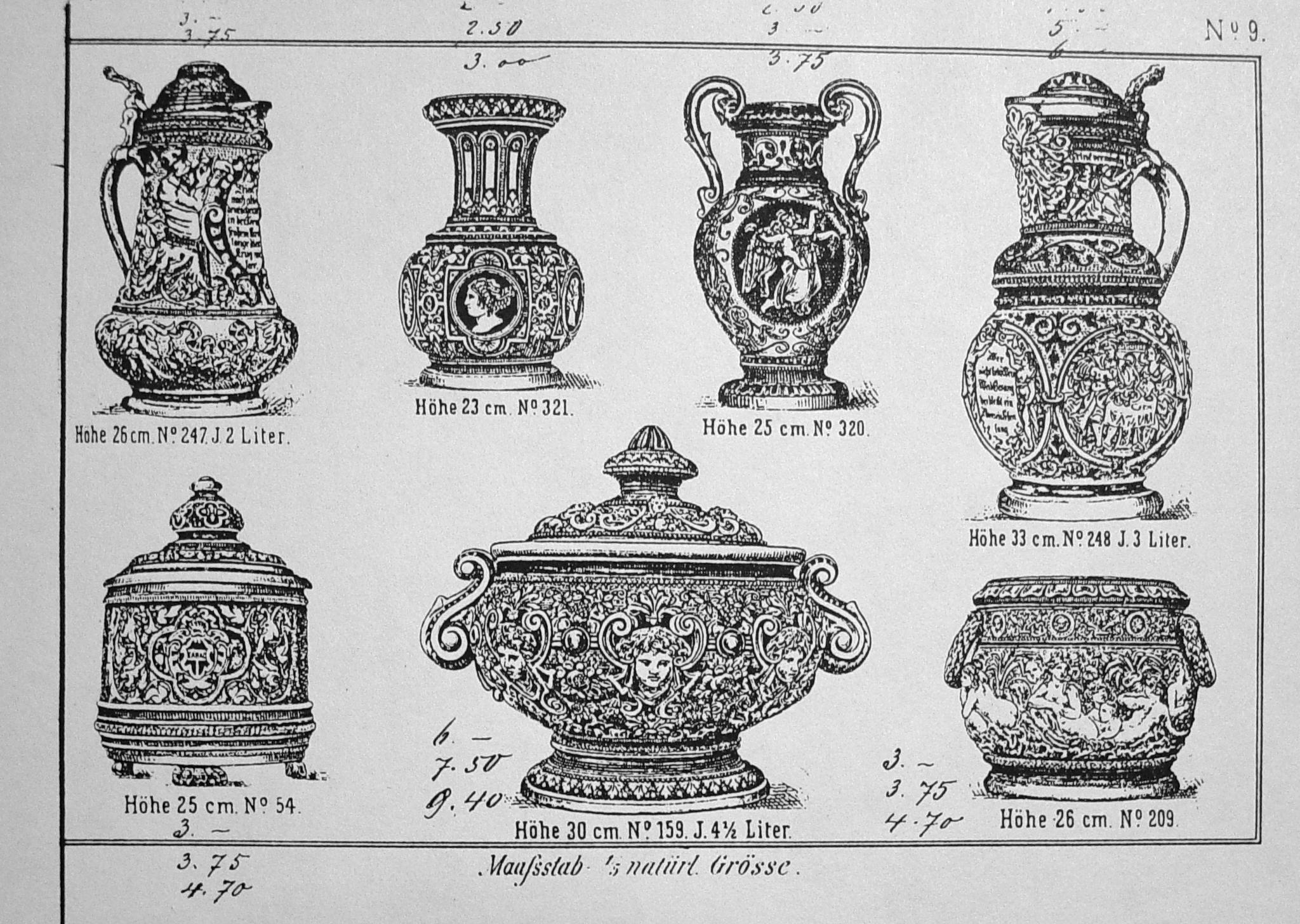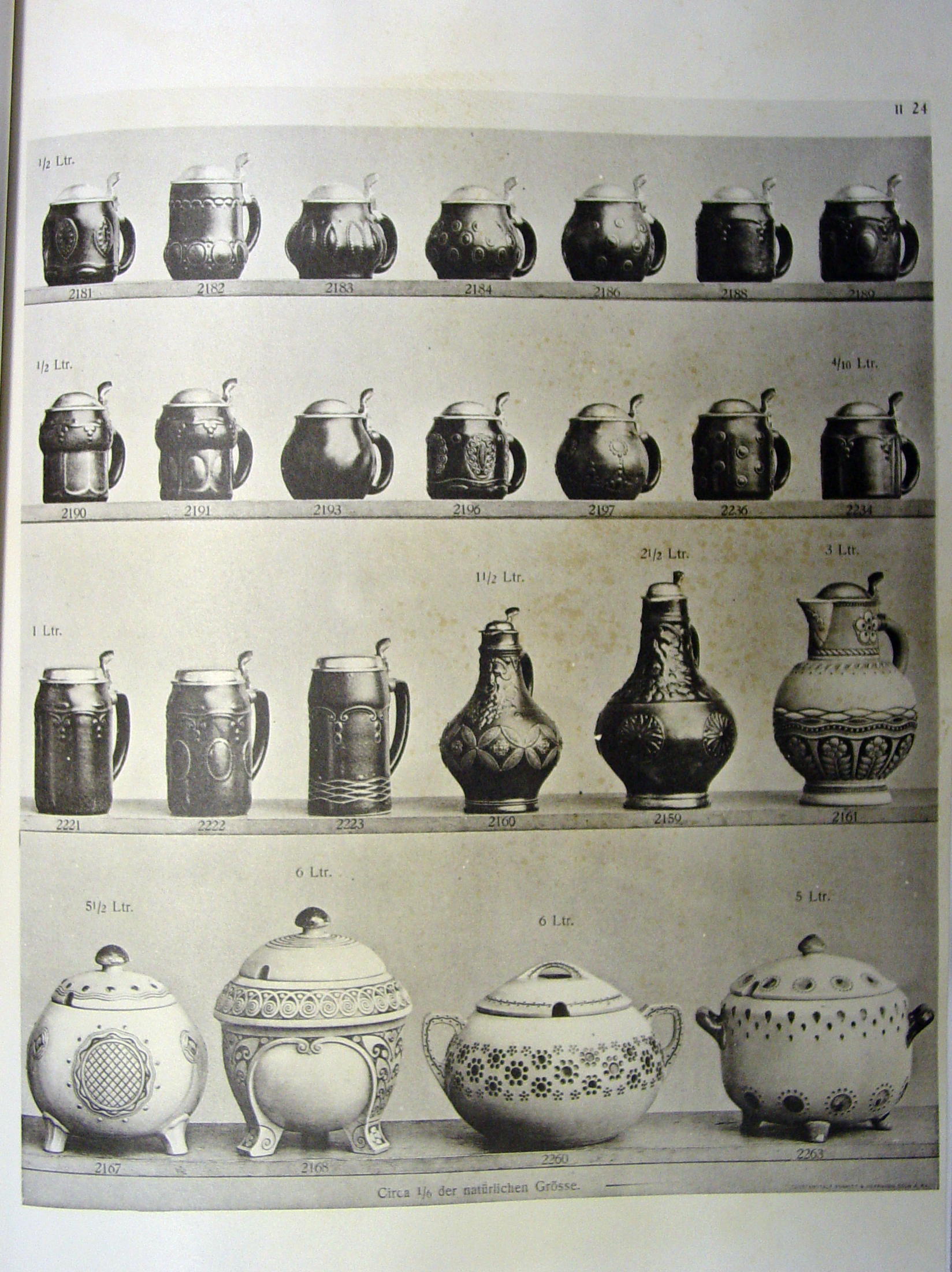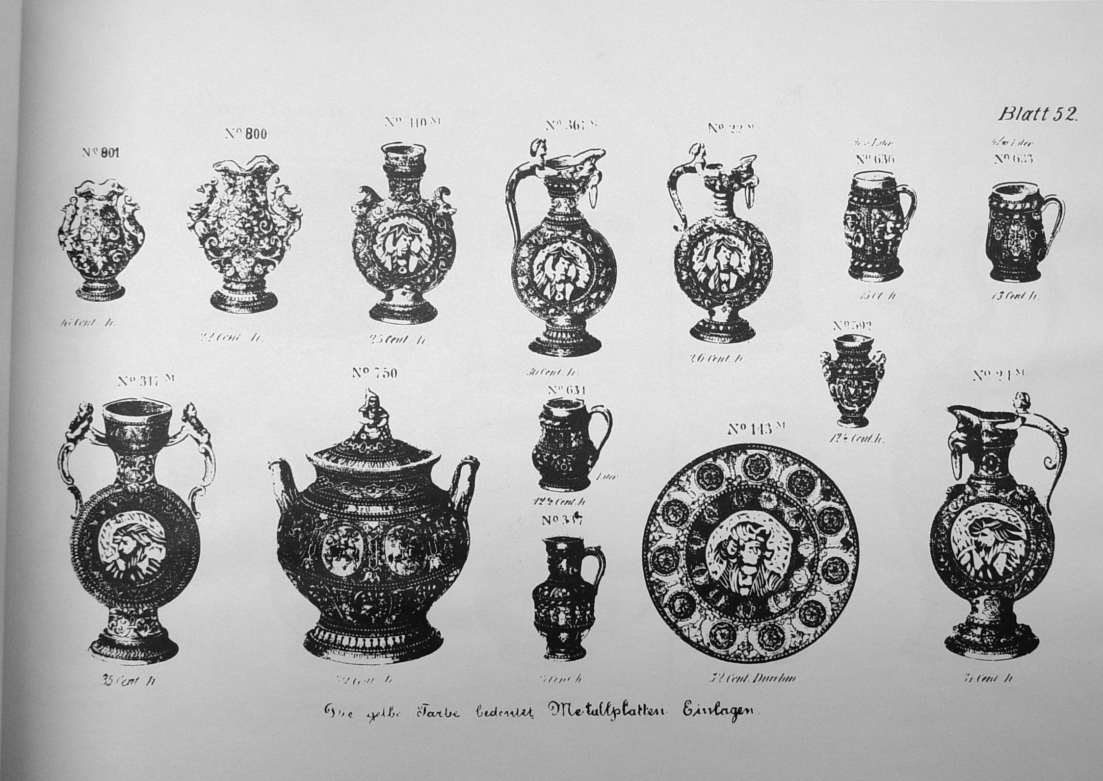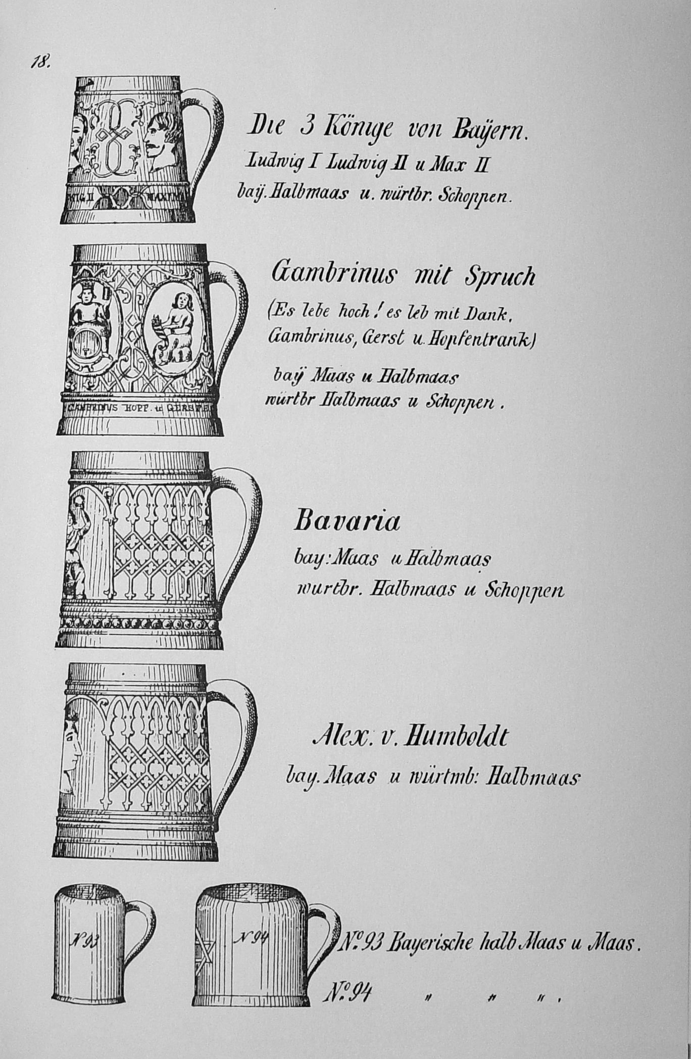 Who made this stein? Using available original manufacturers catalogs, this page allows you to look up possible answers to that question. Mold numbers beginning with 1 and ranging into the thousands appear in the first column below. For each mold number, the manufacturers who produced an item with that number are listed, along with a link to an original catalog page showing that item. Scroll down to the mold number in question, then examine the catalog pages to confirm the manufacturer of your stein.