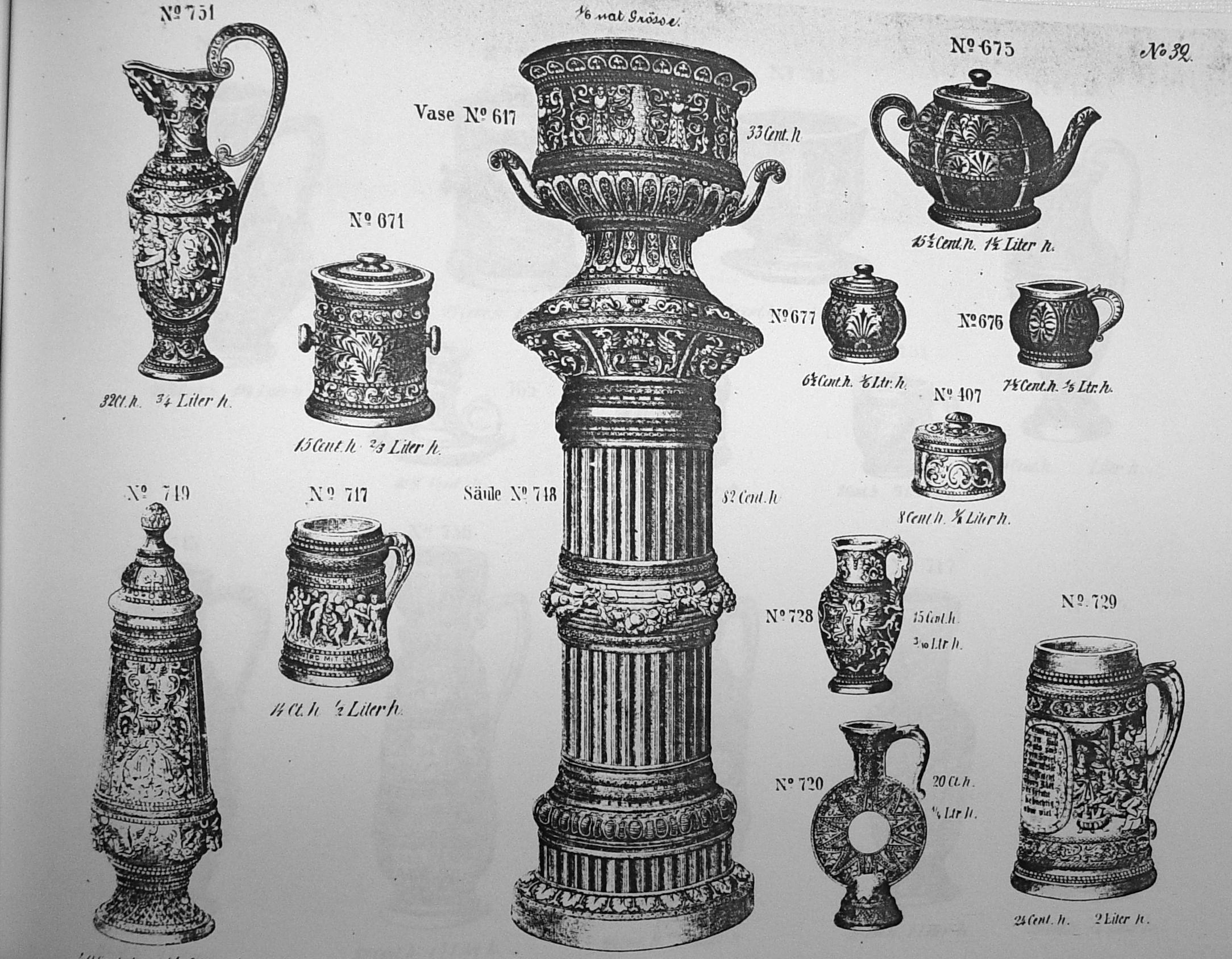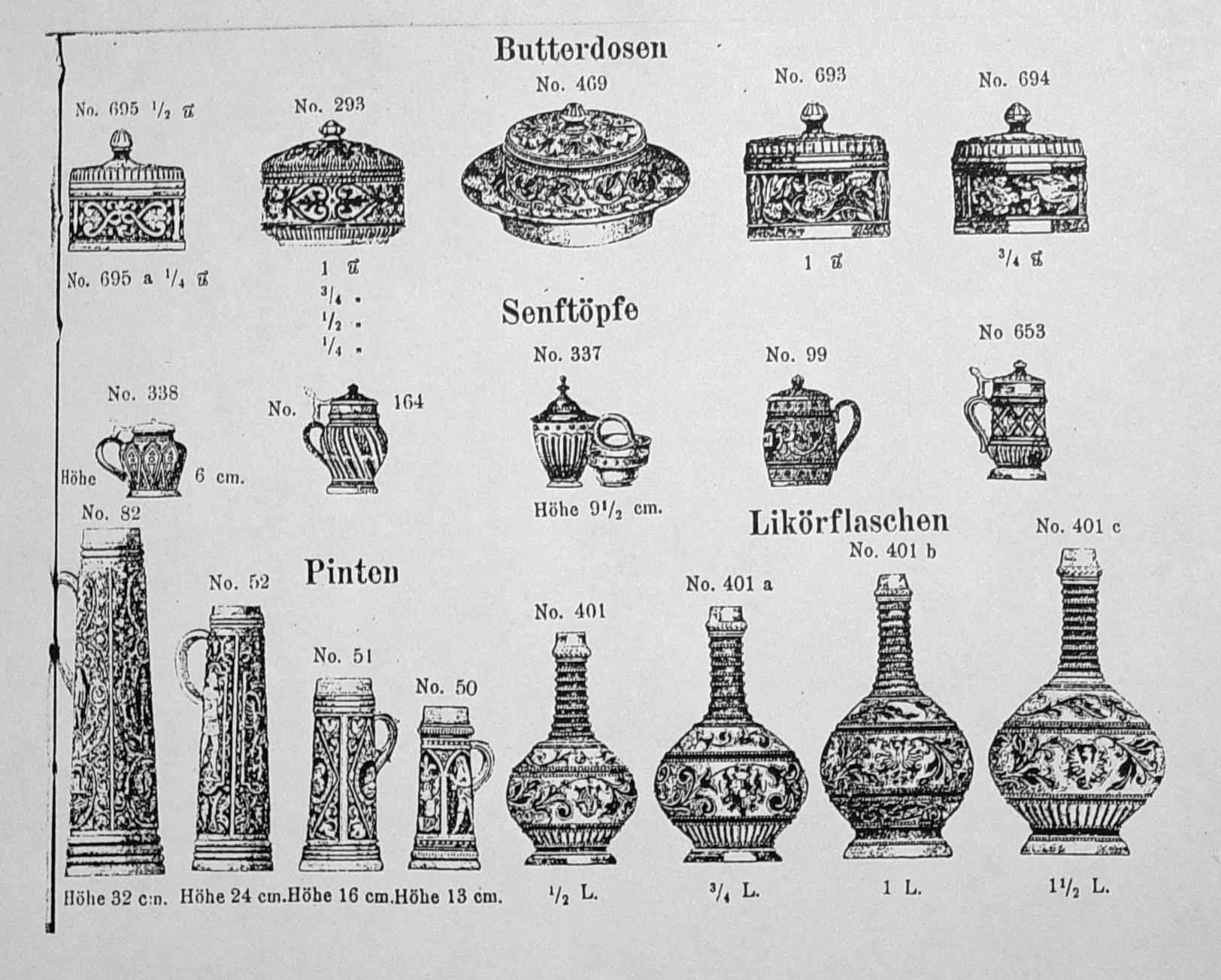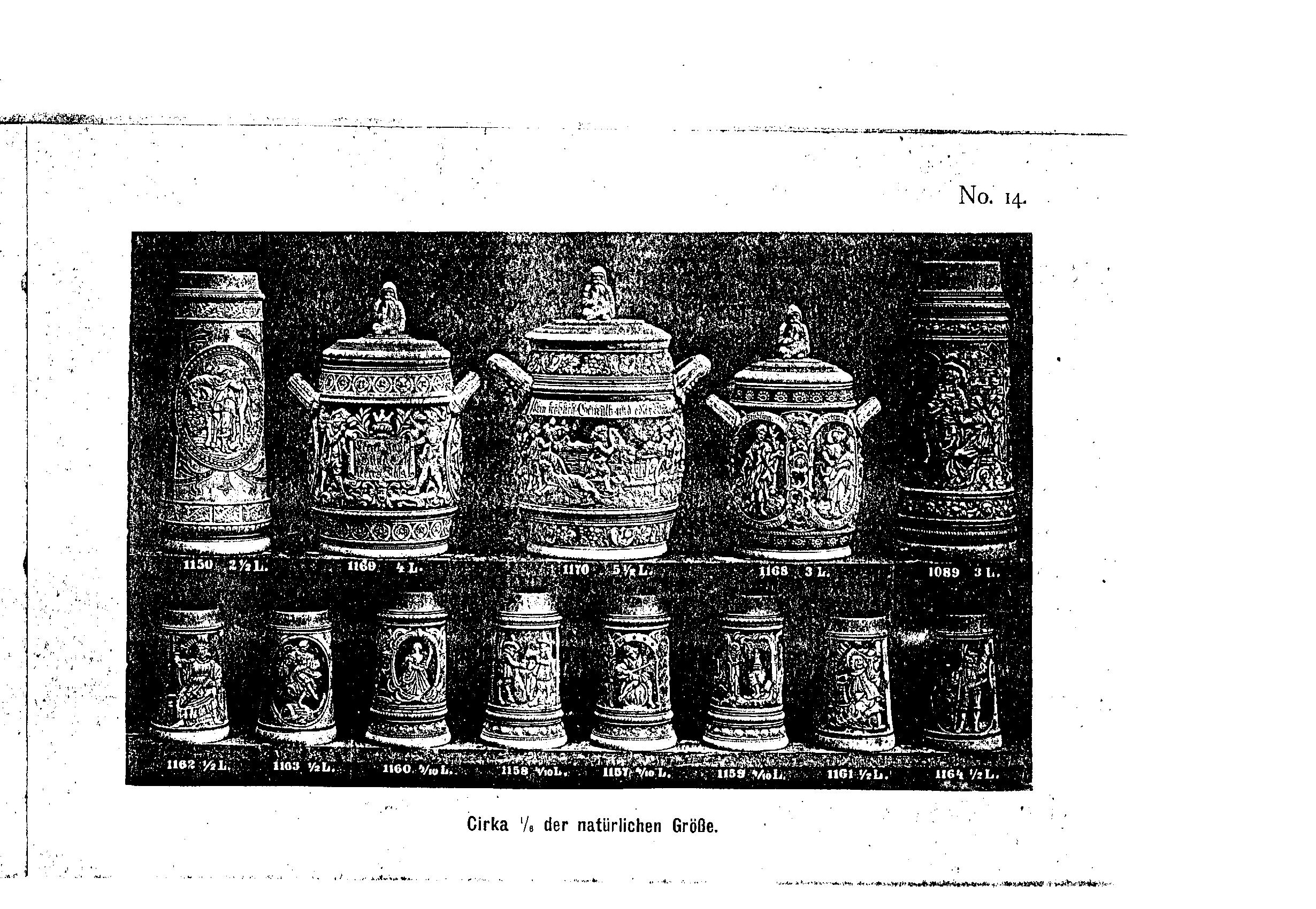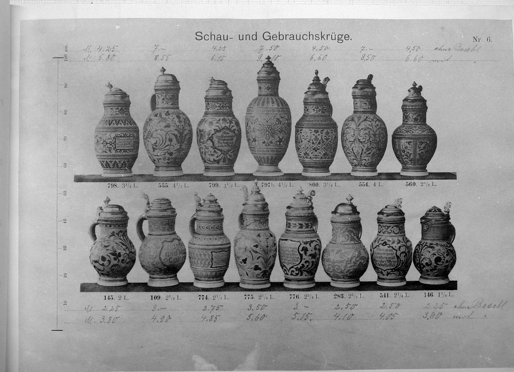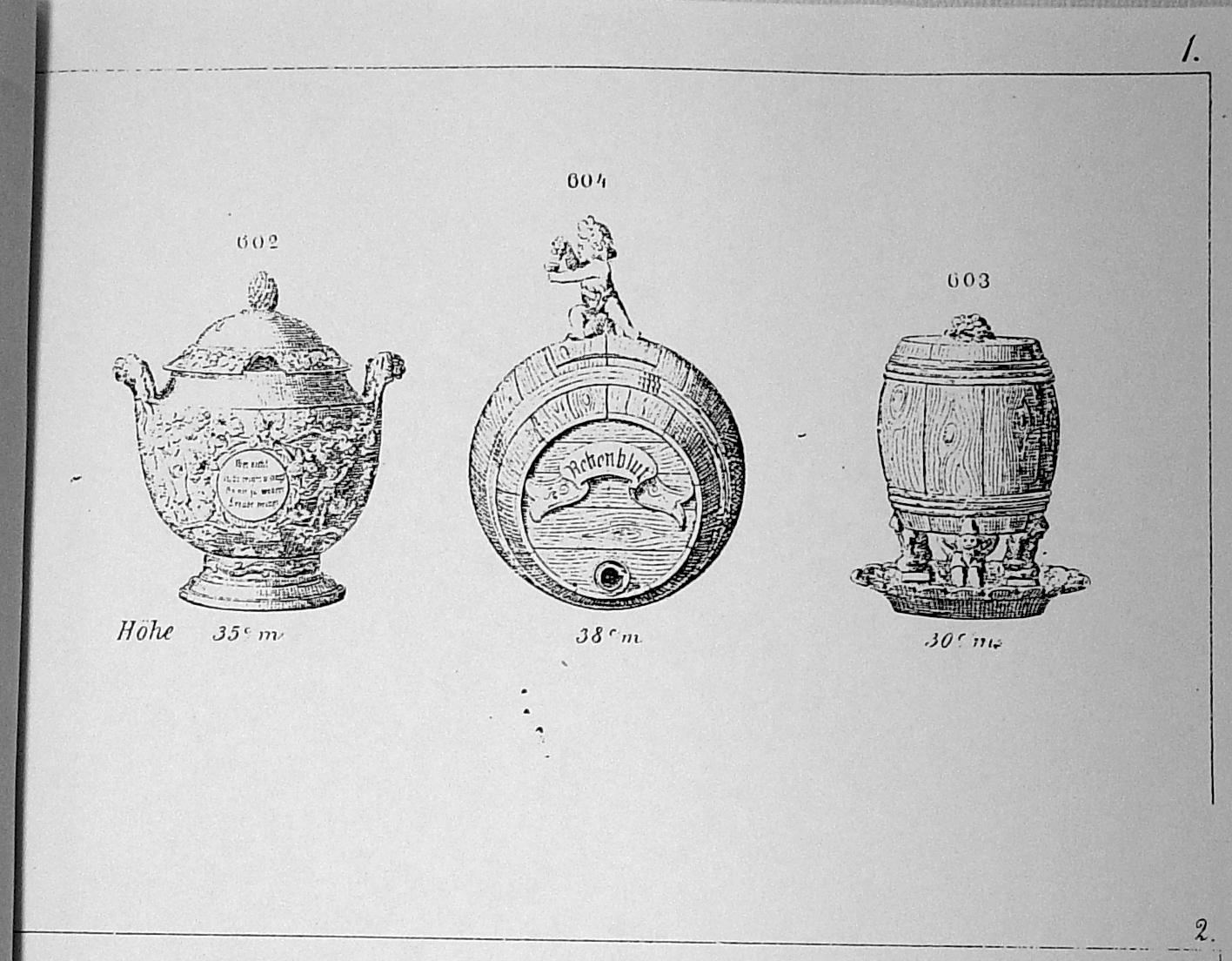 Who made this stein? Using available original manufacturers catalogs, this page allows you to look up possible answers to that question. Mold numbers beginning with 1 and ranging into the thousands appear in the first column below. For each mold number, the manufacturers who produced an item with that number are listed, along with a link to an original catalog page showing that item. Scroll down to the mold number in question, then examine the catalog pages to confirm the manufacturer of your stein.