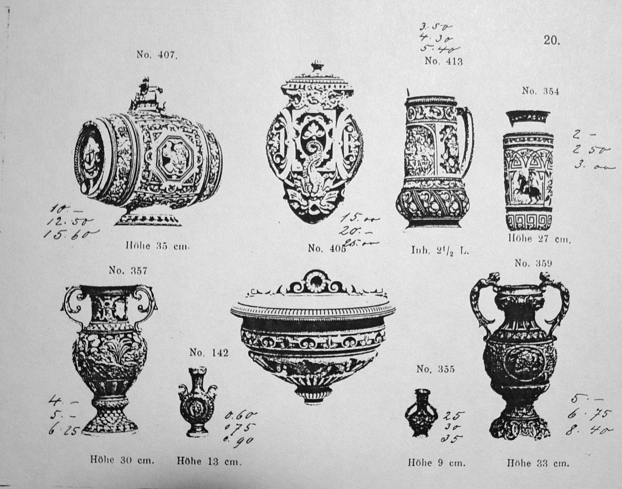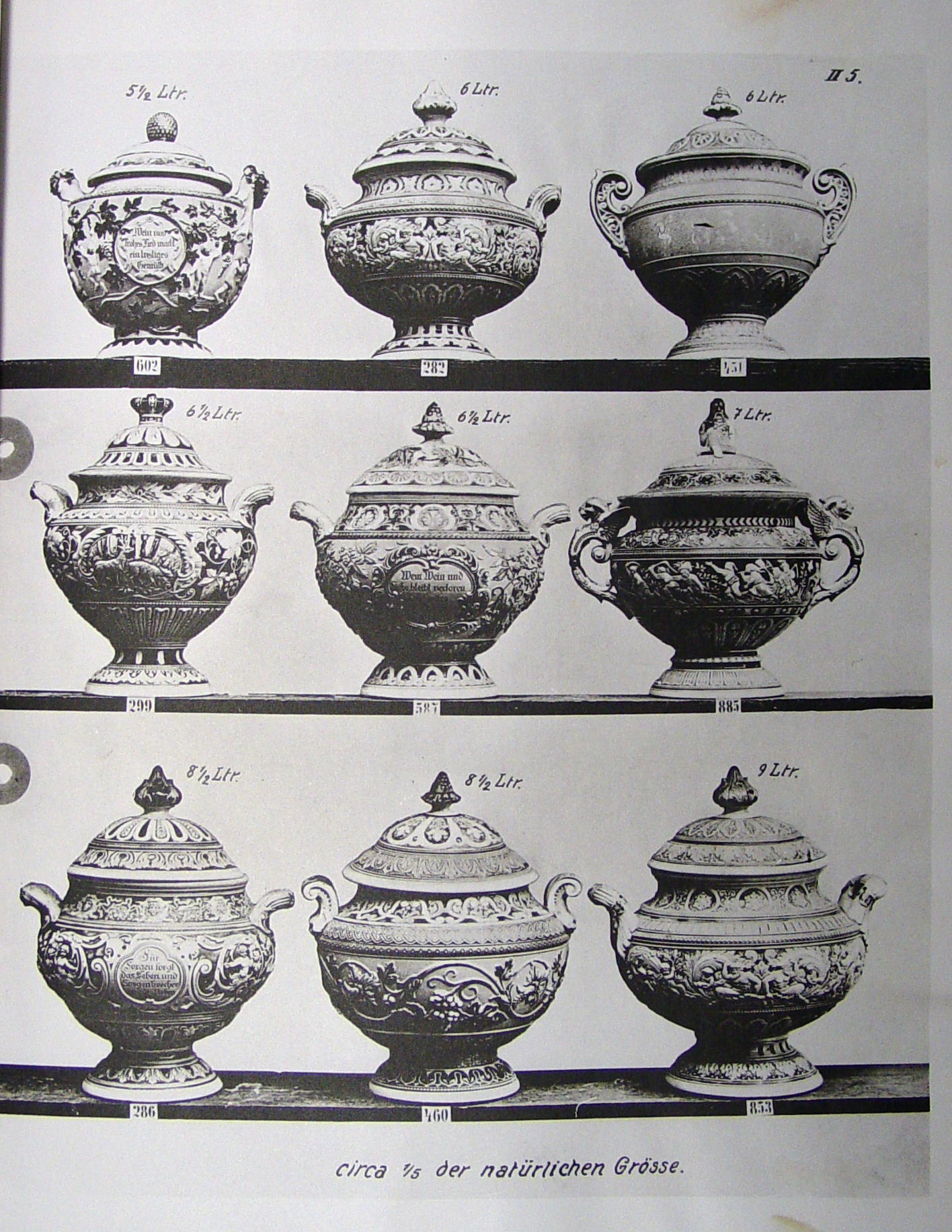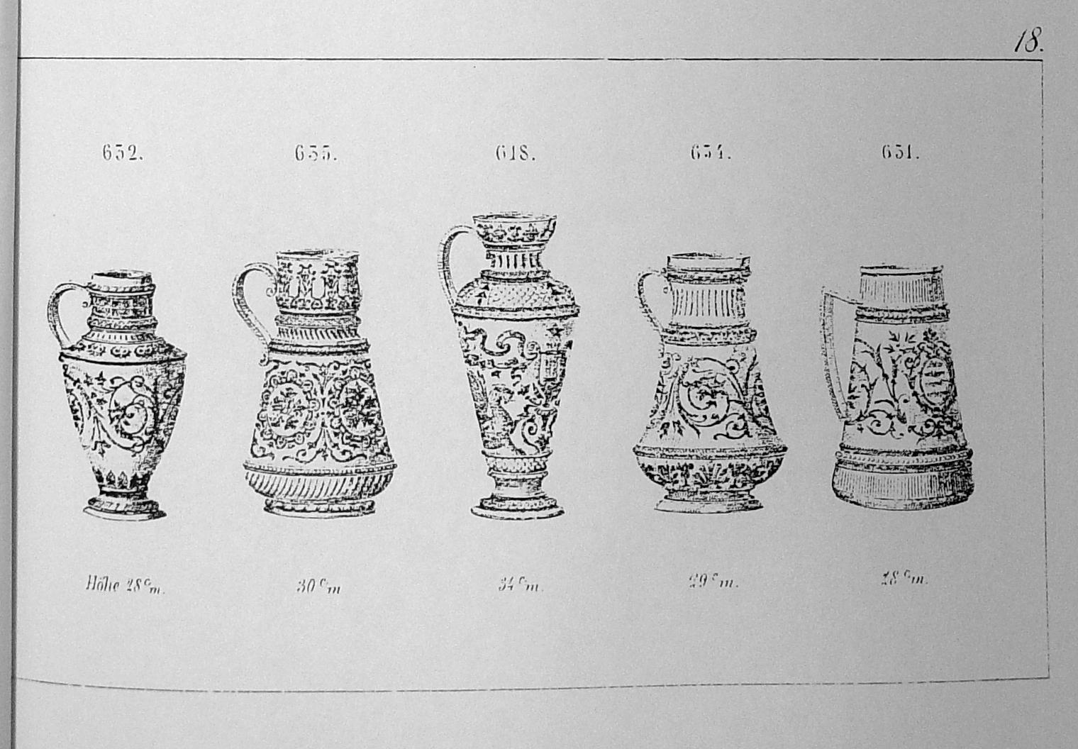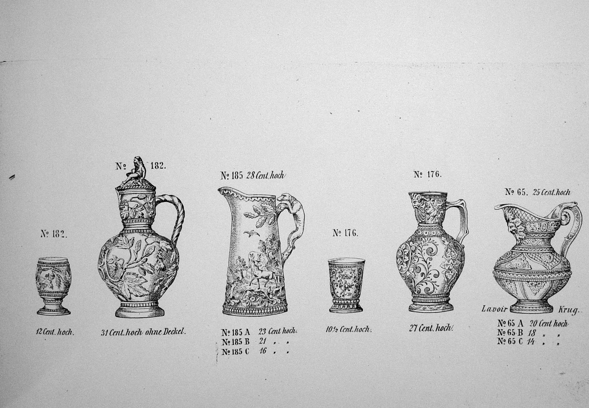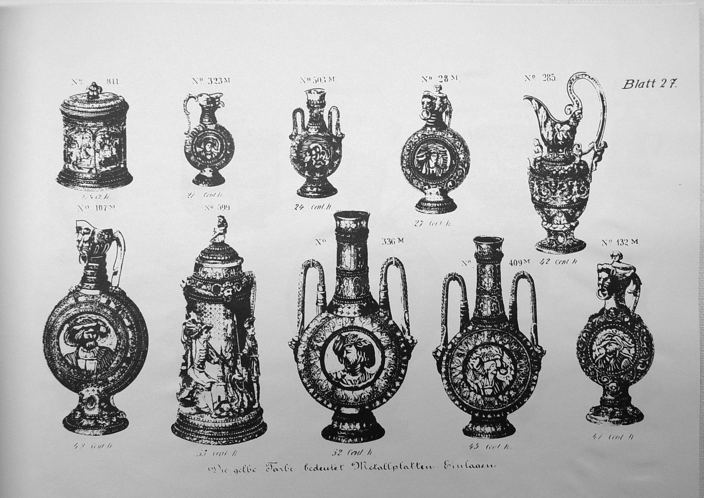 Who made this stein? Using available original manufacturers catalogs, this page allows you to look up possible answers to that question. Mold numbers beginning with 1 and ranging into the thousands appear in the first column below. For each mold number, the manufacturers who produced an item with that number are listed, along with a link to an original catalog page showing that item. Scroll down to the mold number in question, then examine the catalog pages to confirm the manufacturer of your stein.