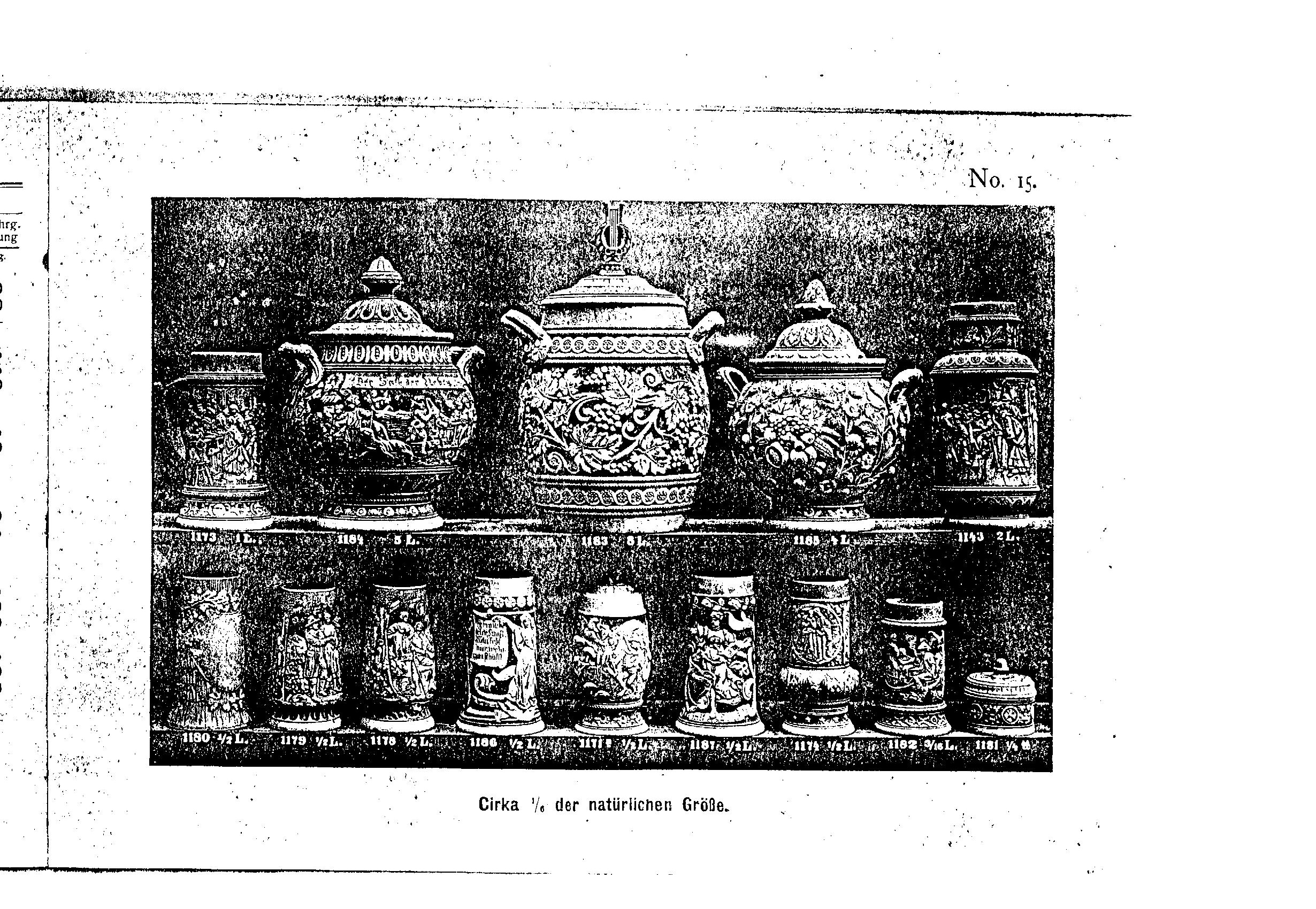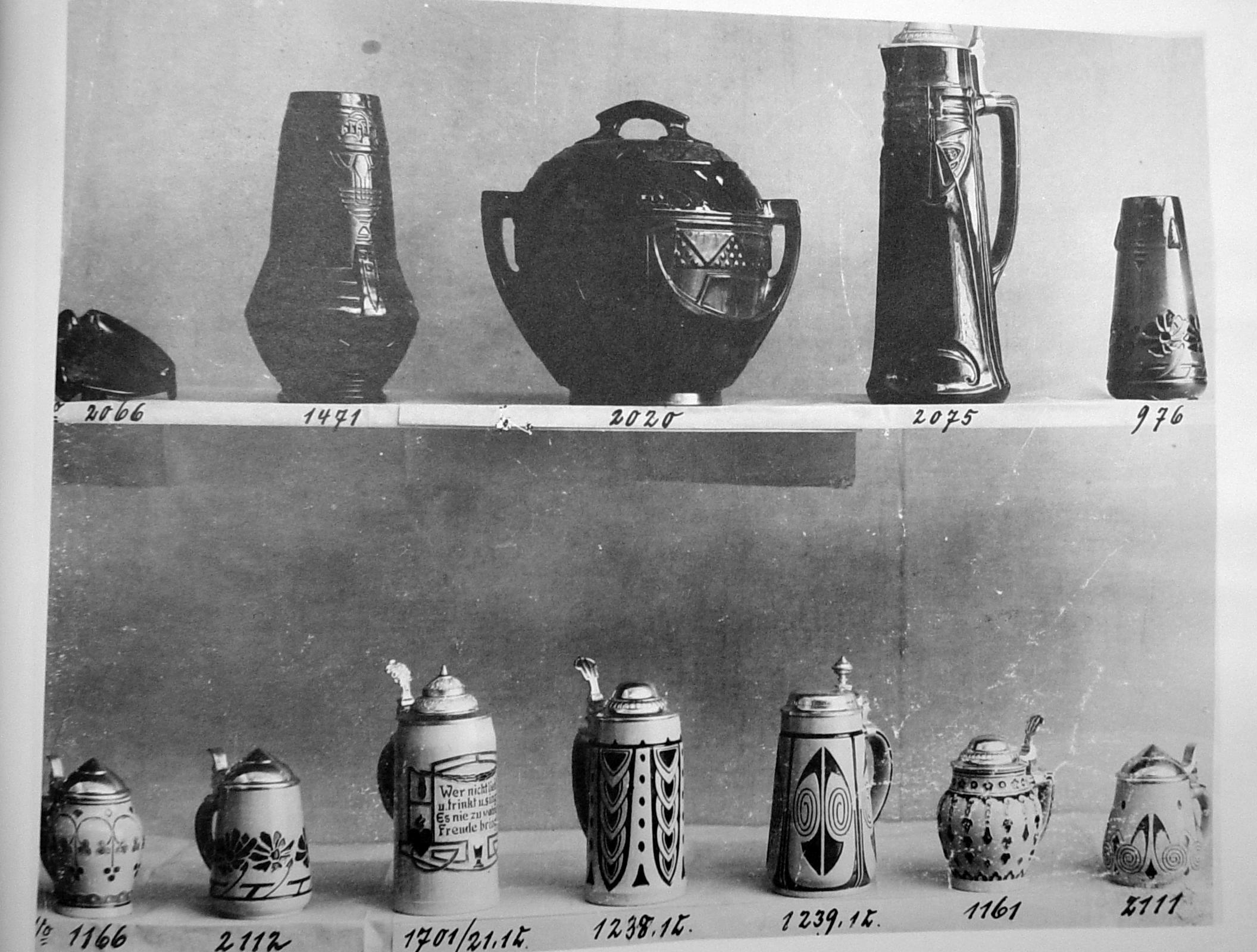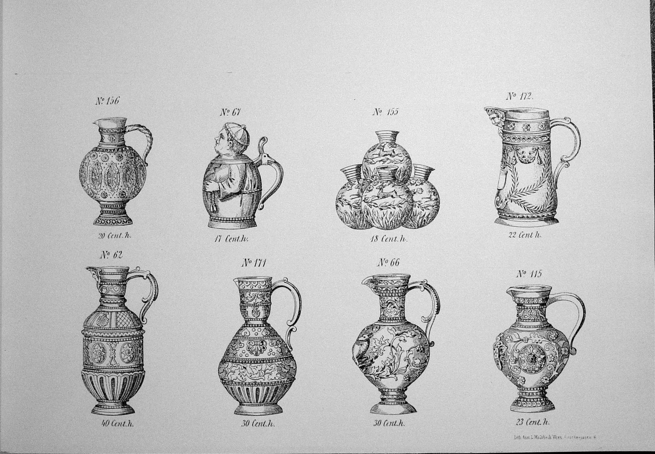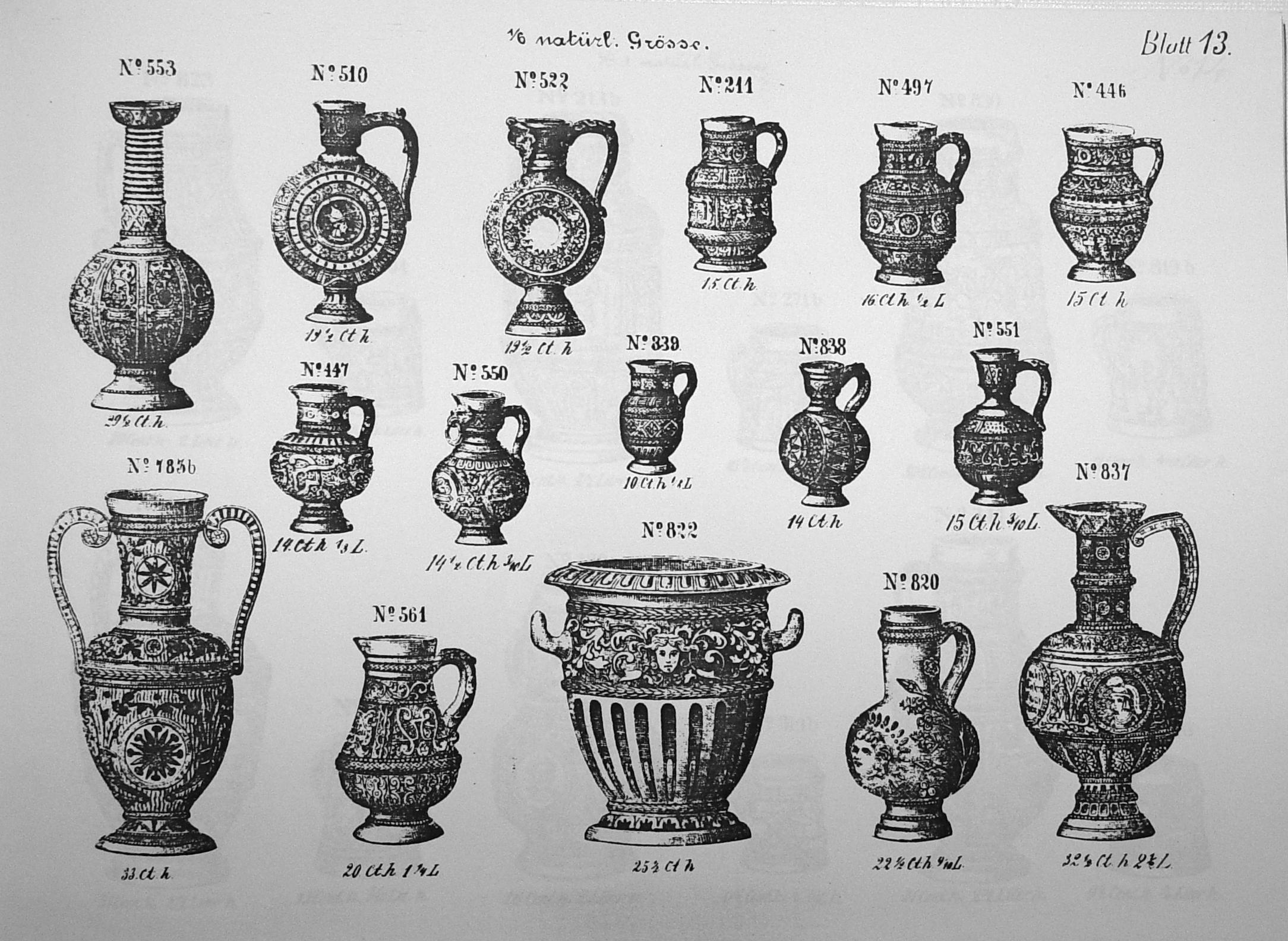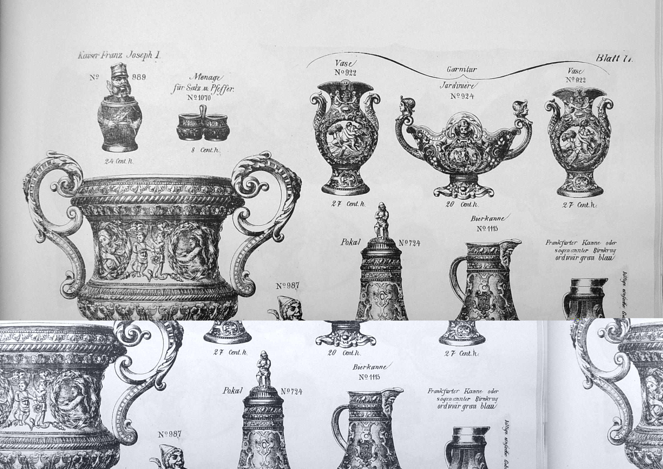 Who made this stein? Using available original manufacturers catalogs, this page allows you to look up possible answers to that question. Mold numbers beginning with 1 and ranging into the thousands appear in the first column below. For each mold number, the manufacturers who produced an item with that number are listed, along with a link to an original catalog page showing that item. Scroll down to the mold number in question, then examine the catalog pages to confirm the manufacturer of your stein.