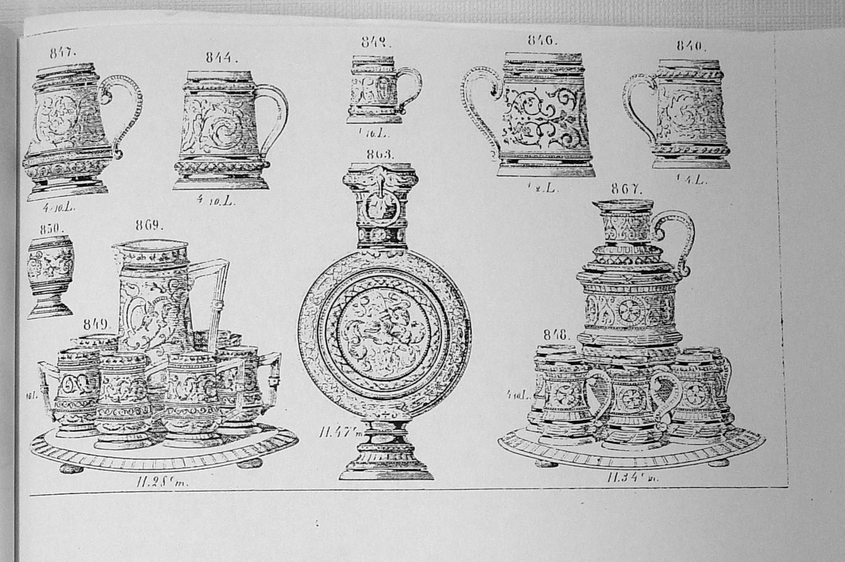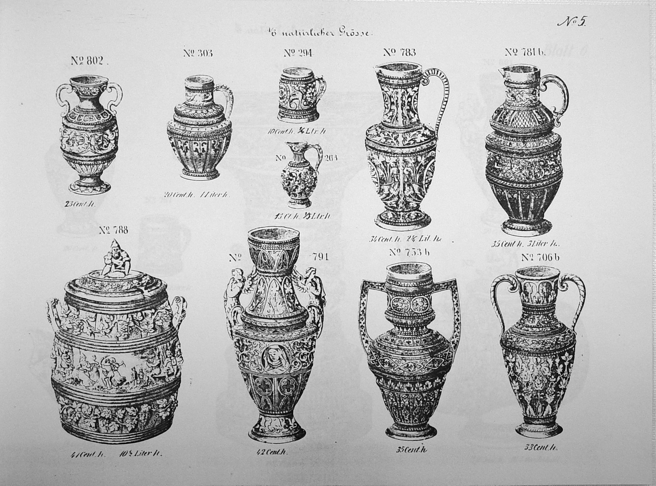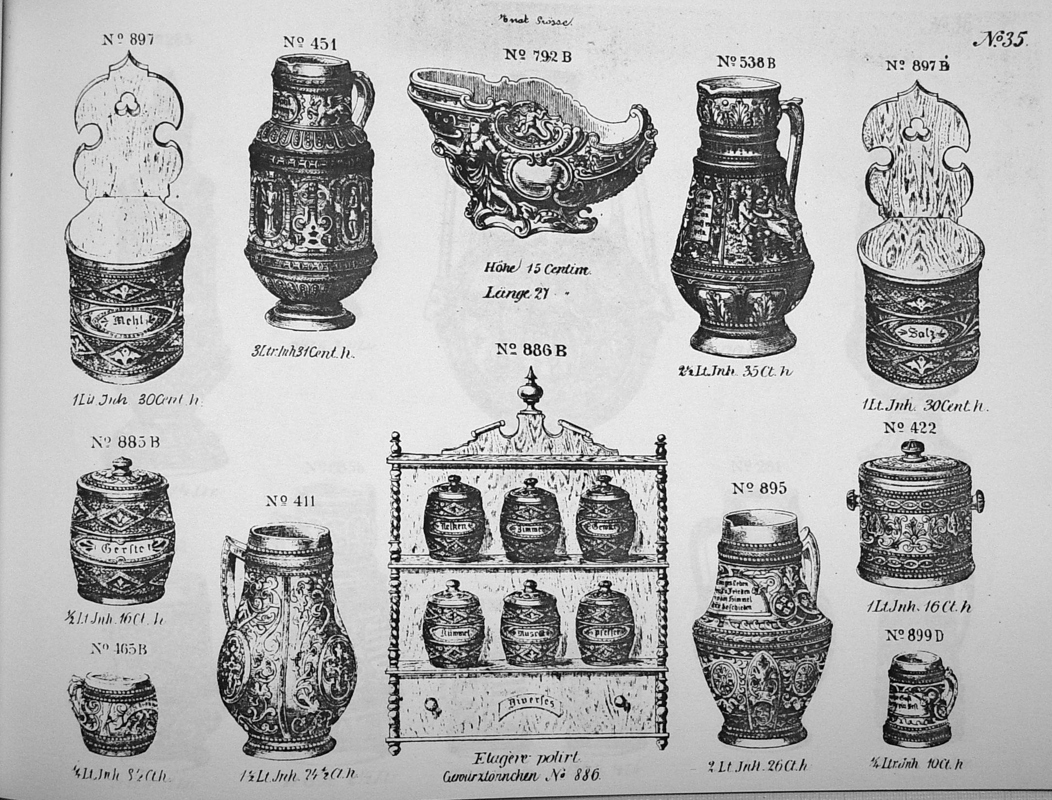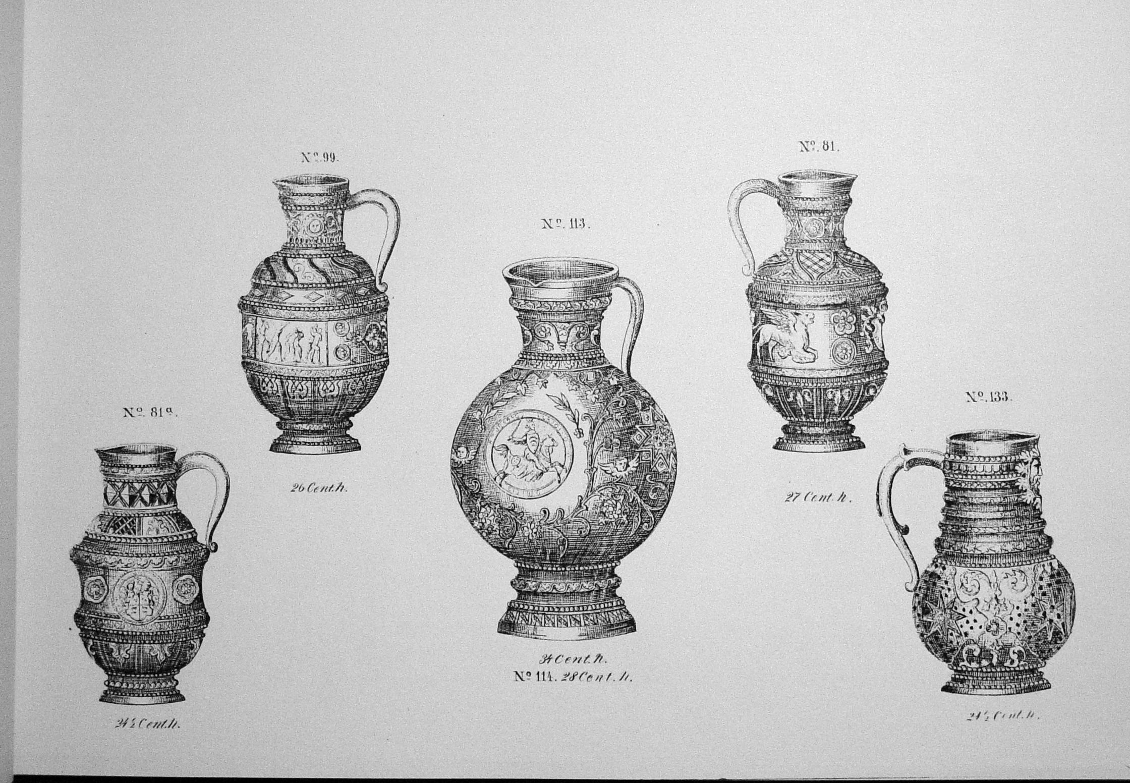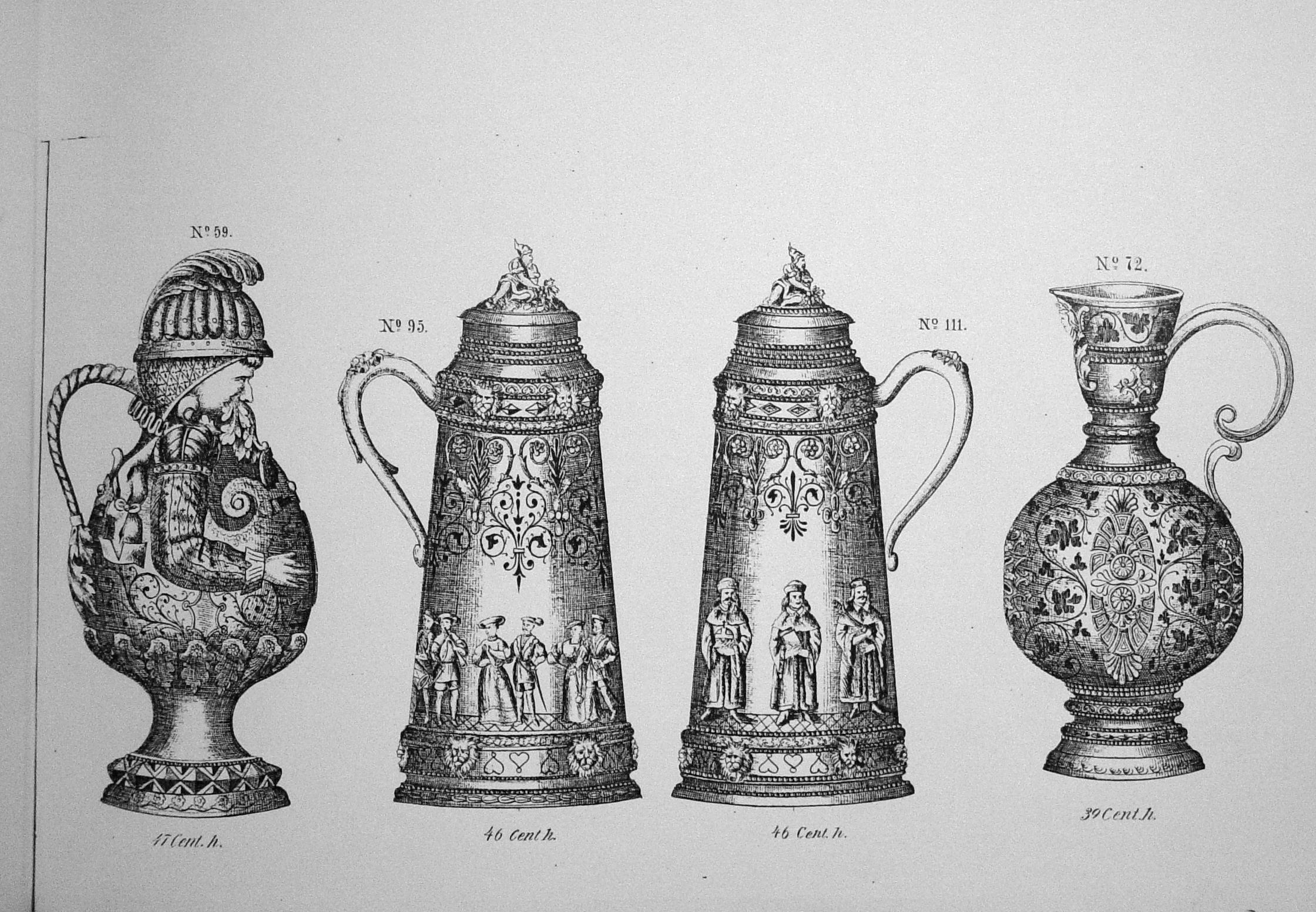 Who made this stein? Using available original manufacturers catalogs, this page allows you to look up possible answers to that question. Mold numbers beginning with 1 and ranging into the thousands appear in the first column below. For each mold number, the manufacturers who produced an item with that number are listed, along with a link to an original catalog page showing that item. Scroll down to the mold number in question, then examine the catalog pages to confirm the manufacturer of your stein.