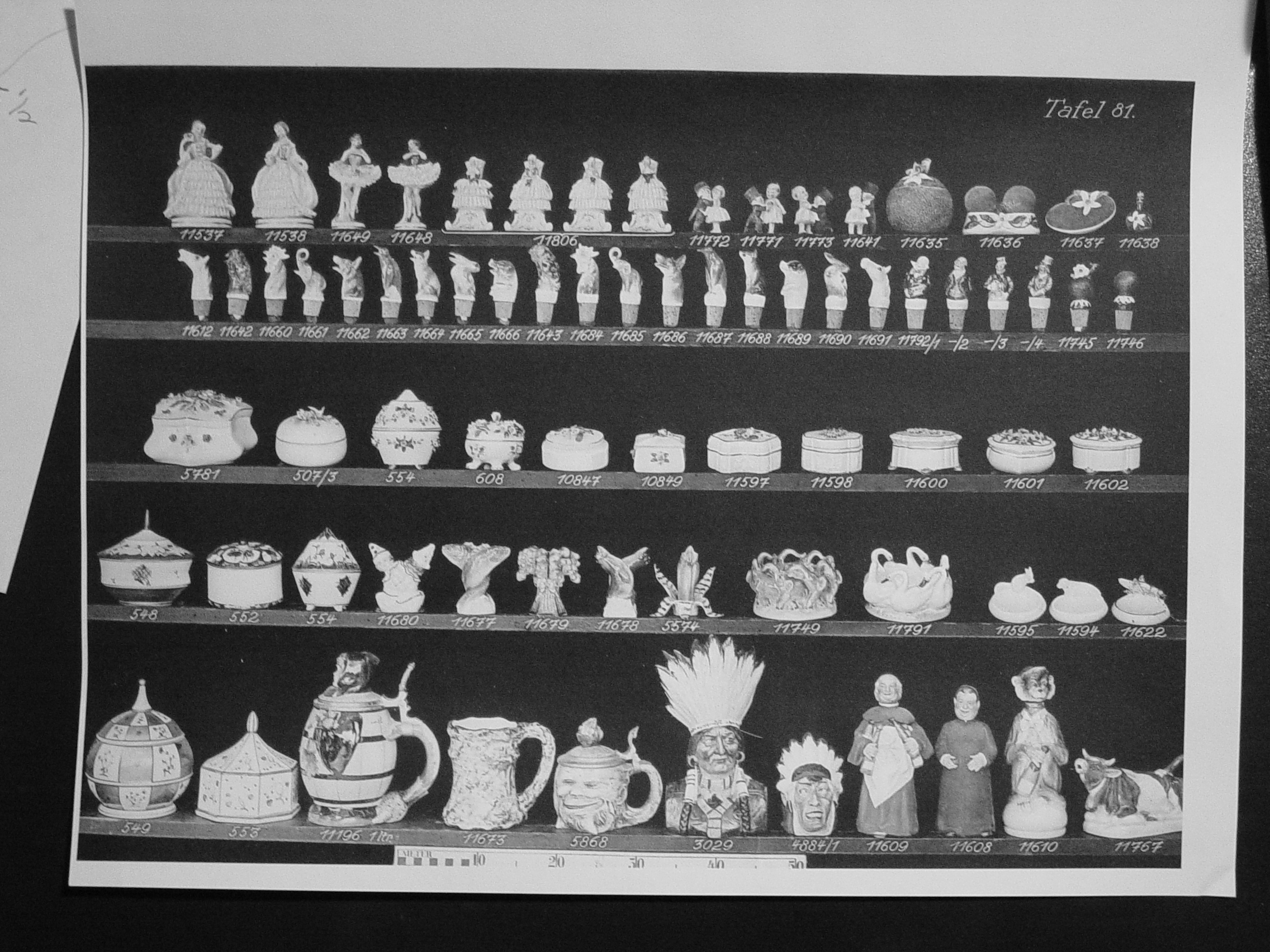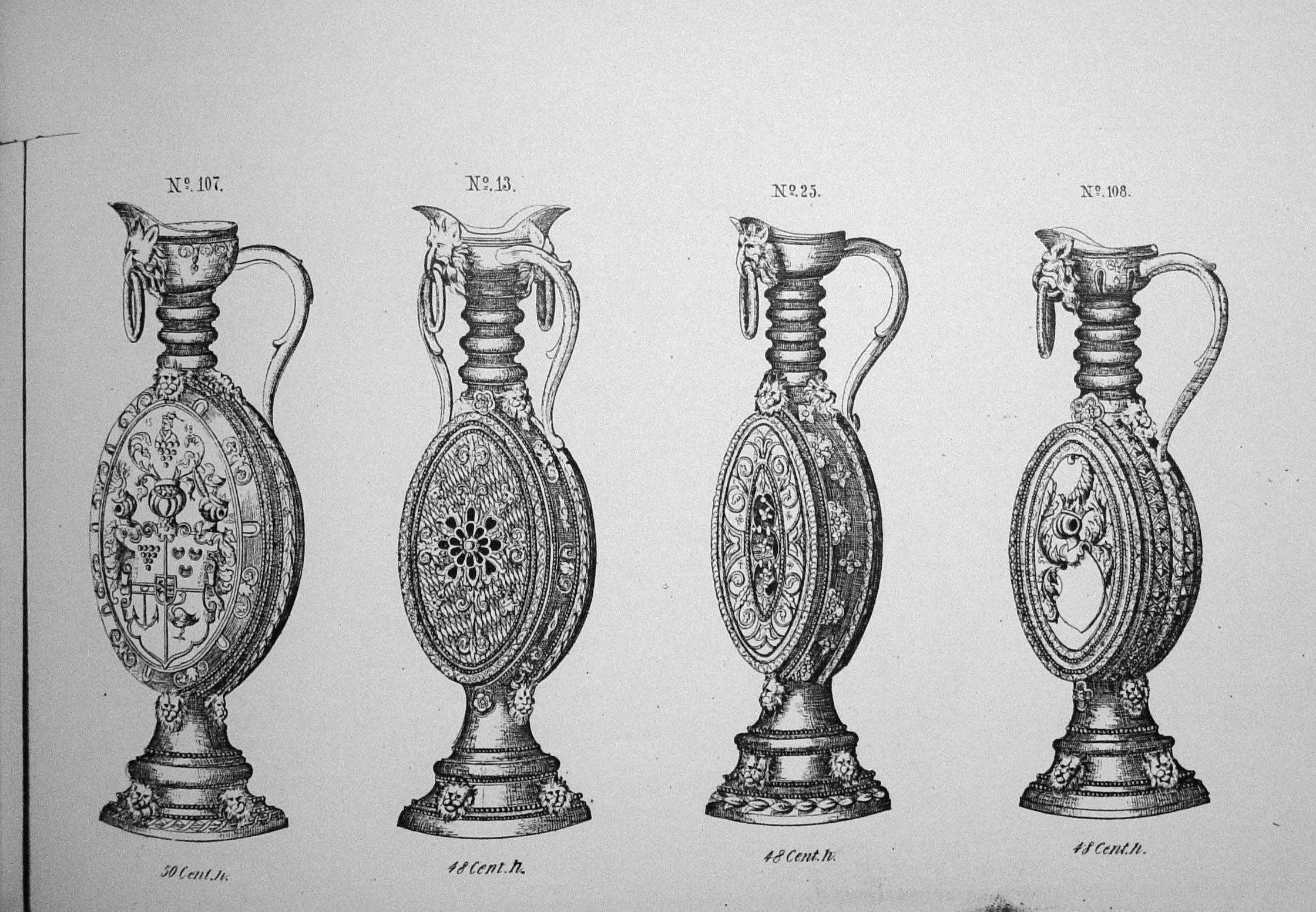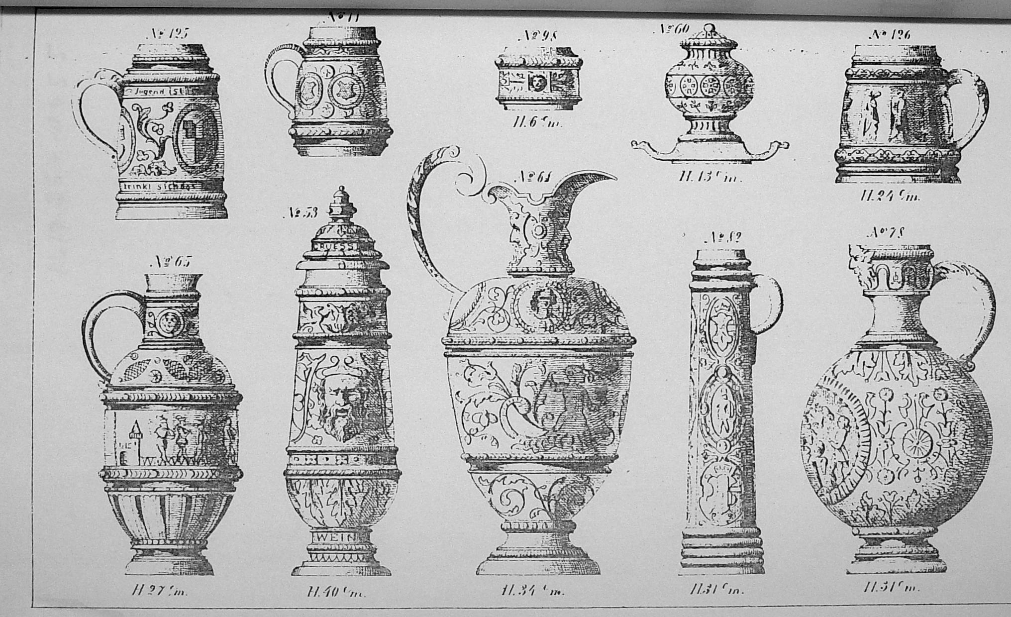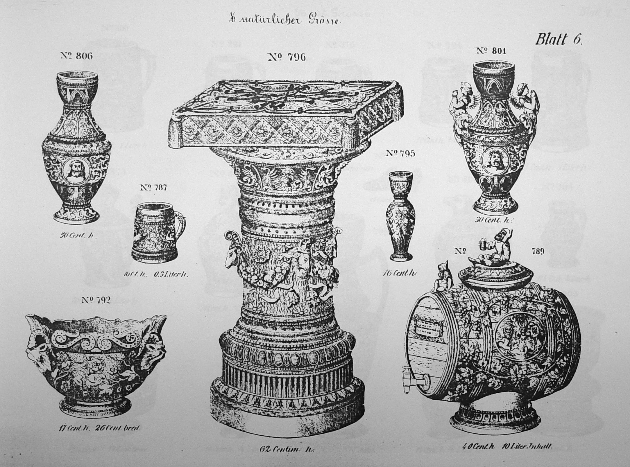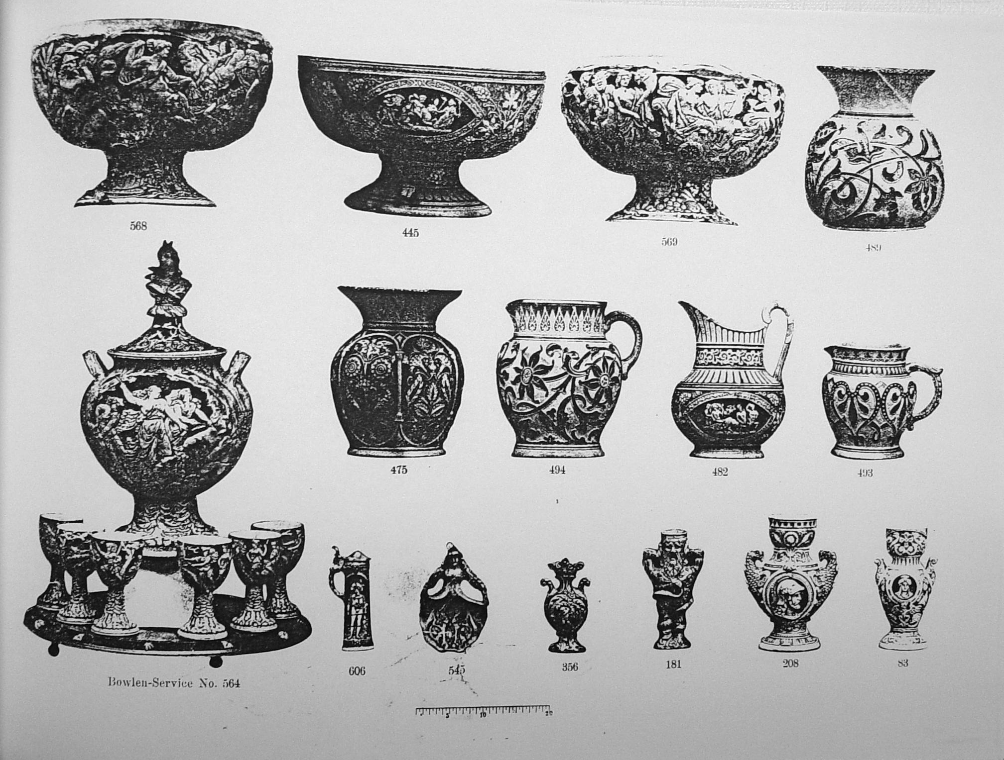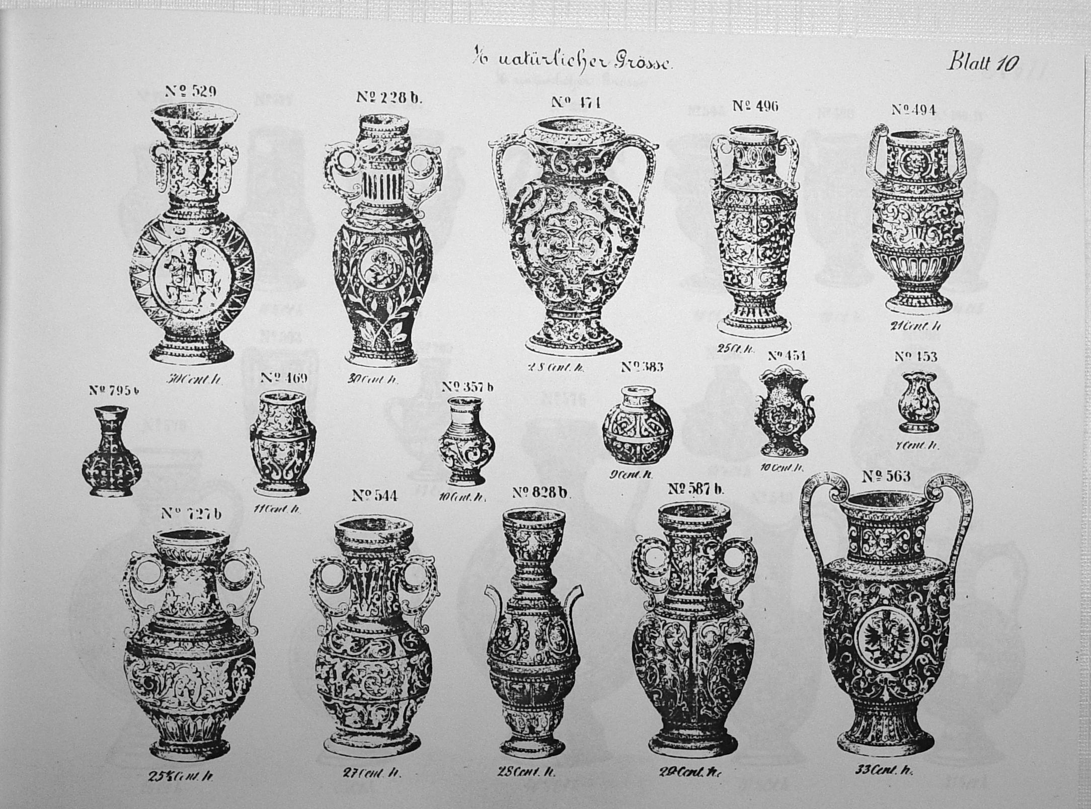 Who made this stein? Using available original manufacturers catalogs, this page allows you to look up possible answers to that question. Mold numbers beginning with 1 and ranging into the thousands appear in the first column below. For each mold number, the manufacturers who produced an item with that number are listed, along with a link to an original catalog page showing that item. Scroll down to the mold number in question, then examine the catalog pages to confirm the manufacturer of your stein.