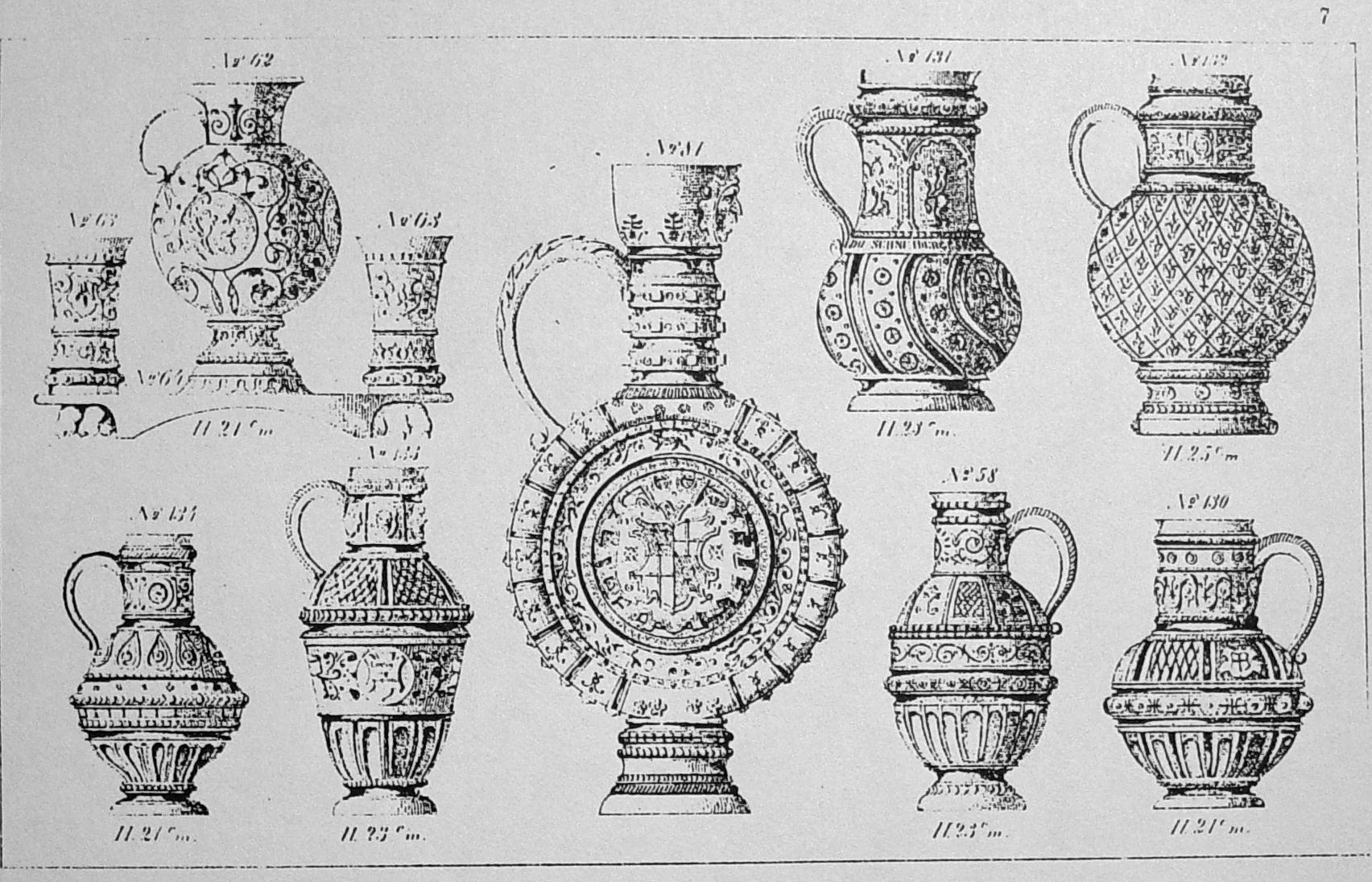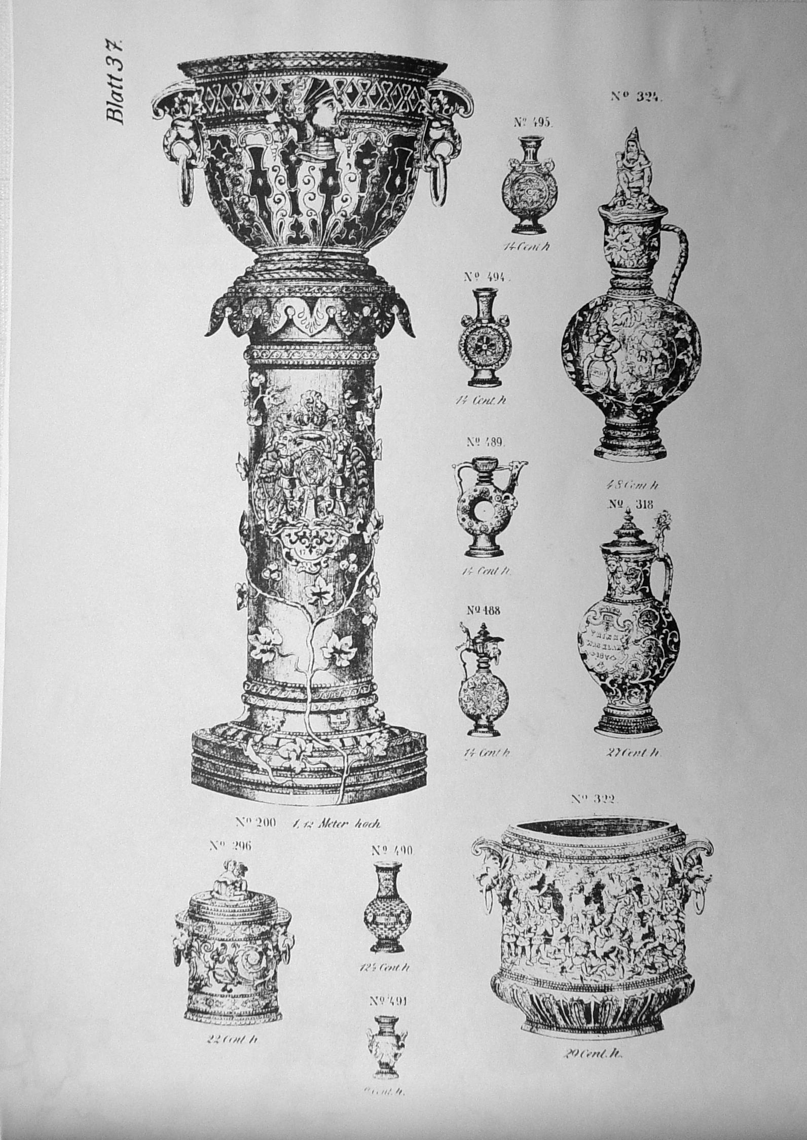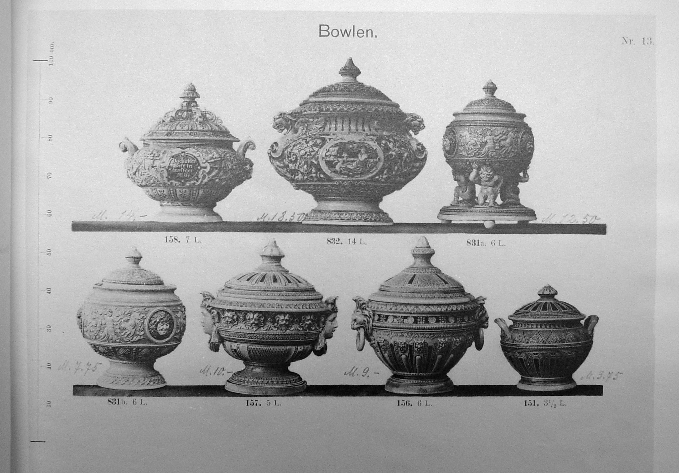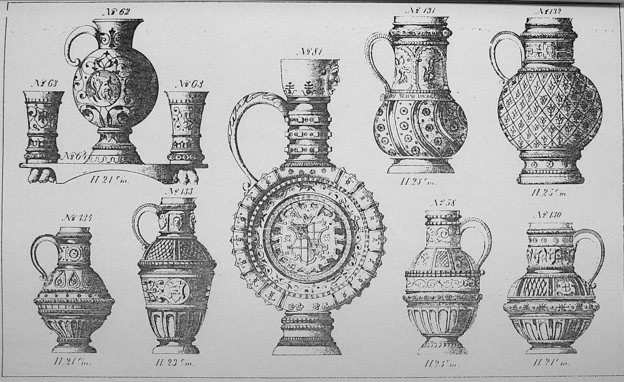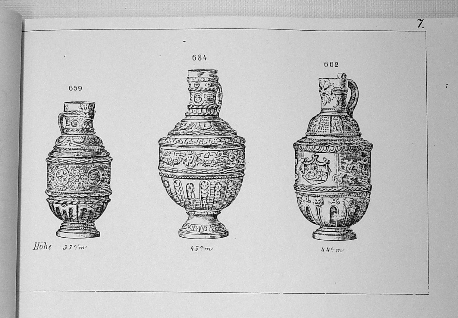 Who made this stein? Using available original manufacturers catalogs, this page allows you to look up possible answers to that question. Mold numbers beginning with 1 and ranging into the thousands appear in the first column below. For each mold number, the manufacturers who produced an item with that number are listed, along with a link to an original catalog page showing that item. Scroll down to the mold number in question, then examine the catalog pages to confirm the manufacturer of your stein.