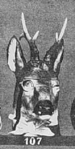 While adding steins to our shelves is quite enjoyable, l have found that finding new information about my steins gives me a deeper understanding and appreciation of them. Therefore l am very happy - after so many years - to be able to call the "Musterschutz" steins by their correct factory name: "Schierholz". Page number 72, one of five pages from an original Schierholz catalog which, taken together, show many of the Schierholz porcelain characters. The stag with monocle and ribbon around his neck (#107 at the center of the middle row) has not been seen.