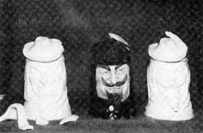 How They Were Made For a chapter in the new character stein book, "Character Steins, a Collectors' Guide" by Manusov and Wald (Cornwall Books, 1987), l wrote about "how Musterschutz steins were made." What l wrote three years ago still proves accurate with our new Information in hand. The first step in making a character stein is to produce sketches. Next comes the actual modeling, which is done in clay. Careful consideration is necessary with respect to where the lid separation can be worked into the design. Once the design was acceptable, the mold-making process began. The number of molds needed to make the stein depends on how many protruding parts the stein has. The molds were filled with a fine white porcelain, which is made largely of kaolin (a very fine white clay), quartz and feldspar with all impurities carefully removed. This porcelain used to fill the molds was in liquid form, called "slip". The molds themselves were made of a plaster material which absorbed water from the slip, forming a crust or build-up on the interior walls of the mold. After a brief time the remaining liquid was poured off: The thickness of the piece was determined by the amount of time the slip was allowed to remain in the mold. The solidified porcelain material was then removed from the molds and excess casting material was trimmed off so the pieces could be joined together. The joining process was achieved by coating the edges with porcelain slip. Additional porcelain was applied to the joint to fill any gaps. When the mold parts were joined, air chambers were created; the worker would puncture these chambers, leaving expansion holes so that, during firing, the heated air and water vapor could expand without exploding the chamber. These holes are generally well-hidden in the design, but can be found if a piece is carefully examined. After all the mold parts were joined the piece was air-dried for a few days. The "green" (in age, not in color) porcelain would now be firm but fragile and had to be handled carefully. The mold seams were cleaned up using cutting tools and a damp cloth; any extra detail was then hand-carved. The article was now ready to be bisque fired.