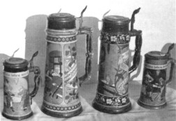 A sister of Hubert Thewalt was married to one Ludwig Eckhardt. Eckardt was the owner of another big stoneware factory, with which we are all familiar, namely Eckhardt &Engler. They produced the same series of steins and other wares as Joh. Pet. Thewalt, but now under the Eckhardt & Engler name and trademark, both marked and unmarked. This firm, as we know, continued to 1971. Thereafter it was purchased by the Goebel Company (Hummel). All the old TP molds, however, were destroyed, and I mean literally destroyed. This included, as far as I can find out, the master molds. This then explains why the TP mark could have been considered one of Eckhardt & Engler's. Similarities to Steins by Albert Jac. Thewalt Joh. Peter Thewalt had at least one other son, Albert Jacob Thewalt. Albert and Karl were competitors, Karl having taken over their father's business, while Albert started his own. And of course, that Alb. Jac. Thewalt was the grandfather of present day Albert Jacob Thewalt, owner, operator and manager of the extremely fine and productive firm of stein makers carrying that name today. This company will observe its 100th anniversary in 1994. Is it possible that some of the technology and artistry was traded between these two brothers? And is that the reason why some of the TP steins look like some of the Alb. Jac. Thewalt steins of that time? Is it possible the brothers got their training in exactly the same place? And How About J. W. Remy? What about the J. W. Remy steins? Certainly we know that craftsmen and workmen occasionally moved from firm to firm, and though fierce loyalties were often built up among the workers, the economy and other factors, which have been discussed in print previously, sometimes caused a shift from firm to firm. We know there was cooperation in this area between the [Joh. Pet. Thewalt] firm and the Remy firm in order to keep their employees fully employed. We also know that [Joh. Pet. Thewalt] purchased molds and some technology from Remy. Probably what was said in German would translate better as co-operation between the firms, but this was not the exact meaning - but at least readers will see the connection. We also are aware that patterns and molds were on occasion sold and traded between other firms. I would like to close with a word of caution: I have spent many years studying the steins of various manufacturers. I have a special affinity towards, or with, those of the J. W. Remy and Thewalt firms. And I can tell you that to identify an unmarked stein as being a Remy or a Thewalt is often, even for me, extremely difficult. At one time I purchased by mail a stein identified as J. W. Remy. It carried a J. W. Remy number, was pictured in the J. W. Remy catalog, and bore a great resemblance to a JWR stein. However, on studying it closely, I was able to find five different items that told me it was not a JWR. So again, the identification of unmarked steins can be extremely difficult. Credits and sources for this article include: Albert Jac. Thewalt (owner, operator, manager of the large Thewalt stein firm) Gerd Kessler (son of Robert Kessler) Robert Kessler (deceased, last owner of J. W. Remy) Helen (daughter of Karl Thewalt) Also: Various books and papers made available to me at the times I was in Germany, papers and letters sent to me, and various material collected over the years.