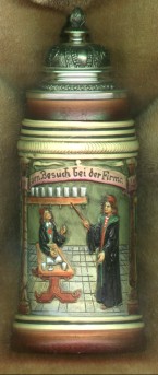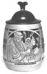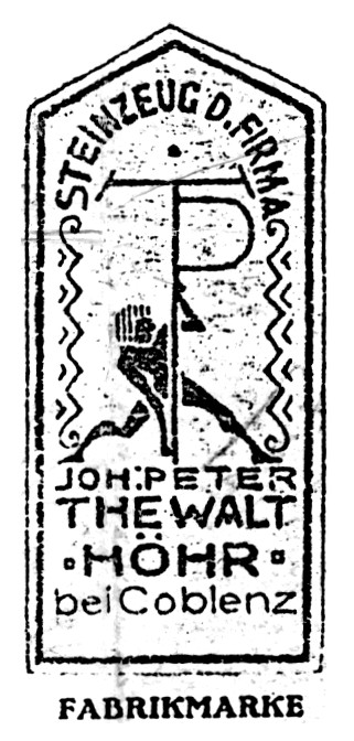 The Firm of Joh. Pet. Thewalt The TP mark was the mark of the firm of Joh. Pet. Thewalt (Johann Peter Thewalt) of Höhr, which was founded in 1852. Herr Thewalt was a manufacturer of both art and common (utilitarian) stoneware. This gentleman bore the same name as his father, and he founded the firm in his father's house, still in existence in modern-day Höhr-Grenzhausen at Bergstrasse 3. (I have been to the house a couple of times.) He died on September 21, 1887. After his death, his son Karl carried on the factory under his father's name, with the addendum "Inhaber: Karl Thewalt" (Inhaber means proprietor, possessor, holder, etc.) Karl Thewalt died in 1923 and the factory was taken over by his son Hubert Thewalt, who remained in business until the depression in 1930, when the firm became insolvent. I have not established the exact date of the firm's demise, but have never found any firing dates after 1930. Karl Thewalt's daughter Helen is still living, and she remembers that the Joh. Pet. Thewalt Co. had a big export business with the United States in the years before the first World War, mainly in "jugs and mugs" (steins) carrying the TP mark, mostly salt-glazed. Some of the wares, however, were the fine stoneware. Although there is more to be written, this is basically the history of the firm with the TP mark. The Joh. Pet. Thewalt folks of course were decorators and also made their own lids.