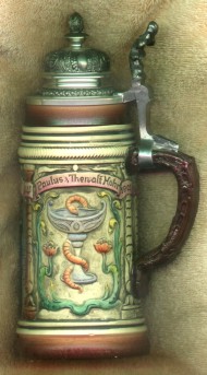 Confession of a Dilatory Researcher by John M. Gaustad (from the June 1996 issue of Prosit) Two or three years ago, I came across the stein you will see illustrated in figures 1 and 2. I first noticed the Thewalt mark on the bottom and then on the face of the stein the name "Paulus & Thewalt". I thought this a bit unusual, in that there are Paulus & Thewalt steins with their own distinctive mark. I took it along for "Show and Tell" at a meeting of the Gambrinus Stein Club where my colleagues agreed that it was, indeed, unusual. Back home, I returned it to the shelf and gave it little thought until in the December 1993 Prosit, I read an article by Roland Henschen titled "The Stein Makers". It is, essentially, a history of the Thewalt family. From this article I learned that Albert Jac. Thewalt (1857-1939) and Jean Paulus were brothers-in-law and that the two founded the firm of Paulus & Thewalt in 1882. Reading on, I learned that production in 1894 consisted of various kinds of stoneware for pharmacies and laboratories, and finally, that the production of beer steins began in 1897. From the foregoing I concluded that the stein I had discovered was, basically, an advertisement for the firm of Paulus & Thewalt. I put the stein back on the shelf and turned my attention to other matters. However, at the Milwaukee Convention I listened to Pat Manusov's account of a visit to Thewalt in Höhr-Grenzhausen. At the break I told her about my stein. She suggested I write to Albert J. Thewalt and was certain that he would be glad to help with additional information. I did write and Herr Thewalt was indeed helpful. He is a member of SCI. He agreed that it was reasonable to classify the stein as an advertisement for the firm, but also suggested that it might have been ordered on the occasion of the 25th anniversary of Paulus & Thewalt in 1907. He told me that the company still has the original mold and that the theme of the design was "The Studying Pharmacist." Moreover, he included in his reply a copy of a page from the archives of the period which includes a #536 and its description in German (figure 3). If there is a moral to this story, it must be that sometimes even the lazy researcher can come up with some answers.