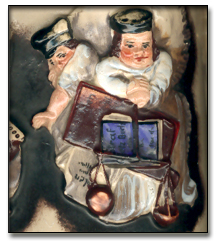 ![]() A Thief and a Merchant or Judge? The first is grabbing for another baby's bag of money and the second has scales and law books. |
