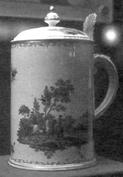 The loss of these efficient (and knowledgeable) workers was the first reason for Du Paquier's upcoming problems; the second reason was his almost permanent poor financial situation. Production repeatedly stagnated in the following years. Since the emperor's privilege was valid only until 1744, Du Paquier sold the factory to the state, rather than renewing the privilege for his monopoly. It thus became the Imperial and Royal Aerial Porcelain Factory. Despite many change, difficulties continued to plague the factory, and it was finally decided to close it in 1864. Items made at the Vienna factory were known to be very expensive - even in 1730. But the quality and variety of Du Paquier's porcelain must have been remarkable. Although the items produced in the first few years obviously showed the Meissen influence because of Stölzel, Vienna was soon able to find its own artistic "language." Most of the early Vienna production is not marked, but can be identified as Vienna porcelain because of the specific characteristics of bodies and glazes, as well as the unmistakable Du Paquier ornamentation: Borders in English red, or ornamental foliage and lattice work, known as "Bandelwerk." The tableware sets, as well as the outstandingly beautiful one-of-a-kind pieces, derived their shapes from Eastern as well as Meissen porcelain designs. Other inspirational sources were the ornate designs used to shape and decorate precious metals. Since there were so many different shapes, a large variety of patterns existed: The figurative scenes show Chinese motifs (fig. 12), cherubs, hunting and war scenes, as well as mythological and allegorical representations. The painting was done in either one color (monochrome) or in polychrome (figs. 13 and 14). It is certain that a blue under-glaze was used starting in 1772. The works of painters and modelers remained mostly anonymous until 1744. An exception is the Vienna stein shown in fig. 12: We know that the artist's name was Joseph Philipp Dannhöfer (or Danhöfer). He was born in Vienna in 1712 and started his career as a painter in Vienna. In 1737 he left for the Bayreuth faience factory, and in 1749 he can be identified as being a painter of bright colors at the porcelain factory in Höchst, near Frankfurt on the Main (ref. 8). From 1762 to 1790 he did the same type of work at the Ludwigsburg factory in Württemberg (ref. 9), where the last stein we will comment on was made. Ludwigsburg, "Herzoglich Aechte Porcelain Fabrique" (1758-1806) and the Royal Porcelain Factory (1806-1824) The mid-18th century collecting fever and the liking for things of beauty also arose in Württemberg, where Duke Carl Eugen resided and reigned. Carl Eugen had been at the court of Frederick the Great in Berlin for two years, and after his return home he wanted to enjoy the same French-inspired luxury he had experienced in Berlin. He succeeded after a very short while and his court was known as the most magnificent and merry one in Germany. A duke with such a reputation had to have his own porcelain factory! Therefore, by the decree of April 5, 1758, he ordered the founding of a porcelain factory in Ludwigsburg, near Stuttgart. The first attempts to learn the secret of porcelain were negative, until the painter and porcelain initiate Joseph Jacob Ringler (ref. 10) came to Ludwigsburg in February 1759. He had gained a lot of experience at Höchst, Strassburg and other smaller factories, and was thus able to get into production quite fast. Ringler was to be the factory director for more than 40 years. A few months after he arrived in Ludwigsburg he was able to attract many workers from other German faience and porcelain factories: We know of Gottlieb Friedrich Riedel (ref. 11), an artist and designer who had worked at Meissen (1743-1756), in Höchst and at Frankenthal (ref. 12) from 1757 to 1759 as a painter of animals and birds. Other known artists were J. F. Steinkopf and A. P. Oettner. The modeler and sculptor J. Chr. W. Beyer, who had studied in Paris and Rome, worked at the factory from 1759 to 1767. During this period the figurines and statuettes show a tendency towards the classical: This elegant Louis XVI style was adopted for vessels starting in 1780. The artist Joseph Philipp Dannhöfer (mentioned earlier as the designer of the Viennese stein in fig. 14) was lured from Höchst to Ludwigsburg in 1762; however his designs for the Württemberg porcelain factory have not yet been identified. Over 100 workers were busy in Ludwigsburg in 1760, and only six years later there were more than 150. This made it possible for the factory to develop its "golden season" during the first decade of its existence. It was during this period that the stein shown in fig. 15 was made. The economic success of the factory ended suddenly after this short period of ten years, and therefore Duke Carl Eugen had to support the factory with his own purse from 1770 on. After his death in 1793 this financial support stopped and the decline of the factory began and its very existence was endangered. The successor, Duke Frederic II, tried to reorganize the factory by paying off all debts. After his election as King Frederic I of Württemberg in 1805, the factory was renamed the Royal Porcelain Factory. When the king died in 1816, the factory's decline started again because Frederic's successor, William I, was not interested in keeping or supporting the expensive and poorly operating factory. The factory was finally closed in 1824. Until the beginning of the 19th century, Ludwigsburg porcelain did not have the white color, the purity and the brilliance we see in porcelain from other German factories. The reason was to be found in the white clay from Passau and the kaolin from Hornberg; these materials produced a gray colored, often even brownish, but very plastic, porcelain. Since Duke Carl Eugen preferred figural centerpieces, most of the items from Ludwigsburg had a sculptured character, and the porcelain was