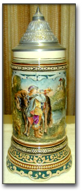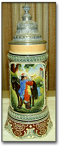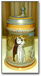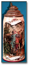 the Werner resigns sadly and says he will return when he has acquired the necessary standing or not return at all. He says farewell and rides away, stopping at the edge of the Rhine River. He leans on a tree, looks back up to the castle, and sadly plays a farewell song on his trumpet (figure 6). (This poignant scene is easily the most familiar part of this story to stein collectors, appearing on numerous steins, Figure 7). |