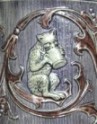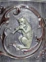 A monkey seated on the lid clutching his Stiefel (drinking boot) is an