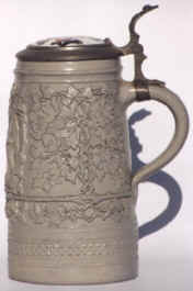 These steins are commonly found with heavy flat pewter lids, sometimes