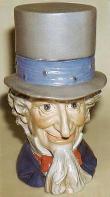 ~ Schierholz Uncle Sam ~ The Uncle Sam stein was produced by the Schierholz factory of Plaue in both full-color (as seen here) and in tones of honey-tan and white. Among the makers of porcelain character steins in the late 1900's, the works by Schierholz rank at the top. The imaginative flair of the designers coupled with exceptionally fine quality finishing makes these steins a delight for collectors.For many years the steins of this factory were known by the name of "Musterschutz", since that word is the most frequently found mark on the base. In fact, this word simply means "copyright protected". A lesser number of these steins contain a "hash mark" or "tic-tac-toe" mark on the base, which was finally recognized by SCI Master Steinologist Ron Fox as the trademark used by Schierholz. In the 1990's the original molds for these steins were pressed back into service, and some excellent contemporary copies came to market. |