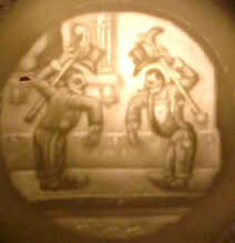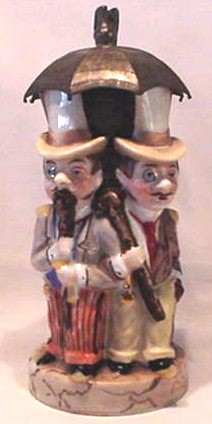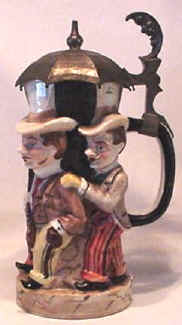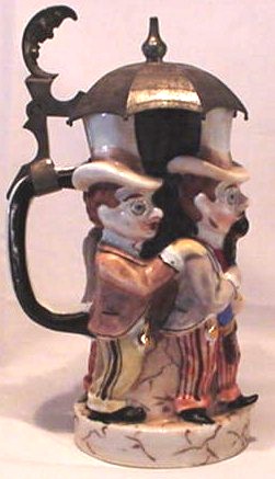 The Schierholz "Umbrella" Stein These four well-dressed gentlemen all wear top hats, three have monocles on their right eye and sport watch fobs with gold watches and the two in front carry canes. The thumblift is a crescent moon that has a devious grin. Although they are not dressed for it, this has to be a golf umbrella to be able to cover four men. The lithophane shows two gentlemen meeting on the street, one smoking a cigar, and tipping their hats to each other with their canes. The Encyclopedia of Character Steins by Dr. Eugene Manusov, Master Steinologist, describes one lithophane scene as two dancers on stage while describing another lithophane scene as two clowns meeting on the street (perhaps he is interpreting the facial features on my gentlemen as those of clowns (figure 461 on page 205). However, my gentlemen appear to be on a street and I can’t tell that they are dancers. My lithophane is shown on page 66 (and identified as ECS-461 "Umbrella") of Character Steins: A Collector’s Guide by Eugene V. Manusov and Mike Wald. Dr. Manusov also describes one as being in tails, but I can’t distinguish that in my lithophane. There are variations of this stein: changes in the color and style of clothing (mine are without gloves while in the picture he shows they are gloved) and a version with a music box base. Readers are invited to send photos of other versions of the stein and/or the lithophane to be included with this article. This stein is difficult to find in mint condition as the pewter balls at the end of the umbrella ribs are vulnerable. | |