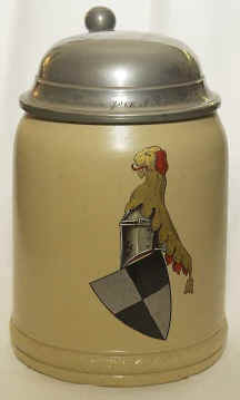 ~ A Royal Student Stein ~ The stein shown to the right is a custom-decorated form 285 by Villeroy & Boch. Despite the relatively under-stated decoration, this is a very interesting and unusual stein, with historic provenance. German natives and students of heraldry might recognize the coat-of-arms immediately, but we will seek understanding of this stein by examining the inscription on the pewter rim: Joachim Albrecht Prinz von Preussen Z! CK. s/l R von Hantelmann Z! z. fr. Erg. Bonn S1896S (By convention, the "Z!" in the above transcription stands for a Zirkel, the special and unique insignia of each German student society.) Most inscriptions on student steins are readily translated. In this case, Joachim Albrecht, Prince of Prussia, presented this stein to his cherished friend, R. von Hantelmann in fond remembrance of the summer semester at university in Bonn, 1896. Both gentlemen belonged to the same student association, as indicated by the Zirkel following each name. This gives us many additional hints to pursue in trying to understand this stein. Thankfully, Joachim Albrecht, Prince of Prussia, is readily identified. Born in 1876, he was a great-grandson of Frederick Wilhelm III, King of Prussia from 1797 to 1840. His grandfather, Albrecht, was the younger brother of Wilhelm I, King of Prussia and first Kaiser of Germany (1871). At the time of his studies in Bonn, 20-year old Joachim Albrecht was a cousin of Emperor Wilhelm II. The royal family of Hohenzollern, established in the early 12th century, became rulers of Brandenburg and later Prussia. In 1192 they adopted a simple shield of four silver and black quarterings as their family arms, and in 1317 Frederick von Hohenzollern acquired the legal ownership of a helm and crest consisting of the head and shoulder of a hound, as shown on this stein. The "CK." in this inscription defied understanding until some expert help was offered by Michael Streit, a visitor to the SCI web site and an Alter Herr of two Corps, Frankonia Prag and Franconia Tübingen. The abbreviation stands for "Conkneipant", a term signifying a restricted form of membership and privilege within the Corps. This special form of membership may be extended by the Corps to someone with whom they have a close relationship, but who has not - and will not - complete the requirements for full membership. The Conkneipant is a regular and welcomed guest at the Corps Kneipen, the traditional festivities involving ceremonies, rituals, song and drink, and he may be extended other privileges of membership, depending upon the rules of each individual Corps. For example, a Conkneipant is allowed to use the Zirkel following his signature, but is expected to indicate that he is a "CK", not a fully qualified member. A Conkneipant is not permitted to wear the Band (colored sash) of the association, and although he may wear a student cap, the colors will be restricted. When a Conkneipant finishes his studies and leaves the university this special status is ended. Why would Joachim Albrecht become a Conkneipant? Members of ruling royal families were frequently not permitted to take part in student fencing activities (Mensuren), which for the Corps were an essential part of the membership requirements. This form of participation in a student association would also be a very natural way to include visiting foreign students in the richness of student life during the period of their studies. In summary, this stein was presented to a brother in Corps Borussia Bonn by a member of the Prussian royal family Hohenzollern, in 1896. Arthur Maethner notes that "it was customary in those days for the aristocracy to present tokens of friendship to their subjects. And of course, customized and personalized beer steins were favorite presentation pieces among university students. A stein with the coat-of-arms of the House of Hohenzollern would have been considered as a most appropriate token of friendship from a member of the royal Hohenzollern family to a Corpsbruder and worthy subject." Note: The identify of R von Hantelmann is as yet unknown. Recent information adds that Rudolph von Hantelmann died in 1926 (citation: "Koesener Corpsliste 1960").