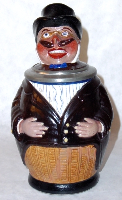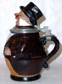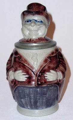 blue and grey saltglaze, character stein over-painted in full color. This piece