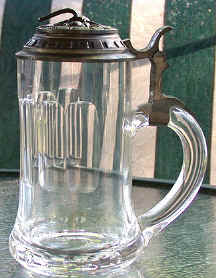A Glass Stein with an Unusual Lid Ginger Gehres shows us this nice mouth-blown glass stein. The body has been ground on a wheel and the handle applied by hand, typical of glass steins produced in Bohemia during the latter part of the 19th century. But the most interesting aspect of this stein is the pewter lid. The lid depicts a cat with his back toward the viewer. Around the rim of the design are the Roman numerals I through XII, arranged as on the face of a clock. Most curiously, the cat's tail may be turned, from one stop on the dial to the next, hence serving as a counter to keep track of the number of times the stein has been filled! We know the cat as the well-known symbol for a hangover, and how fitting that as the cat's tail is wound, the implied punishment for over-indulgence becomes more and more inevitable! There is an additional symbol found on this dial at the eleven o'clock position, where the numeral XI is preceded by the paragraph (§) symbol, i.e., paragraph 11 (or §11). This is another familiar sight for stein collectors, taking its meaning from the beer codes adopted by the German university students - keep on drinking! Like most people who enjoy a few beers and begin a night of drinking with the intention of avoiding the Kater, after you've had 11, why bother stopping? |