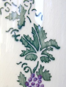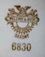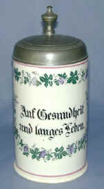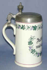 Collectors are generally very familiar with steins produced by the firm of Villeroy & Boch in their factory in Mettlach, but steins produced by their other factories are almost unknown. The one-liter stein shown above is quite scarce, being made by the V&B factory in Dresden. As can be seen, the design consists of a grapevine encircling the upper rim, and a second garland framing the verse - Auf Gesundheit und Langes Leben - to good health and long life! This design is simple, straight-forward and very appealing. The heavy pewter lid fits snugly over the rim, and bears a Biedermeier "urn" style thumblift, a style which came into use in the second quarter of the 19th century. The closed three-ring hinge includes an oversized center ring. The lid is inscribed 1879, but the overall style and the pewter fittings, with closed hinge and thumblift mounted above the edge of the rim, suggest a somewhat earlier date. By the early 1850's the factories at Wallerfangen and Mettlach could no longer satisfy the demands of the market, and they were constrained in further growth. Dresden was viewed as a favorable location for a new factory, both for its proximity to the markets in the north and east, and for the clay and coal deposits to be found in that area. Building of the Dresden factory was begun in 1853, and it was shortly producing "useful and ornamental objects of the most varied kind", "white and colored, printed and painted". First among its specialties were "dinner, coffee, tea and toilet services, painted blue with Onion and Saxon pattern". Although this stein is completely unmarked, the handle shape and style were used on a series of mugs and on a few pitchers produced by this factory (see below). Those items generally carry a Mercury mark which is quite recognizable to Mettlach collectors. In fact, this same mark was used by a number of V&B factories, each placing their own name in the semi-circular banner below the name of the firm. The more compelling reason to attribute this stein to the Dresden factory is the decorative technique (see close-up above). The leaves and vine of this decoration were painted using a silk-screen stenciling technique, a method of decoration which is seen on the popular (and much more common) blue or red "Poppy" pattern also made by this factory. An example of this pattern is shown below to the right.