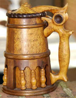 by Stephen L. Smith SCI Master Steinologist The Scandinavian or Baltic Sea area wooden stein shown as our "Stein of the Month" is 10 inches high and 6 inches in diameter. When it comes to wood, collectors are most familiar with the Scandinavian "burl wood" steins with a carved lion as the thumblift and three lion or ball feet, or the heavily carved, very early steins such as the "peg tankard" shown as the May 2000 Stein of the Month (which can be viewed by clicking the link to the "Archives", above). This beauty’s interior was hand lathed (turned on a wheel) and the outside design was done using different colors and types of wood veneer. I'm told that the large section of the stein to the viewer’s right (seen most clearly in the upper body area) and the handle-tang combination are "Birdseye Maple Burl". The nine, 2 ½ inch tall baluster pegs were also turned on a lathe and then screwed and glued into the body. The "burl" handle was completely hand carved, and is reminiscent of the custom pistol and rifle grips used for tournament shooting with very nice feeling to the touch, and a well-done finish. The handle’s top section is held to the body by a tiny wooden, turned, "screw" (which if the photo was larger might be seen) just inside the carved "U" area. There is a custom made five-part hinge, the hinge pin capped with a dark stained, decorative wooden cap. Part of the hinge extends upward to become the entire thumblift and continues forward to meet the body as what we collectors call the "tang". The rim of the lid is formed as a "twisted wreath", using the same darker color as was used to cap the hinge. This body of many separate parts is partially secured by two large straps of wooden cane work, called "withes". Purely based on condition I estimate this stein as being made in the first quarter of the 20th century. My review of 25 years of stein-auction catalogs and extensive reading has not netted anything of similar appearance, or even closely resembling it. I consider this stein to be possibly unique, maybe constructed during one of those long, dark, cold Baltic Sea winters. This stein is part of the Stephen L. Smith Collection: "From Which To Drink" |