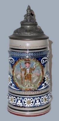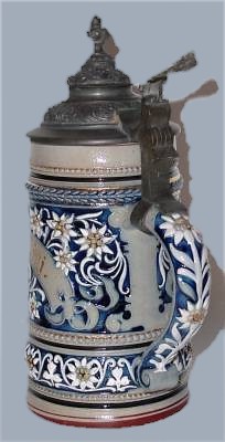 Contributed by SCI Master Steinologist John McGregor During the mid- to late-1880s there were too many factories producing saltglazed Steinzeug (stoneware), and the supply was outstripping the demand. At the same time these factories were faced with increasing wages and tariffs. A few factories and finishing shops looked for ways to get a competitive edge. One method to distinguish these wares was to apply colorful enamels to the blue and grey pieces, and they found a way to do this without having to invest in new processes, training, technology or equipment. The stein shown below is an excellent example of the type of wares which resulted. ![]() ![]() ![]() The stein is marked with an incised trademark, "L.T.M.", which is a so-far unidentified finishing shop. L.T.M. applied the enamel and the pewter, but the stein was manufactured for them by Marzi & Remy. This model, number 313, and a similar piece numbered 312, are shown in an early Marzi & Remy sales catalog, without the enameling of course. Note that in this case the Marzi & Remy factory was able to complete the production of these saltglazed-relief steins, sell a portion of them themselves, and sell the rest to L.T.M. for further decoration! In other cases these saltglazed Steinzeug pieces were produced with an area left specifically for further enamel decoration. Two more examples are shown below.