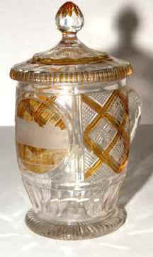 Spa Stein with a Set-On Lid This Stein-of-the-Month article was provided by Norm Paratore, a member of SCI and Gambrinus Stein Club. He discusses a stein which has special significance to him because its purchase opened his eyes to the glass cutting art and gave new focus to his collecting. I consider this stein to be "my most meaningful stein". Notice I didn’t say my favorite, or most expensive, or oldest, or most unusual or rarest stein. I purchased this glass stein at an antique show in Pennsylvania around 1993 from someone most readers know or know of – SCI Master Steinologist and glass expert, Ron Fox. I had to think long and hard since the asking price at the time was pushing my financial limit, and it even has a small chip on the inside lip of the lid. But, the bug had bit and the stein was to be mine. OK, you ask, what makes this stein so meaningful to me? After all, many collectors wouldn’t even consider this a “true” stein since it has a set-on lid. WHAT…A SET-ON LID? Blasphemy!!!! Heretic!!!! Yes, it has a set-on lid and you all can snicker or turn your noses up, but that is fine as it helps keep prices lower for me! Now to why I call this my most meaningful stein. First, this is the stein that made me look more seriously at glass and for starting me down the path I’m still on. I love old, blown, copper wheel cut glass steins! Prior to my purchase of this stein I was interested in what many new collectors start with – Mettlach or just about anything else that struck my fancy at the time and I could afford. Mettlach steins seemed to be safe since there was so much published about them and everyone knew the price of every mold. I started looking a little more closely at this stein and noticed that just about every surface from the finial to the bottom of the foot is cut in some fashion – all very intricately. That is a lot of cutting since the stein is almost ten inches tall. Take a close look at the lid, where there are six different cuts alone. Around the edge the person who applied the stain only painted every other cut! Talk about labor intensive. Then look at the staining around the middle of the lid, as well as the finial. And there are five separate types of cuts on each side panel. Just below the side panels and running around the entire stein is a double cut that took two passes (or one pass with a “W” shaped cutting tool), below that there is vertical scalloping leading to (gasp) the plain top of the foot. On the bottom of the foot is a starburst with a ground clear pontil. The handle has a diamond cut as shown in the picture. As you look at the pictures, notice how the extensive cutting of the glass reflects light onto the table. Secondly, I looked closer at the building on the front of the stein and the detail. Learning how these scenes were done opened up another world. Just the idea of how these copper wheel artists formed those marvelous pictures was, and still is, mind boggling. The name Saltzbrunn on the stein got me wondering what it was and why it was on a stein. Well, I found out it was spa-related, which led to an interest in spa scenes on steins and finally into spa sippers, beakers, and mugs. It's remarkable how many steins had spa buildings or scenes on them and no one seemed to be paying any attention. This burgeoning interest led me to research German/Bohemian spas, their importance to the economy, and why in the mid-1800s they were suddenly so overwhelmingly popular, which in turn was responsible for the proliferation of spa related glassware, souvenir decorations, and thousands upon thousands of post cards. Watch for a future article in Prosit on this subject. Or, come to the August 2003 meeting of the Gambrinus Stein Club and hear it live. The third and final reason why this is my most meaningful stein… it was responsible for my collection of steins with set-on-lids. My collection stands at just over a dozen right now and range from the simple to the very elaborately cut, from the smallest at 6” to the largest at just over 11”, with and without wheel cut scenes. The set-on lid style was popular for a very brief period – basically from about 1820 to 1850. By around 1850 they were done – stick a fork in them, fini, over and out! The steins fit in to the time period of excessiveness in glassware and cut decorations, which ended around 1850. John Ruskin, a prominent English art critic, had previously blasted all cut glass as "barbaric" and he labeled pyramid shaped cut diamonds "prickly monstrosities", criticism which eventually brought about changes in glassware decorations. Colorless cut glass fell out of favor on the Continent for the next twenty-five years, and it was only revived after the United States Centennial Celebration of 1876 in Philadelphia when American colorless cut lead crystal made such a good impression on the European glass industry. The miter cut "prickly monstrosities" that Ruskin objected to so strongly can be found on set on lid glass steins. The stein bodies he referred to were generally of the larger size with thick heavy glass and similar sized handles, and large cut decorations as well. Naturally the size of the lid and the decorations had to balance out with the body, so they were also large and a bit excessive. Between Ruskin's opinions, changing economics in glass production, the development of stained and flashed colors and the popularity of engraved decorations, interest in the steins faded away around 1850. Many older glass steins may have bubbles and faults, some may have a yellow cast to them due to the Potash additive, some may sag or lean to one side, and some may have chips or even cracks. All of these flaws to my eye simply add character. Think of the care in handling that had to take place over the years for something so fragile to still be intact after 150 years and more. How many glasses have you broken just in the last couple of years? But the one thing I have come to appreciate 