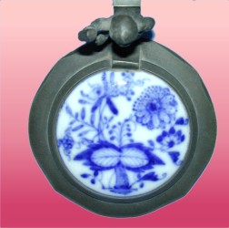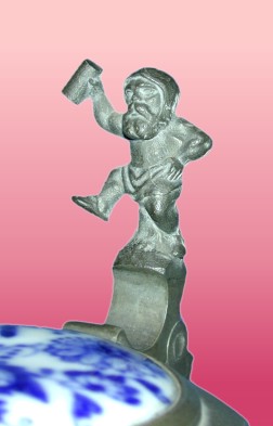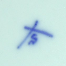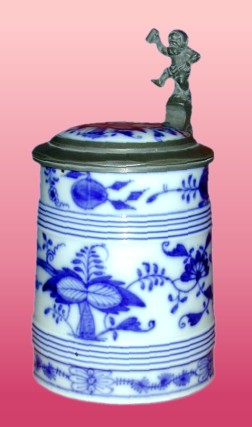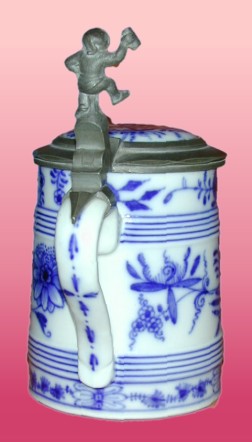 The half-liter porcelain stein shown to the right is decorated with what most people identify as "the blue onion" pattern. With matching inlaid lid and a nice dwarf figural pewter thumblift, its blue and white colors and traditional design gain it easy entry into many kitchens and dining rooms. First produced under the guidance of Meissen director Johann Höroldt in 1732, the so-called "blue onion" pattern was actually an adaptation of an early oriental "tree of life" motif. In Germany the pattern - or any of its many variations - is known as zwiebelmuster, or "onion pattern". In fact, the flowers and fruit in the design include a stylized pomegranate or peach, and a peony, aster or chrysanthemum. Where's the onion? Although the Meissen name retains its historical link to this pattern, the design has been used and re-used by many different firms in the intervening years, sometimes employing a different name (e.g., "blue Danube"). To add to the difficulty in identifying the maker of a piece, the crossed swords mark used by Meissen has also been extensively borrowed. While this stein does carry a base mark, I have been unsuccessful in identifying it (see photo). The stylistic characteristics date its manufacture to about 1900.