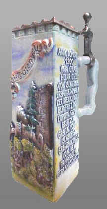 ~ Burg Grenzau ~ contributed by SCI member Ron Gray SCI Members attending Convention XII in Mettlach/Höhr-Grenzhausen, Germany in 1978 will recall visiting Burg Grenzau and should immediately recognize this stein. This character stein is a representation of the unique triangular tower of Burg Grenzau, the only tower of this shape in Europe. Convention attendees were treated to a private tour of the castle and its famous tower. At the conclusion of the tour we were given a black and white print of the castle. I had mine framed to display with my steins (see picture). A few years later, while shopping in a gift shop in Dubuque, Iowa, I saw this stein. Since it seemed to be following me from Germany, I naturally had to have it. The stein was made in the early 1980s by King-Werke Würfel & Müller, exclusively for Tripar International, Inc., in a numbered limited edition of 12,000. Each side of the tower/stein is shown in the pictures included with this article. A relief scene of the castle appears on the front side of the stein, while the history of the castle is summarized in text on the other two sides (see below). The images of Burg Grenzau shown in the black and white print and the one gracing the front of this stein may seem familiar to collectors of contemporary steins. The firm of Albert Jacob Thewalt produced a series of steins circa 1970-1985 featuring an image of the Burg Grenzau and its tower with the words "Grenzau 1894" or "Alt-Grenzau 1894" below that mark. (While the Thewalt firm was founded in 1893, production did not begin until 1894.) This mark generally appears in combination with the Thewalt trademark, and was used on reproductions of steins designed by Wilhelm Kamp (1879-1953). Herr Kamp was employed by Thewalt from 1897 (the year the firm began producing steins) to 1914, designing nearly 800 steins, most of which were based on paintings by Tyrolean artist Franz von Defregger (1835-1921). The village of Grenzau is in the Westerwald area known as Kannenbäckerland, or land of the jug baker. The cities of Höhr, Grenzhausen and Grenzau merged in 1936 to form the city of Höhr-Grenzhausen. Peter Dümler of Dümler and Breiden also had an interest in Burg Grenzau. According to the 100th Anniversary brochure of that firm, his interest resulted in the publication of a brochure on Burg Grenzau and its inhabitants. |