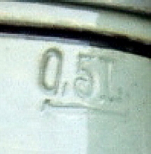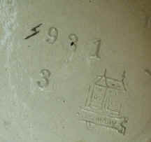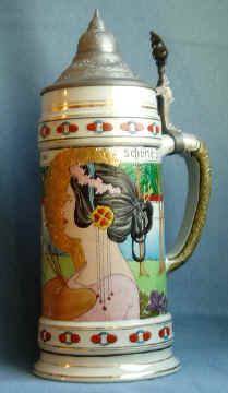 As we all know, half the fun in stein collecting is in the hunt. My persistence came to fruition when I finally found my Holy Grail listed on eBay. Luckily the listing did not list the manufacturer and I did not have too much competition in acquiring it. The stein has an incised scene showing four men being served our favorite beverage by a bar maid. The German verse of "Gesundheit und ein froher Muth sind besser als viel Geld und gut" translates to "Good health and a happy disposition are better than much money and property." An owl is shown holding a sword over a hunting horn. Perhaps the owl signifies they have made a wise choice. The bottom has the incised "RuG" mark and the mold number "432." Having acquired the stein, my interest in Rosskopf & Gerz was renewed. This time I studied the book rather than merely re-reading it. I immediately noted a couple of items of interest. On page 19 the author states the firm probably bought designs from Karl Görig and that the firm's own artist-designers included locally born Kilian Beuler. Girmscheid collectors should recognize that name as he was considered to be an exclusive employee of Girmscheid. Reading further, I found a picture of a stein (see black-and-white photo) that looked familiar. It was attributed to Rosskopf & Gerz, but the only mark on the bottom was 931 (not shown) and it does not appear in the 1914 catalog. I have the same stein in my Girmscheid collection with the same mold number, but containing the Girmscheid two-story house mark (see photos). The author states that the scene on 931 is reminiscent of the Bohemian artist Alfons Mucha (1860-1939) (see reference 6). Further deepening the mystery, Andre Ammelounx has a 1L Girmscheid stein, mold 961, listed in his February 23, 2005 auction catalog (lot 44). It has the same scene as the February Stein of the Month, yet it bears a Girmscheid trademark. The Beer Stein Library shows a different stein for Girmscheid mold 961.
