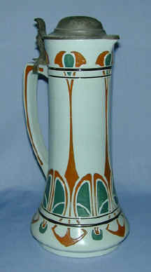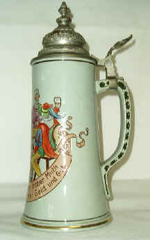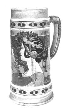 by Ronald E. Gray This month's stein was made by the firm of Rosskopf & Gerz of Höhr (Höhr-Grenzhausen after 1935), which is in the Westerwald area of Germany. I have wanted to own a Rosskopf & Gerz stein, preferably an incised or character stein, since I obtained a copy of the soft cover book entitled Rosskopf & Gerz: Steinzeugfabrik - Stoneware Factory Höhr im Westerwald 1901-1914 (see reference 1). The book is in both German and English. I saw a copy of this book for sale, as well as the Reinhold Merkelbach book, on the site listed in reference 2, but additional copies can be found at other used book store sites, particularly those in Germany. SCI member George Schamberger also has both of the books currently offered for sale in the Selling section of this site. Most of the information in this article is based on this valuable resource. While neither the Student Prince nor Mario Lanza are featured on this month's stein, I can just imagine that the gentleman standing is urging his three cohorts to Drink, Drink, Drink. This, of course, is the drinking song from The Student Prince. See reference 2 for the lyrics. "(Liquor laws prohibit us from giving you a taste of beer, but you can get a taste of the music by clicking here. Just click on the Drink, Drink, Drink sound system that is compatible with your computer. It will play in the background while you return to read the rest of the article.) "Those of you that were at the 1986 SCI convention in San Diego may recall that we attended a performance of The Student Prince in an outdoor theater in Balboa Park. If you have ever seen a performance there, you definitely know it is on the flight path for the San Diego airport when you attend a performance. One of the prerequisites to be an actor there is the ability to freeze the action, whether it be song or dialog, whenever a flight is going over the park. Can you imagine stopping your singing or holding your swig of beer in the middle of this song! My search for a Rosskopf & Gerz stein began with the two prime stein auction catalogs, Gary Kirsner Auctions and Andre Ammelounx The Stein Auction Company (TSACO), which I then expanded to my other auction catalogs. I am particular about knowing the maker of my steins, and I prefer to have them with the manufacturer's mark. It was very important to have such a marked stein in this case because the original molds were known to have been bought by Eckhardt & Engler, which could lead to doubts about the authenticity of the manufacturer. I reviewed 293 catalogs listing over 138,000 lots. Removing the non-stein lots (beakers, bowls, pitchers, plaques, figurines, pipes, pokals, etc.) resulted in over 114,000 lots of steins, mugs and drinking horns. This number should be taken with a grain of salt as non-selling lots are often relisted, and damaged and new steins are often grouped due to cost considerations. In addition, there are the statistical aberrations and bias, commonly known as errors. This review revealed only seven listings for Rosskopf & Gerz. There were quite a few more listings for Eckhardt & Engler, which either were marked or clearly were contemporary steins. All but one of the Rosskopf & Gerz listings stated "by Rosskopf & Gerz" (one stated "probably Rosskopf & Gerz") rather than "marked Rosskopf & Gerz." The word "by" generally indicates an attribution based on an old catalog listing or known characteristics employed by the manufacturer. One listing did state it was marked "RG," which I presume was due to the "u" being too faint to see. One listing clearly was not a Rosskopf & Gerz stein since the mold number was too high for the known mold numbers shown in the 1914 catalog. The other six listings do appear in the 1914 catalog. Two different auction catalogs in 1983 spelled the name as "Russkopf & Gerz." Since my Internet search did not reveal anything with that spelling, I presume it was just an early misspelling of the name. I called on a few of the listings and received confirmation that the lot did not contain a manufacturer's mark. It was not surprising that I had difficulty in obtaining a marked Rosskopf & Gerz stein as you will soon see in the following discussion of the firm, based primarily upon the information in the book by Dr. Dry-von Zeschwitz. Westerwald stoneware manufacturers had done quite well in international trade fairs in the latter part of the 19th century. The 1900 World's Fair, however, was a disappointment for the Westerwald manufacturers. It also was a time when there was an over supply of stoneware, the export market was dominated by a few strong companies and stein style preferences were changing. In addition, World War I would soon overtake all of Europe. It was in this environment that Alois Jacob Gerz and Karl Wilhelm Rosskopf would undertake the startup of a new stoneware factory in 1901. Herr Gerz was a businessman, while Herr Rosskopf was a potter and designer. Both gentlemen trained under Reinhold Hanke. The firm was registered as a Company in 1903 and Gerz became the sole owner when Rosskopf left the company in 1905. Eckhardt & Engler, a wholesaler founded in 1898, became the Company's marketing arm in 1907. Eckhardt & Engler acquired their own kiln in 1914 and bought some molds from Rosskopf & Gerz in 1918. Herr Gerz died in 1913 and his widow ran the firm during the next few years. The war took its toll, not only in lives of individuals, but also firms. Rosskopf and Gerz entered bankruptcy in 1917 and Eckhardt & Engler bought the remaining molds in 1922 or 1923. Much of this information is also confirmed in Keramik-Marken Lexikon (see reference 3), one of the better reference sources for marks, although it is only in German. That reference book shows the name as Roßkopf und Gerz, employing the Esszet ligature which we write as "ss". Most stein manufacturers diverted production to other necessary wares and the author (Dr. Dry-von Zeschwitz) doubts the Company restarted production after the war. Whi