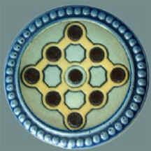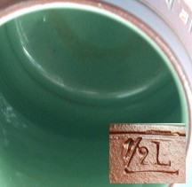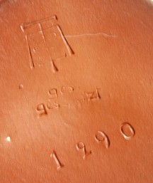 The inside of the stein has a greenish or turquoise glaze. Iron in the material could cause the glaze to be a soft green, but that copper or chrome was probably used for this rich green color. The lid is inscribed Unserem lieben "Tupp" gewidmet vom Kegelklub "Fröhliche Gesichter," which roughly translates to "Our dear "Tupp" dedicated from the Kegel Club "happy faces." The mark on the bottom of the stein is one of the two marks you will find on their terra sigillata steins. The other mark is a plain "T" with the "S" intertwined with the "T." Although I could not find a specific reference to the use of these two marks, I believe they were specifically designed for the terra sigillata steins. If anyone has either of these two marks on a stein other than terra sigillata, please let us know. The other Dümler and Breiden marks are shown below. Like last month's Rosskopf & Gerz stein, this one is also marked on the bottom with "ges. geschutzt," which means registered design, on two lines. In this instance, however, it is in lower case letters rather than upper case letters. The mold number of this stein is 1290. My recent review of 295 stein auction catalogs, approximately 115,000 steins, revealed only 31 listings of Dümler and Breiden terra sigillata steins. Two molds had multiple listings and five listings did not identify a mold number. The mold numbers included 116, 838, 953, 972, 980 (four listings), 1033, 1181 (11 listings), 1202, 1215, 1284, 1384, 1524 and 1614. Earlier catalogs included some steins that appeared to be Dümler and Breiden terra sigillata steins, but the mark may not have been known at the time to identify them as such and I could not verify that the steins were terra sigillata due to the photos being black and white. The book in reference 3 lists an additional four molds: 939, 981, 1032 and 1103. These 19 or so terra sigillata steins would make a nice display. I am not aware of any other manufacturer of this era that made terra sigillata steins. It is not so unusual to find so few of these steins however, since this is a more difficult material with which to work. |