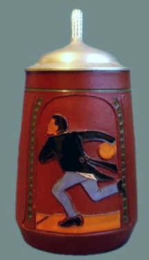 still think it would have been displayed at the 1893 Exposition. With the death of Peter in 1907, Albert took over managing the firm along with Peter's widow. Production of Jugendstil steins began around this time. While Paul Dümler, Peter's son, designed the terra sigillata steins, Albert no doubt had a say in selecting terra sigillata, a very smooth, lustrous coating of clay which resembles a glaze, usually red and virtually waterproof. According to The Encyclopedia Britannica, the Latin term literally means wares made of clay impressed with designs, while another source translates it as sealed earth. Perhaps his choice of material was influenced by the fact that Albert, his daughter Paula and his father share a common trait - they all had red hair. I furnished a photo of this stein to a ceramic instructor to get his comments. He had not encountered it before and thought it was an interesting piece. He opined that it appeared to be just a refined clay slip without being polished. The Roman terra sigillata wares have a high gloss finish because the terra sigillata is polished to help seal the pottery. Albert retired from the firm in 1913, but had to help run the company during World War I. When his sons returned from the war (Peter's son Paul died in World War I), Albert had to take over the management of his uncle's firm, Simon Peter Gerz I. The inflation of the 1920s virtually wiped Albert out. In a letter to his daughter Paula, he stated he could not even afford a beer. Herr Breiden died in 1926 at the age of 65. The firm of Dümler and Breiden, however, survived until sometime after its 100th anniversary in 1983. This stein has three scenes: the front shows a bowler approaching the line