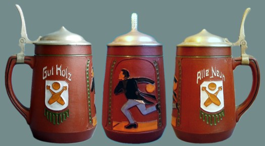 This Dümler and Breiden stein features a bowling scene. Quick now, how many pins went down with that strike, nine or ten? If you said ten, you are not living in the past. Back in the late 19th century, particularly in Germany, it was a game of nine pins. As a matter of fact, that was the game Rip Van Winkle saw the ghosts of Henry Hudson's crew playing before his twenty-year nap. The inset lids of Mettlach bowling steins usually feature the layout of nine pins in the shape of a baseball diamond (see example, below right). The early Germans used to carry a pin, called a Kegel, for defensive purposes. The monks used it in nine pin as the head-pin target and encouraged the parishioners to knock down the devil. That is how we got the words kegler and kegling. Some eBay listings call these scenes skittle, but that is the English game and these are definitely German steins and the German game. We started out playing nine pins in the United States too, but betting on the sport caused the nine pin game to be declared illegal. Luckily, they also had lawyers back then and one supposedly came up with a loophole to the law by just adding one pin. And that was how we got today's ten pin game. Golf steins lead the sports-themed steins as far as premium pricing goes, thanks to well-heeled golfers (they will buy anything golf related). Sports Illustrated ran an article on a golf-related stein collection in their November 8, 1954 issue (that was pre-swimsuit issues, but it still did not make the cover). Bowling steins, on the other hand, are one of the least expensive of the sports-themed steins. Bowling is a bare-bones sport; you can rent the shoes and the ball, and the other equipment is provided by the bowling alley. I couldn't even find a bowling song for this article, but you will have to keep guessing why I selected the song I did or keep reading the article. While bowlers are well known beer drinkers, walk into any bowling alley and you will see bowlers knocking them down faster than the pins can fall. They prefer their beer straight out of the can or bottle. Nevertheless, the International Bowling Museum and Hall of Fame in St. Louis, Missouri (across from Busch Stadium) features some Mettlach steins in their display. I know about bowling as I joined a bowling league right after I graduated