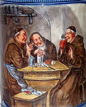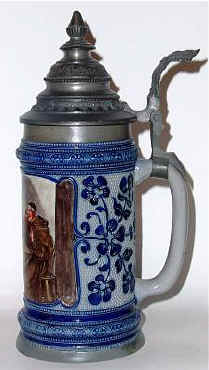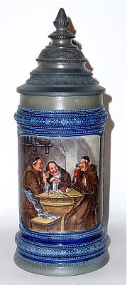 Hauber & Reuther Stein article and photos by SCI Master Steinologist John McGregor The August Saeltzer workshop purchased blanks from a number of factories, two of them were the Regensburg and Freising factories. However, both of those factories produced enameled wares of their own, Regensburg a few, Freising many. The 1/2 liter, #184, Hauber & Reuther, stoneware stein shown in this article was produced in Freising and enameled sometime between 1882 and 1886. The painting on this piece is a variation of an Eduard Grutzner painting. Eduard Grutzner was born at Gross Carlowitz, Silsia, May 26